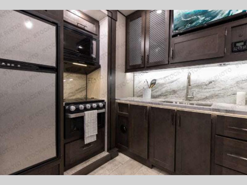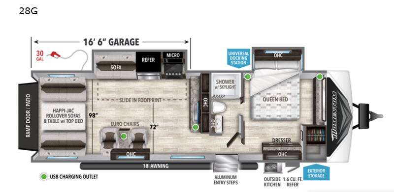 The Momentum G-Class includes an Insulation Package with a heated and enclosed underbelly, suspended tanks, high-capacity furnace, cabinet-mounted heat ducts, and moisture barrier flooring—so you can camp in comfort no matter the season. A 30-gallon fuel station with interior and exterior gauges makes refueling your toys simple and convenient.