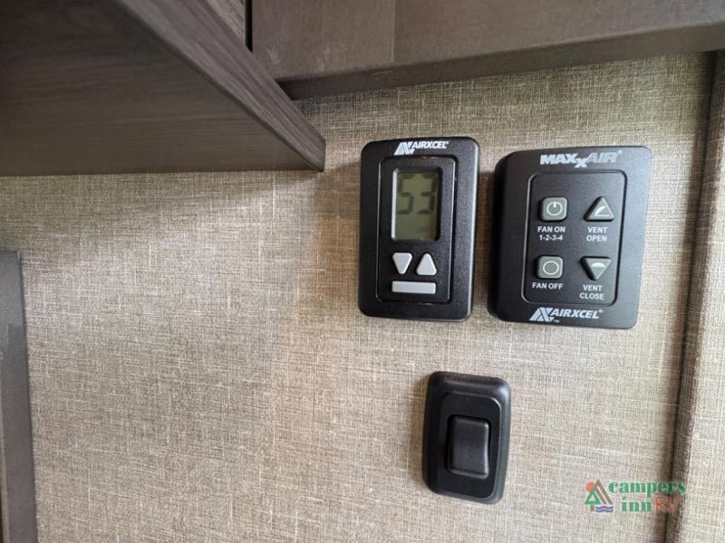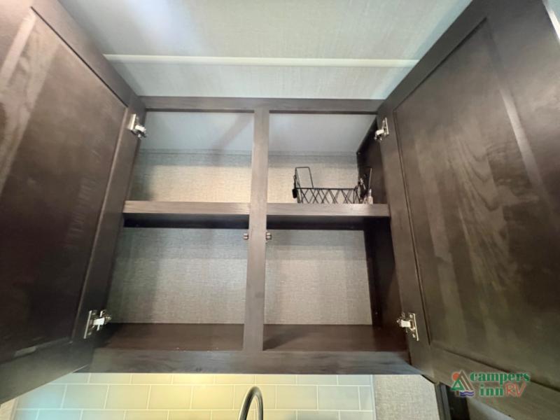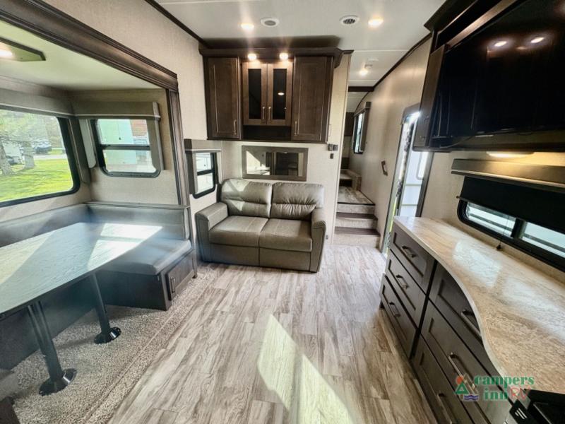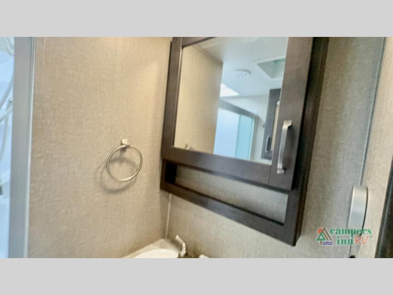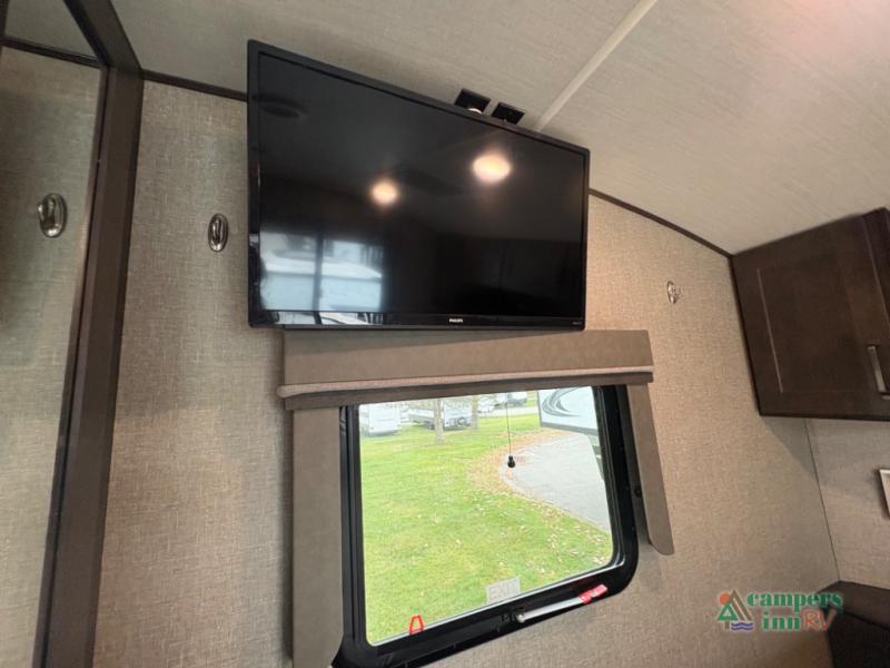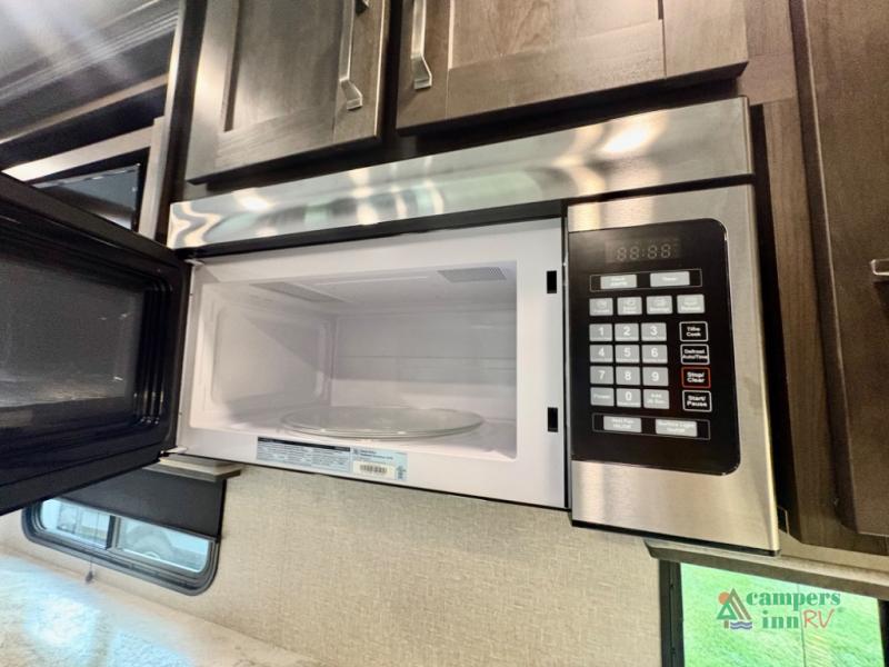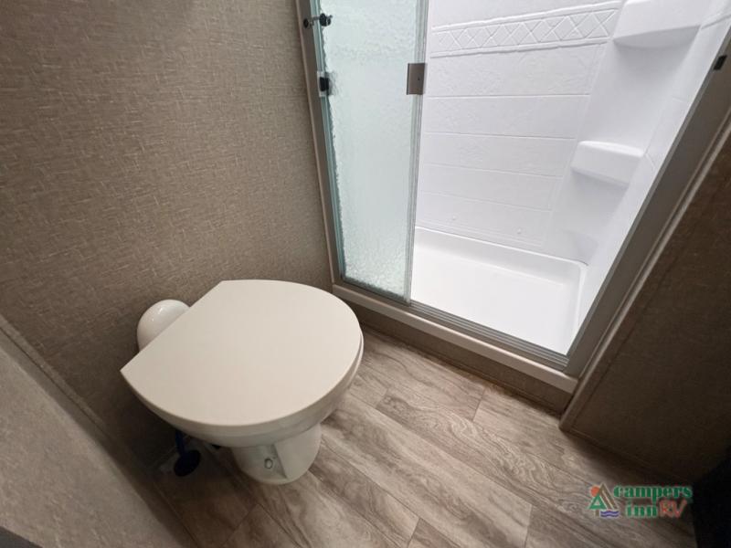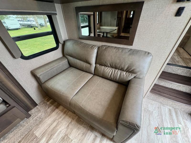 If you're looking for an efficient bunkhouse, then you need this Reflection 150 Series fifth wheel! The exterior rear storage compartment lets you bring all of your favorite camping gear, and the thoughtful storage near the bunks not only has a wardrobe closet but also a clever step storage area. You will enjoy eating your meals and playing card games at the U-shaped dinette, or you can switch it out for the optional 78" theater seating instead. Grab your favorite beverage from the 8-cu. ft. refrigerator and relax on the tri-fold sofa while you watch your favorite movie on the 40" LED TV. The full bathroom has a shower with a skylight for natural lighting as you get ready each morning, and is also has a linen closet to keep your towels close by.
