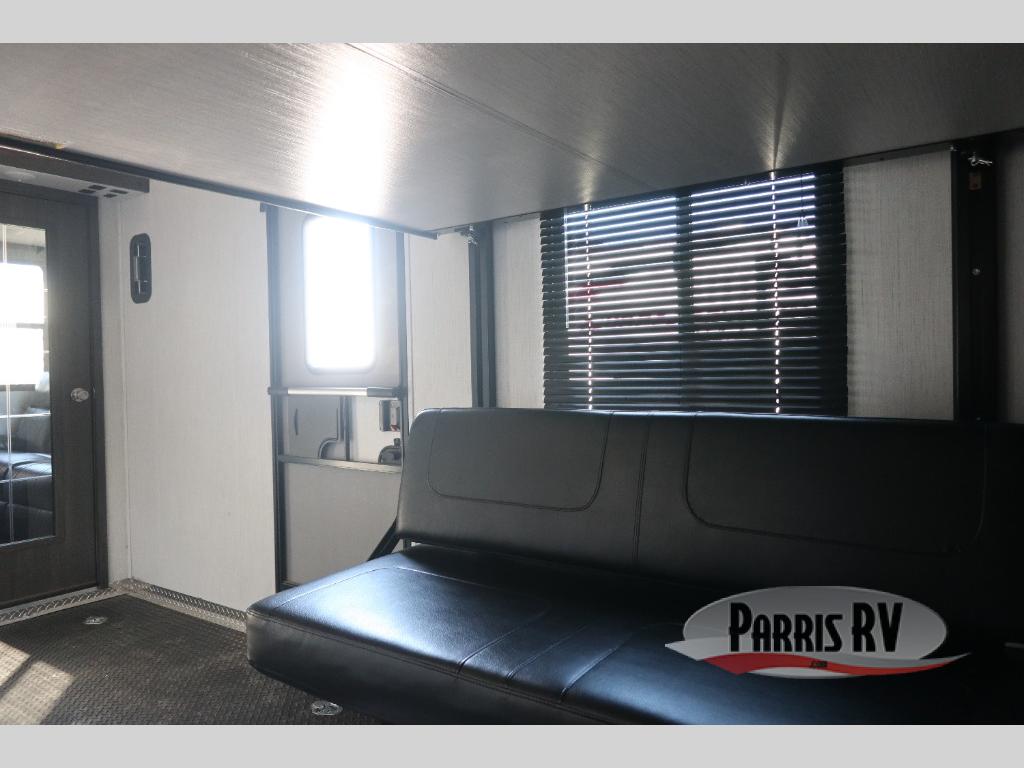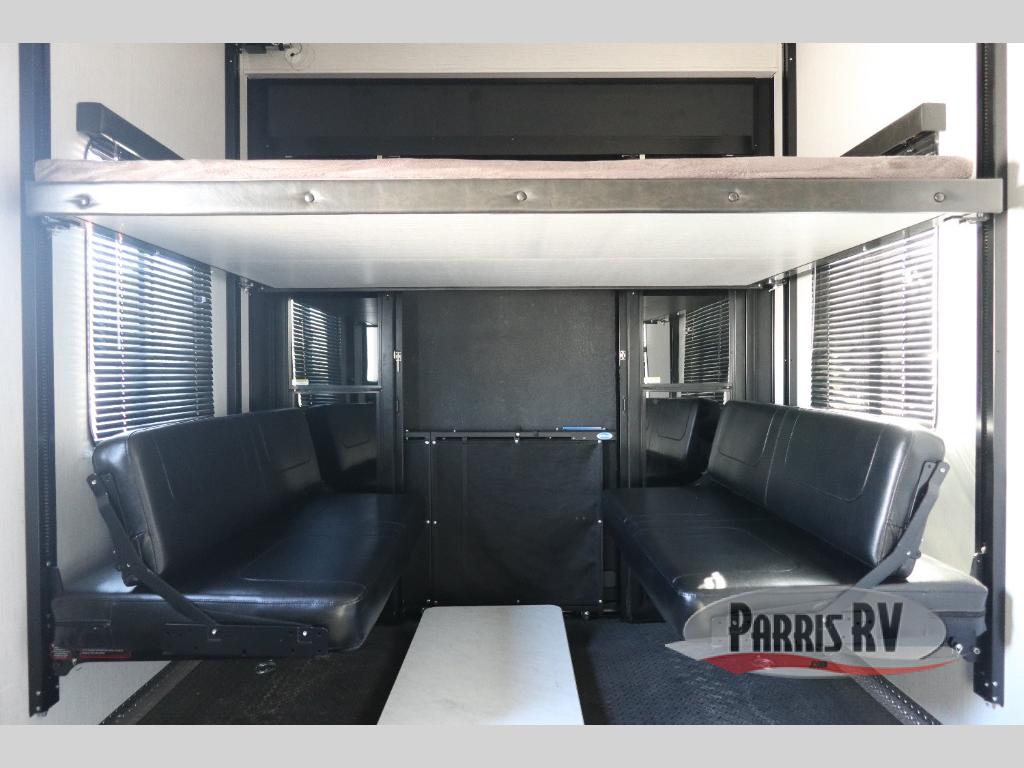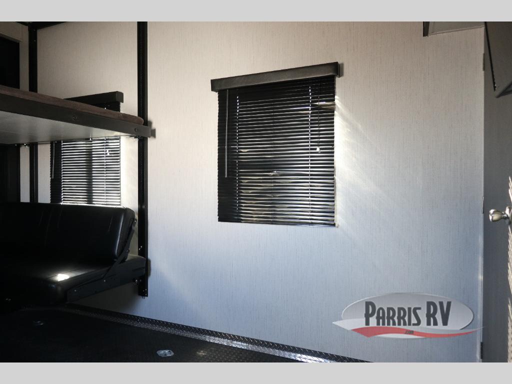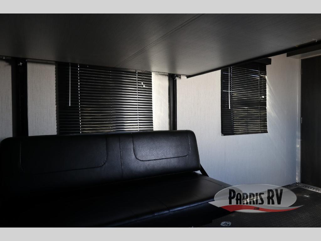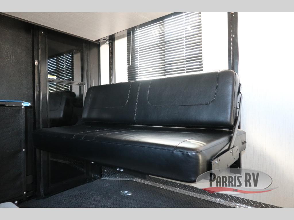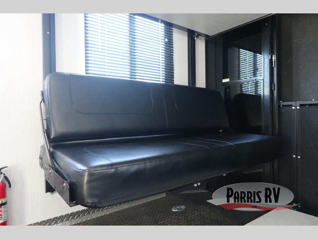 If you like to keep the dirt out of the main living area, this toy hauler gives you a separate garage with a side man door, a half bath for those quick breaks, and a power queen bed above opposing sofas with a dinette so the dirty shoes and all can stay in this area. After hitting the trails, you can get cleaned up in the full bathroom with a seated shower, make a meal in the kitchen and serve everyone from the counter peninsula then relax on the sofa. The dual slides in this space offer everyone enough room to stretch out and recoup from the ride. And don't forget about your oasis in the front private bedroom with plenty of storage for your clothing.