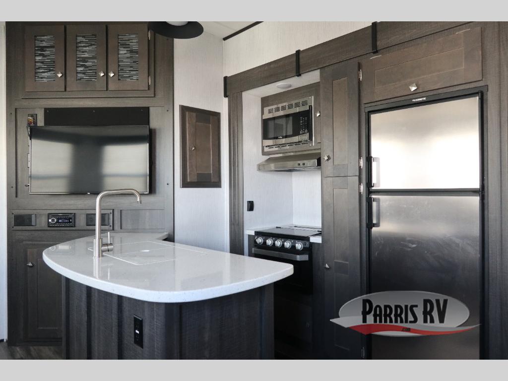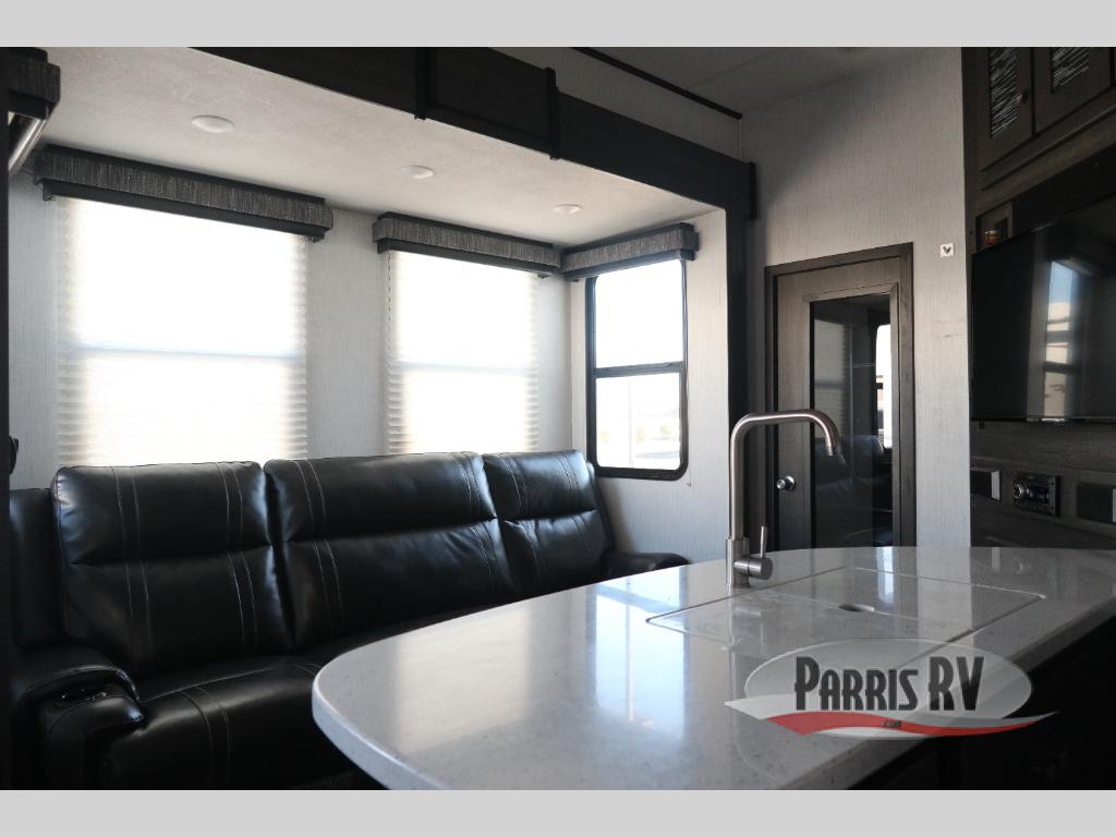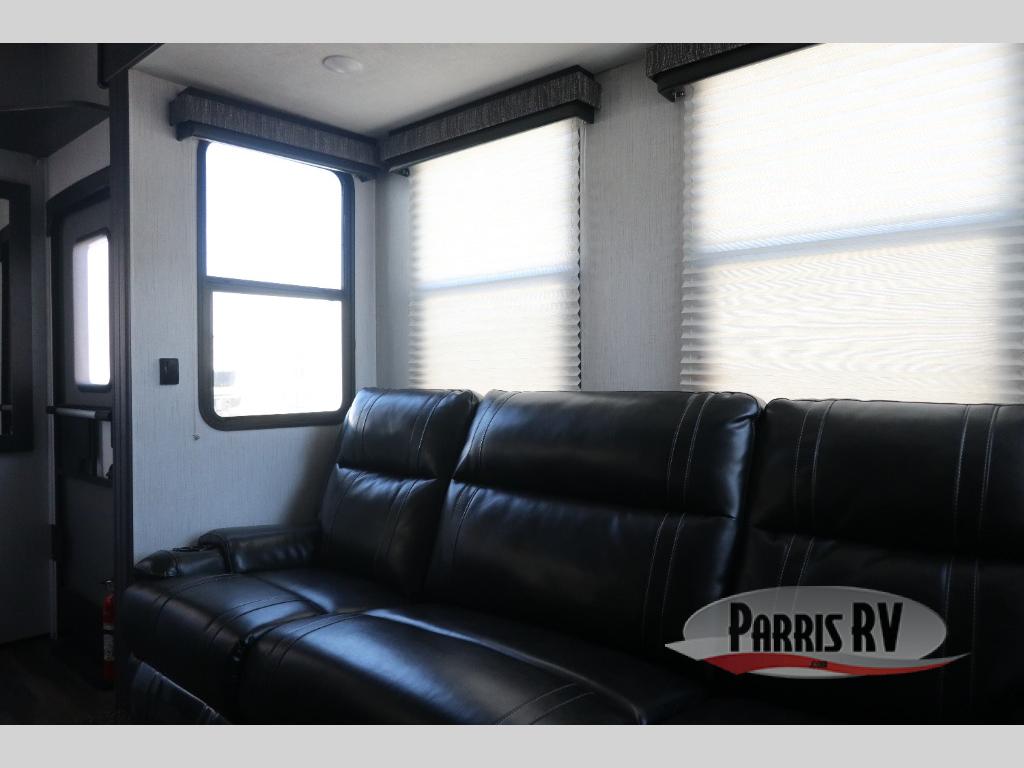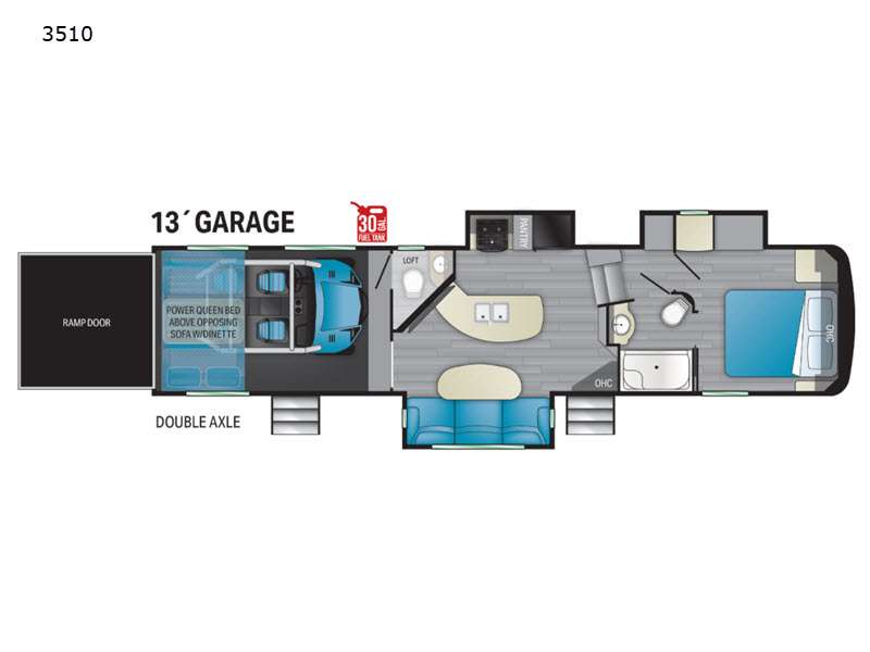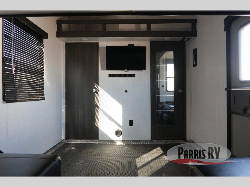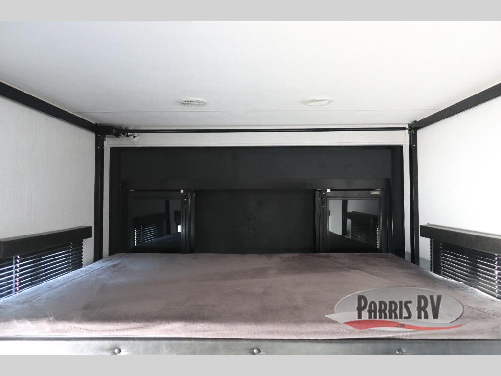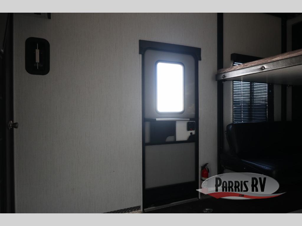 If you like to keep the dirt out of the main living area, this toy hauler gives you a separate garage with a side man door, a half bath for those quick breaks, and a power queen bed above opposing sofas with a dinette so the dirty shoes and all can stay in this area. After hitting the trails, you can get cleaned up in the full bathroom with a seated shower, make a meal in the kitchen and serve everyone from the counter peninsula then relax on the sofa. The dual slides in this space offer everyone enough room to stretch out and recoup from the ride. And don't forget about your oasis in the front private bedroom with plenty of storage for your clothing.