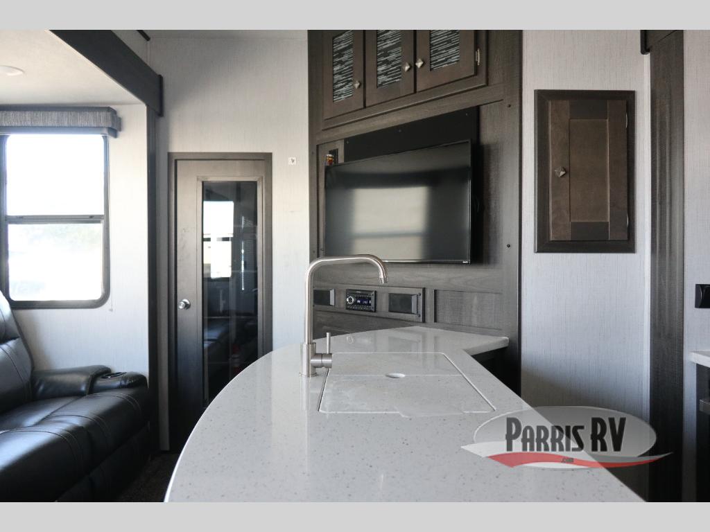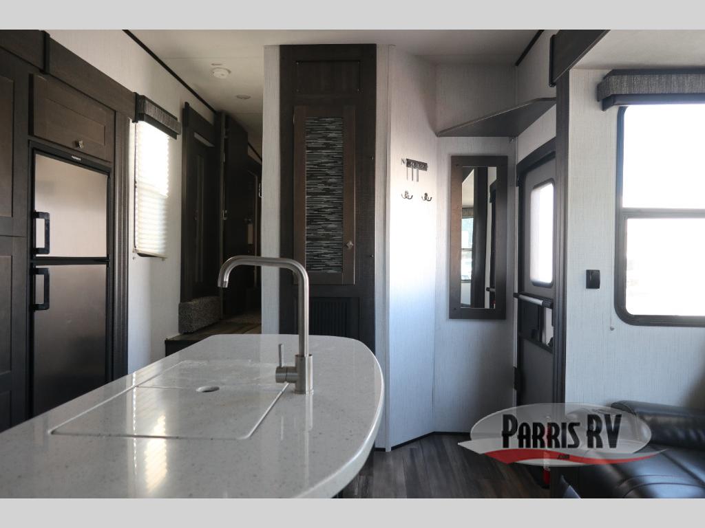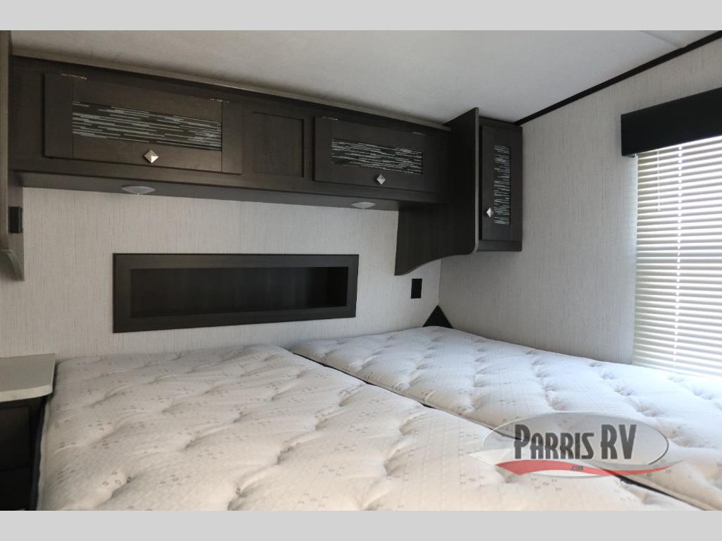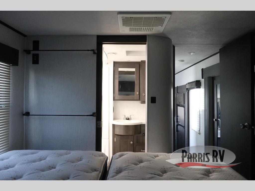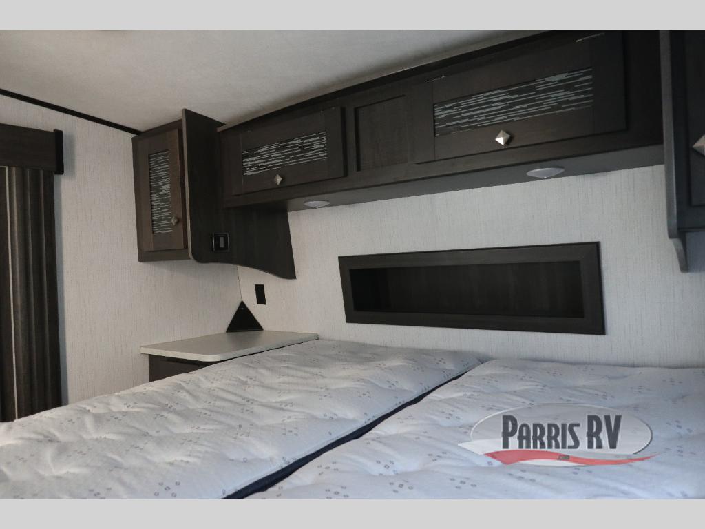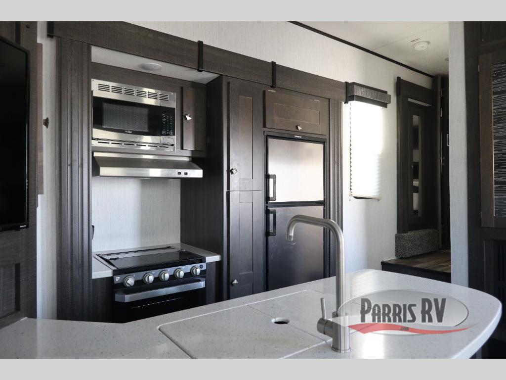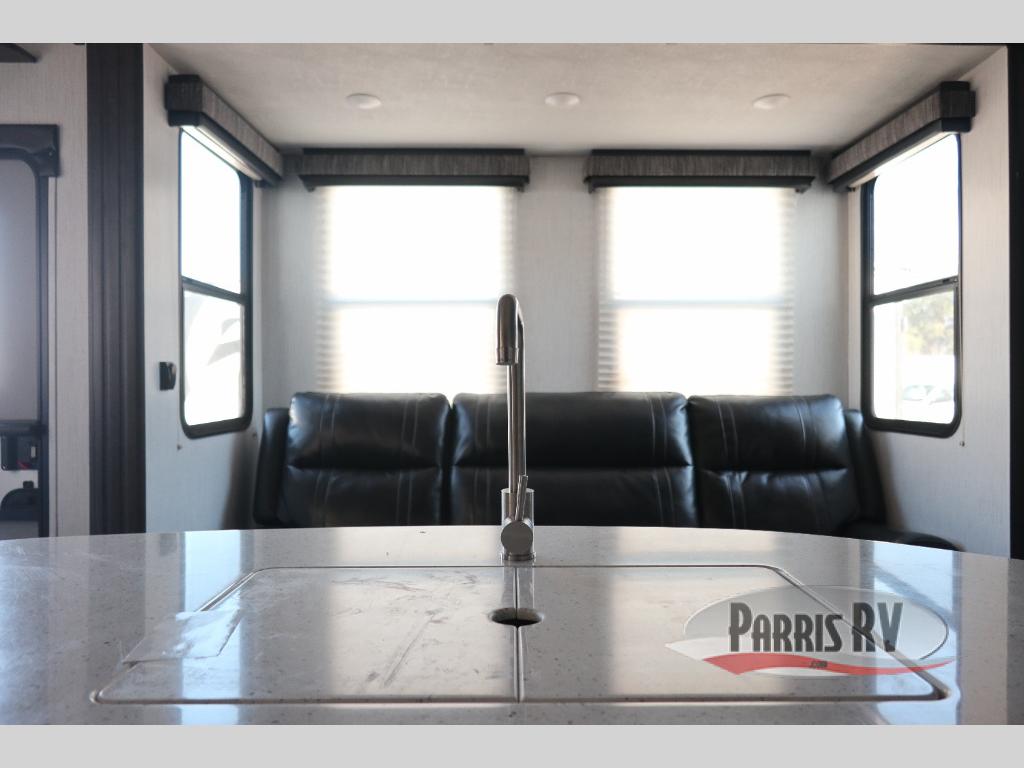 If you like to keep the dirt out of the main living area, this toy hauler gives you a separate garage with a side man door, a half bath for those quick breaks, and a power queen bed above opposing sofas with a dinette so the dirty shoes and all can stay in this area. After hitting the trails, you can get cleaned up in the full bathroom with a seated shower, make a meal in the kitchen and serve everyone from the counter peninsula then relax on the sofa. The dual slides in this space offer everyone enough room to stretch out and recoup from the ride. And don't forget about your oasis in the front private bedroom with plenty of storage for your clothing.