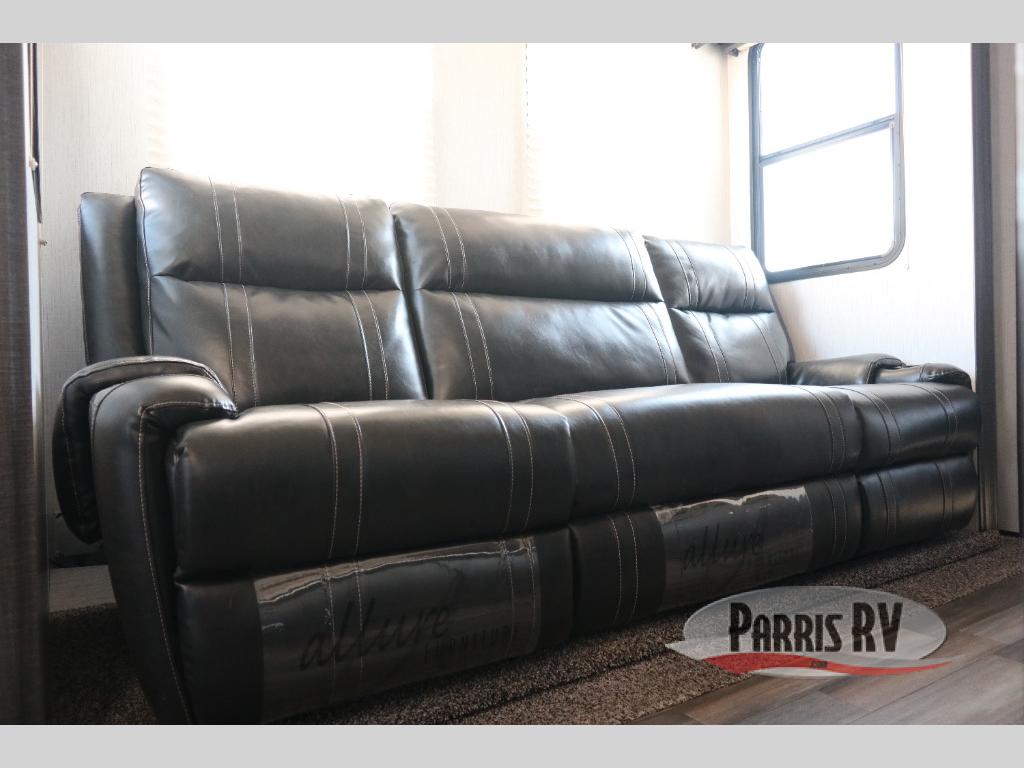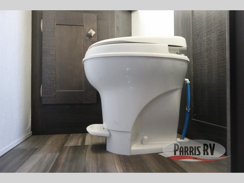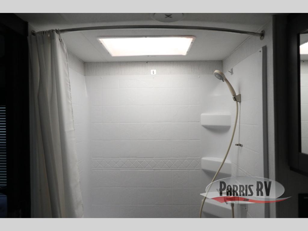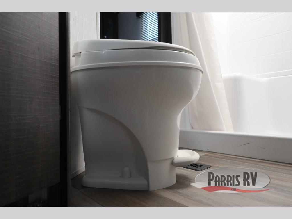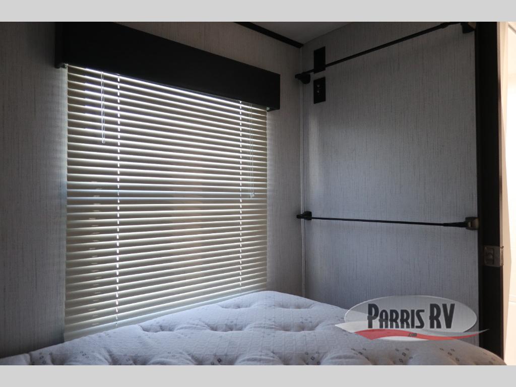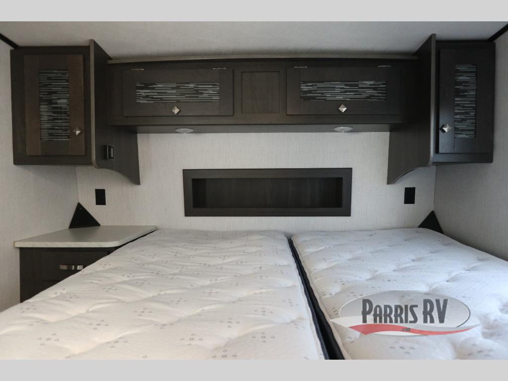 If you like to keep the dirt out of the main living area, this toy hauler gives you a separate garage with a side man door, a half bath for those quick breaks, and a power queen bed above opposing sofas with a dinette so the dirty shoes and all can stay in this area. After hitting the trails, you can get cleaned up in the full bathroom with a seated shower, make a meal in the kitchen and serve everyone from the counter peninsula then relax on the sofa. The dual slides in this space offer everyone enough room to stretch out and recoup from the ride. And don't forget about your oasis in the front private bedroom with plenty of storage for your clothing.