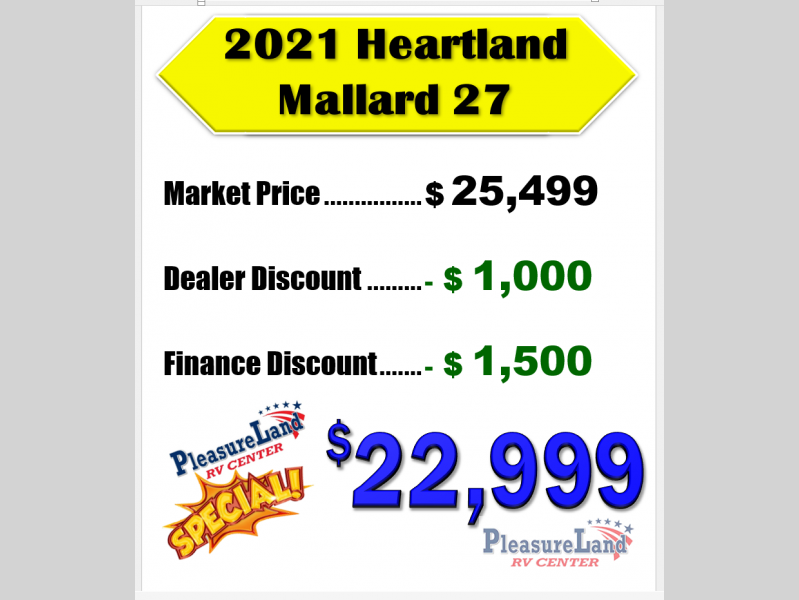 The Heartland Mallard travel trailer is quite impressive with its innovative features! The flip-down exterior steps and glow-in-the-dark graphics are some of the top exterior features, and the all-new Master Chef kitchen with Infinity edge countertops and stainless steel undermount sink is one of the top interior features that will make camping life easier. The forced-air heated and enclosed underbelly is a great feature that protects your trailer from the outside weather, and the Wide Traxx axle system, leaf spring suspension, E-Z lube hubs, and aluminum rims all work together to give you a great ride to the campsite. The Mallard has also been prepped for a solar panel, Wi-Fi, and a back-up camera, and it also has a cable-ready hook-up.