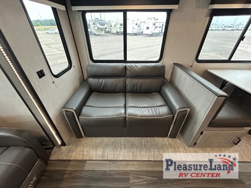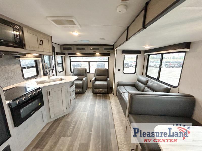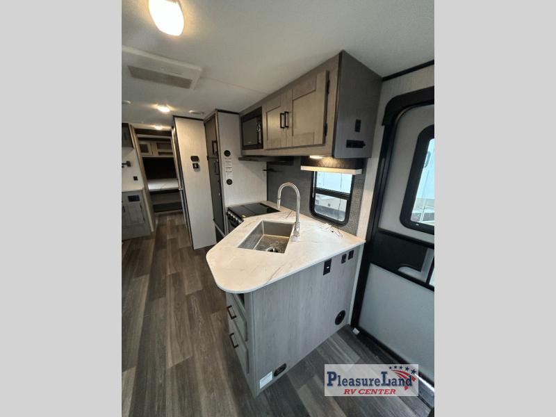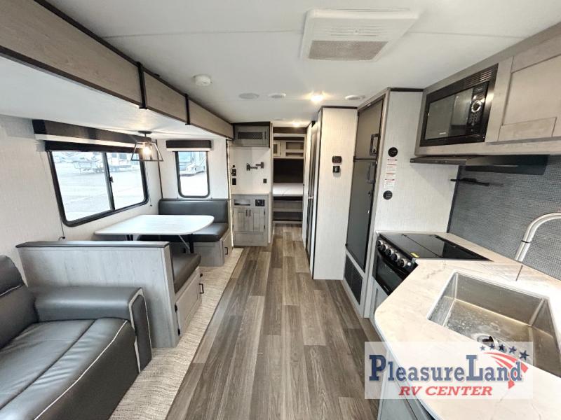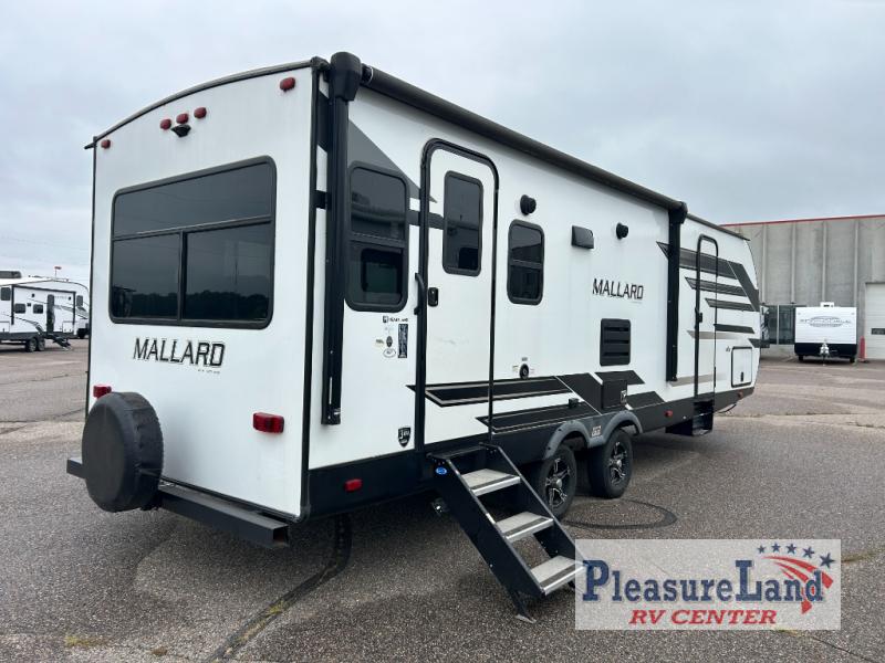 You won't ever want to leave the campground once you start camping in this dual-entry Mallard travel trailer! There is plenty of seating for everyone between the rear set of lounge chairs and the sofa next to the booth dinette, both of which can transform into extra sleeping space when needed. You will have no problem whipping up your favorite meals inside the complete kitchen, and the 8-cu. ft. double-door refrigerator is big enough to keep all of your perishables cold and fresh. What better way to wind down your night than to take a nice, hot shower in the full bathroom before heading into the front private bedroom to enjoy a good night's rest on the king bed.
