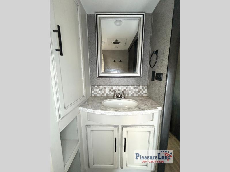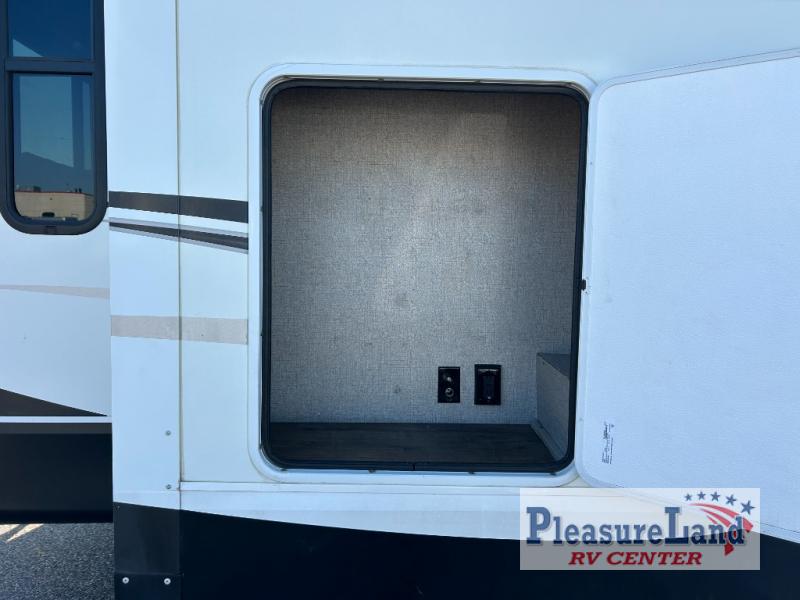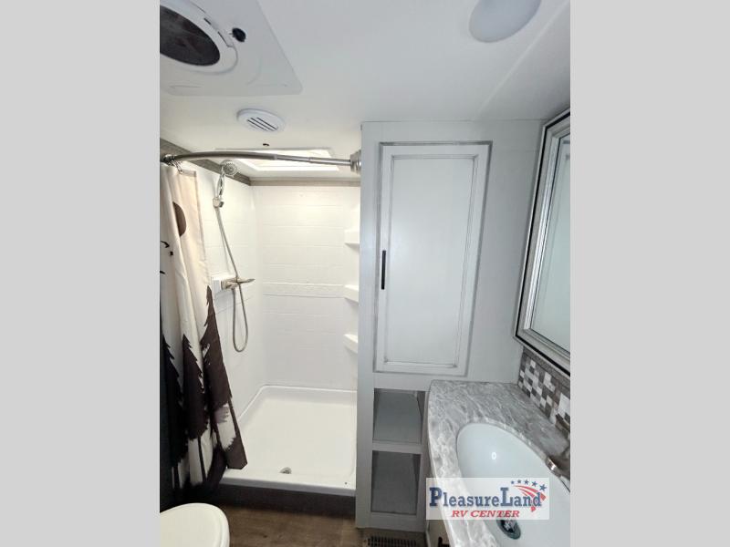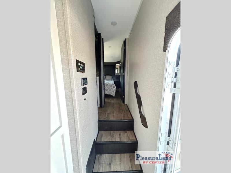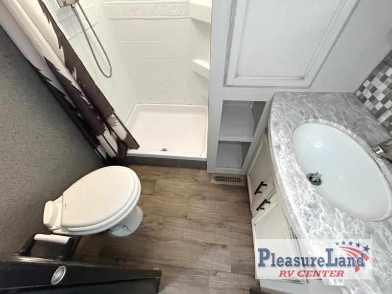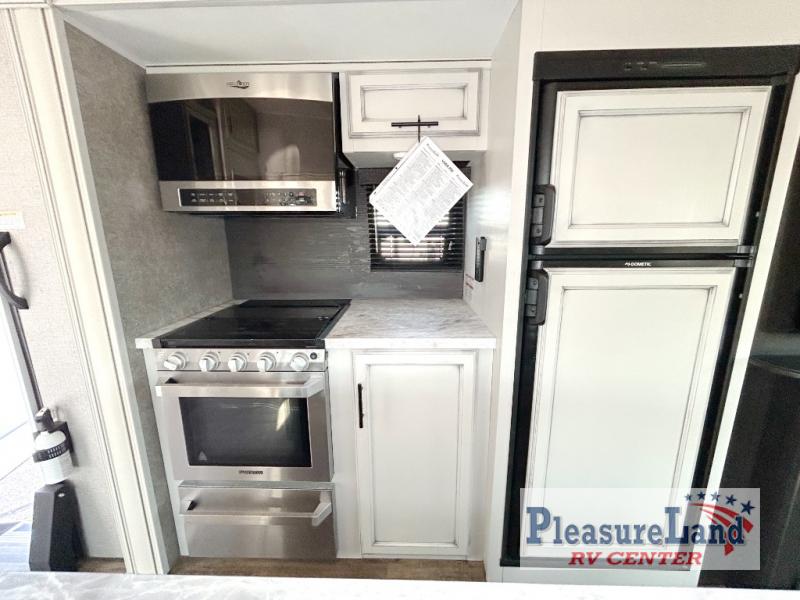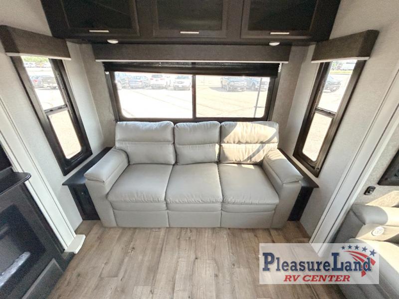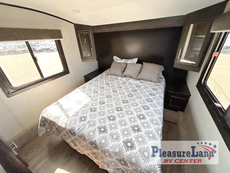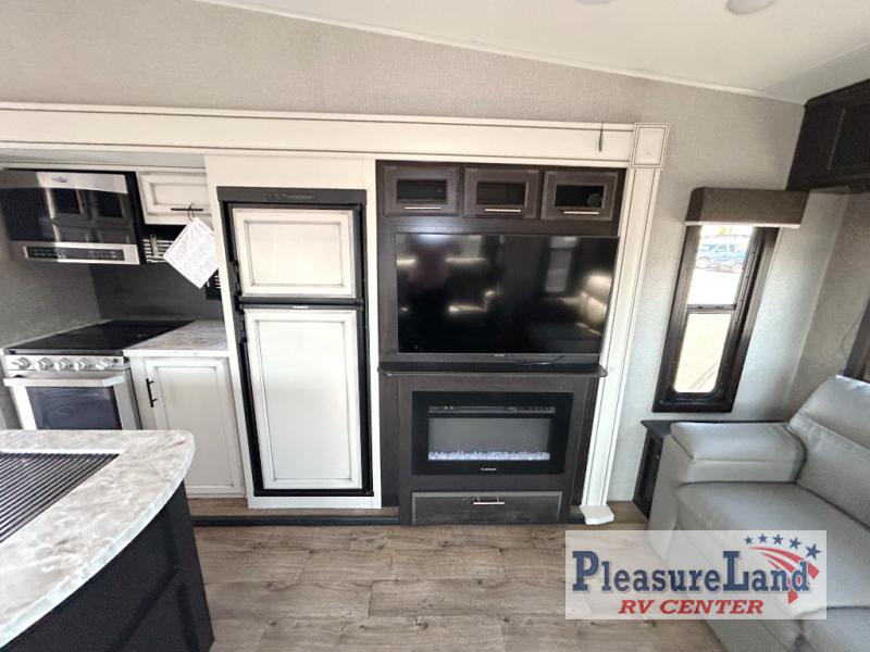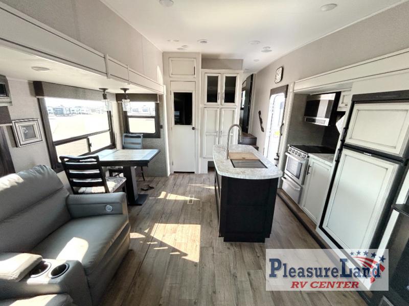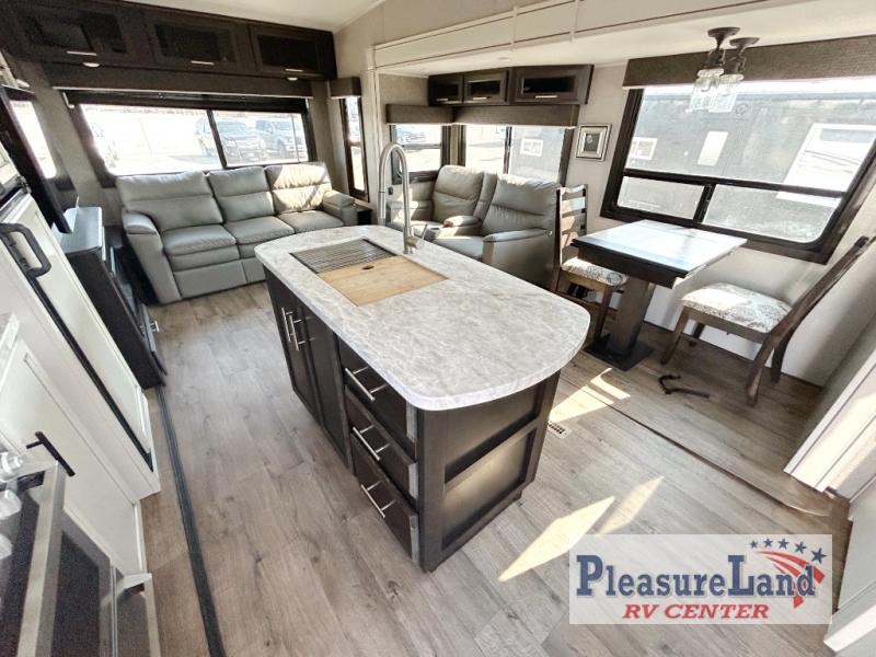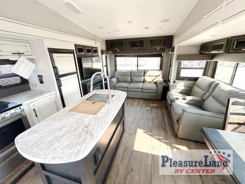 With each Jayco Eagle HT fifth wheel or travel trailer, you will enjoy all-season camping with the Climate Shield zero-degree tested weather protection that includes a fully enclosed and heated underbelly. The industry-exclusive HELIX Cooling System with a 15,000 BTU "Whisper Quiet" A/C system provides a quieter and more efficient system for your comfort. These models include the JAYCOMMAND Smart RV system powered by BMPRO which allows you to control your unit's functions right from your smartphone or tablet. Inside, you will enjoy the residential queen Serta mattress with under-bed storage, the bathroom skylight to allow natural light in, the stainless steel kitchen sink, and dual USB charging ports in the kitchen and bedroom so that you can keep your gadgets charged and ready to go.