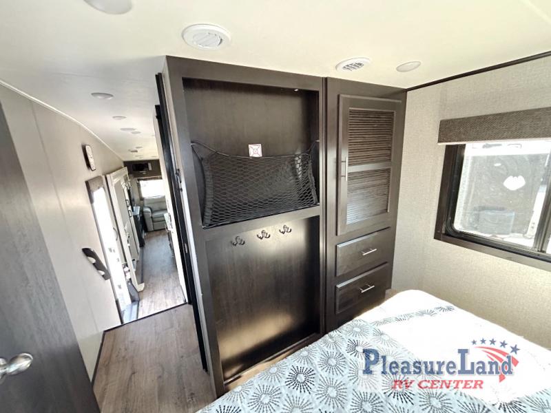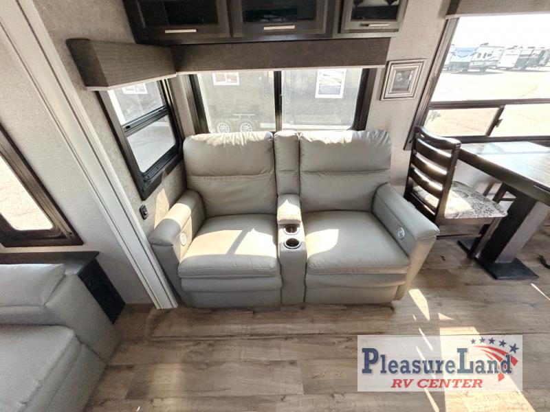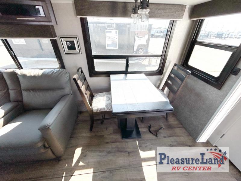 Enjoy your own walk-around queen bed in privacy in the front bedroom where you can rest or sleep on your own bedding anywhere you set up camp with this Eagle HT fifth wheel. If you invite overnight guests, they can sleep on the tri-fold sofa. You will love having dual slide outs in the main living and kitchen area allowing you to easily move about to get to the kitchen island to prepare meals. You can relax on all the furniture and watch the LED HDTV, or you can head outside and sit under the electric awning. You might even like to add a few options such as a 10-cu. ft. refrigerator, a booth dinette, and/or a bench seat in place of two chairs at the free-standing table.