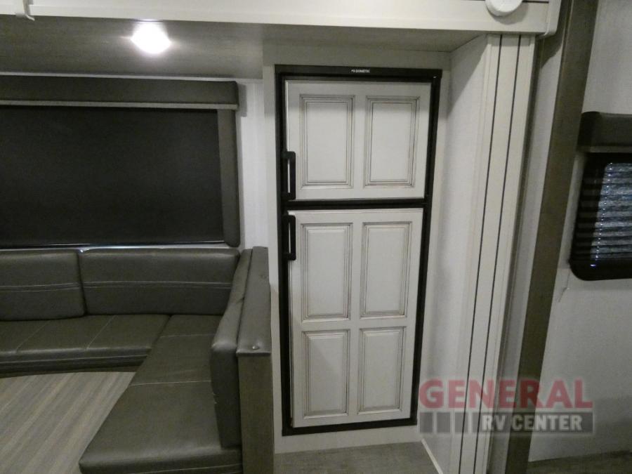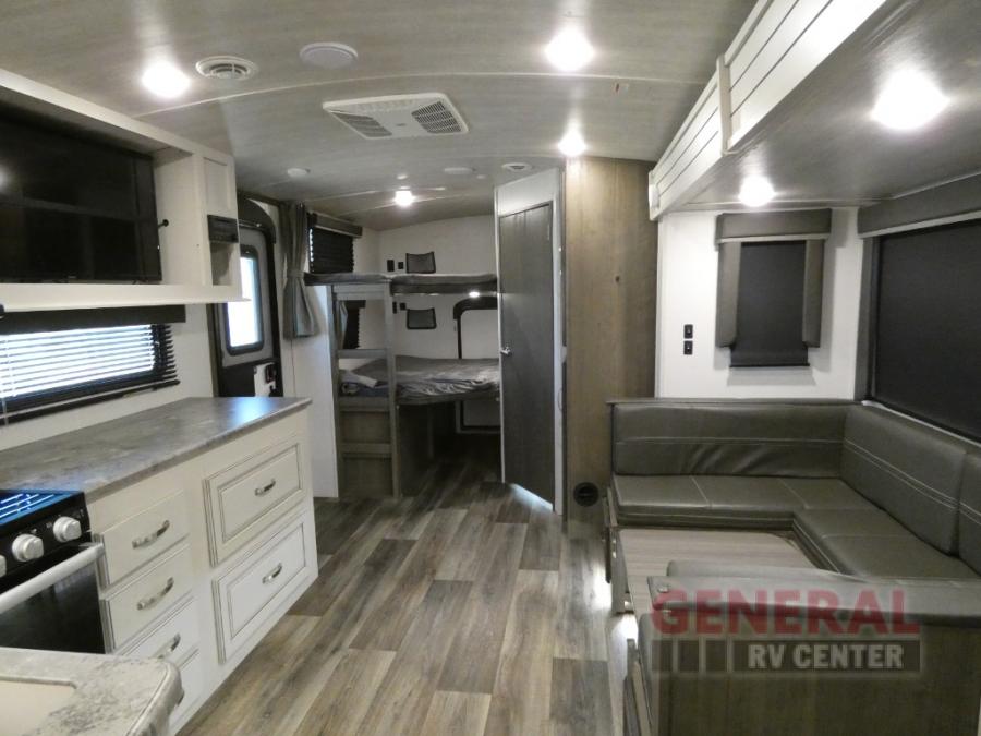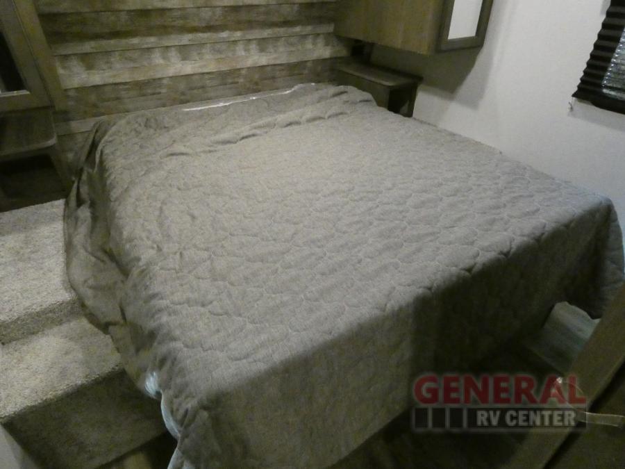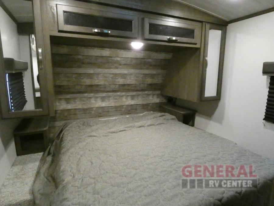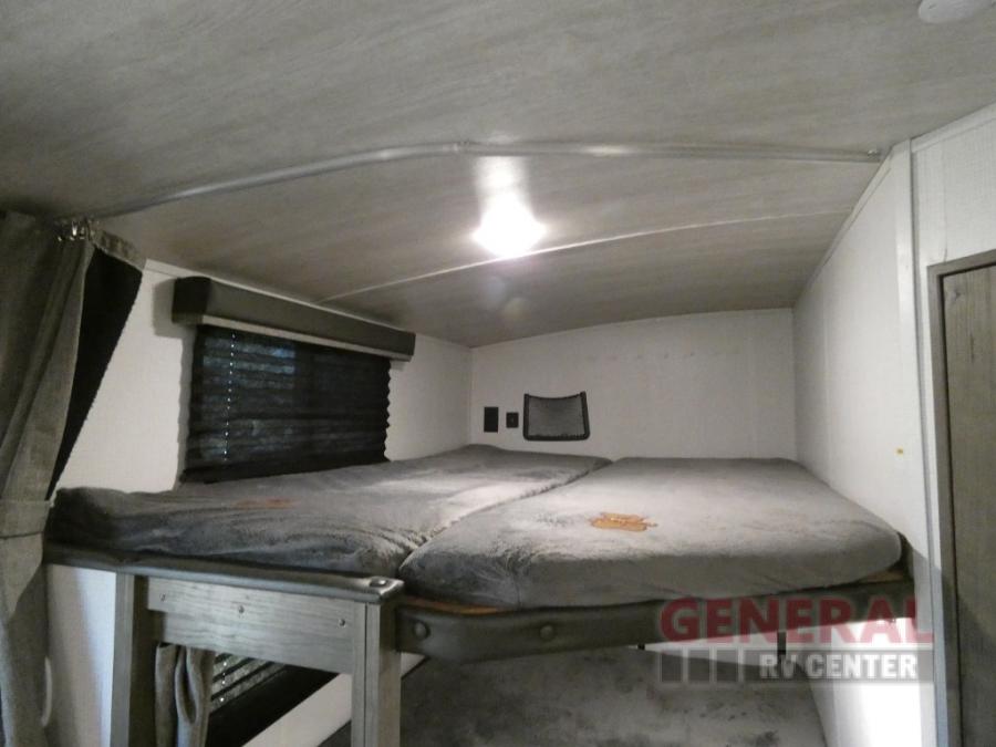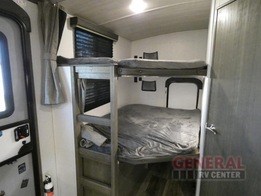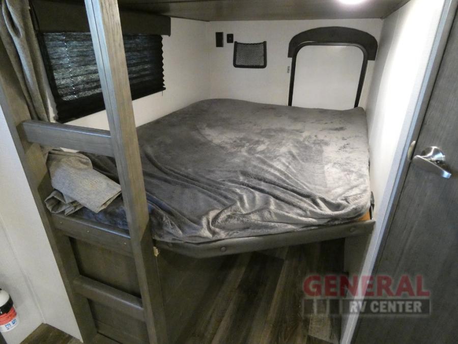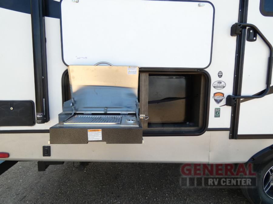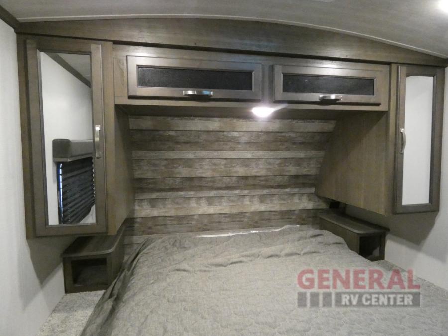 Look no further because this Cougar Half-Ton travel trailer has what you want! With a rear cargo door and pass-through storage, you can bring along loads of gear, and you can also bring along lots of food because the indoor and outdoor kitchen will provide you with plenty of tools to cook it up. At the end of a long and tiresome day, you will want a place to relax, and that is when the king-size bed shines best. This bed is hidden away in a private bedroom so that you can recover peacefully. Your kids can also take a break back on the double-size bunks, and the lower bunk is able to flip up for storage.