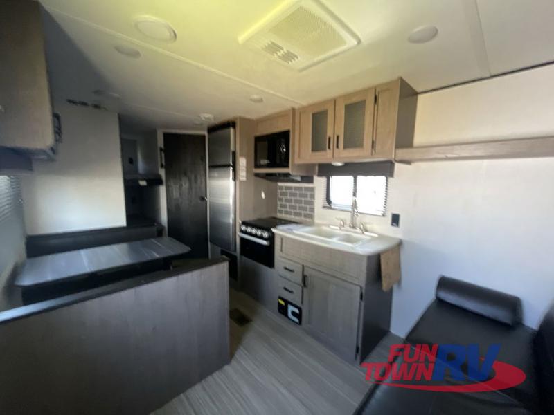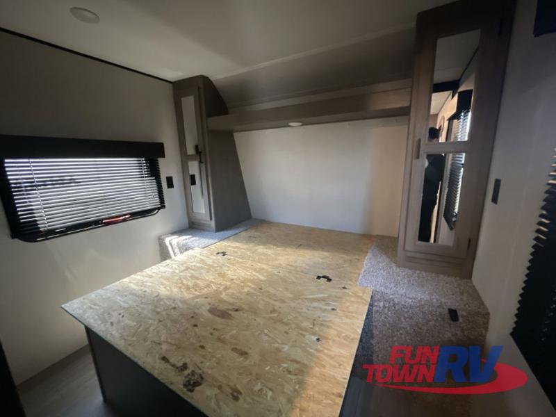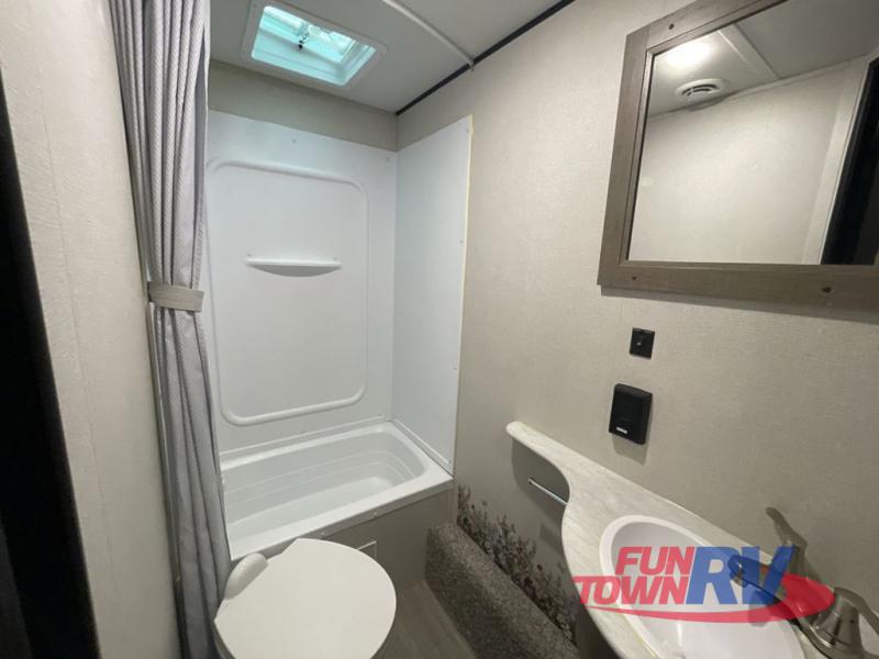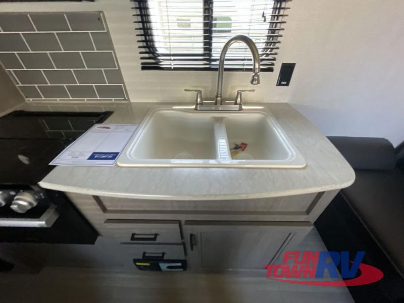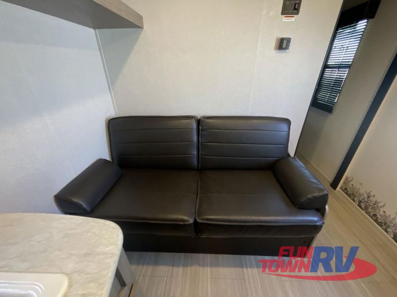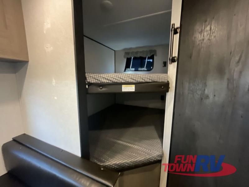 With sleeping for nine, this Keystone Hideout is the perfect travel trailer for a larger family to enjoy. This model offers a full bathroom where you can easily and privately get ready for the day. Sleeping space for everyone can be found with the set of double-size bunks, a queen-size bed in the private bedroom, a booth dinette, and a sofa. Throughout this model you will find shelf space, as well as overhead cabinets for all of your extra camping items, and the two bedroom closets will come in handy for holding onto those extra sweaters and hiking boots. In the evening if the weather is nice, you will want to sit out under the lighted adjustable power awning and enjoy the scenic sunset together!