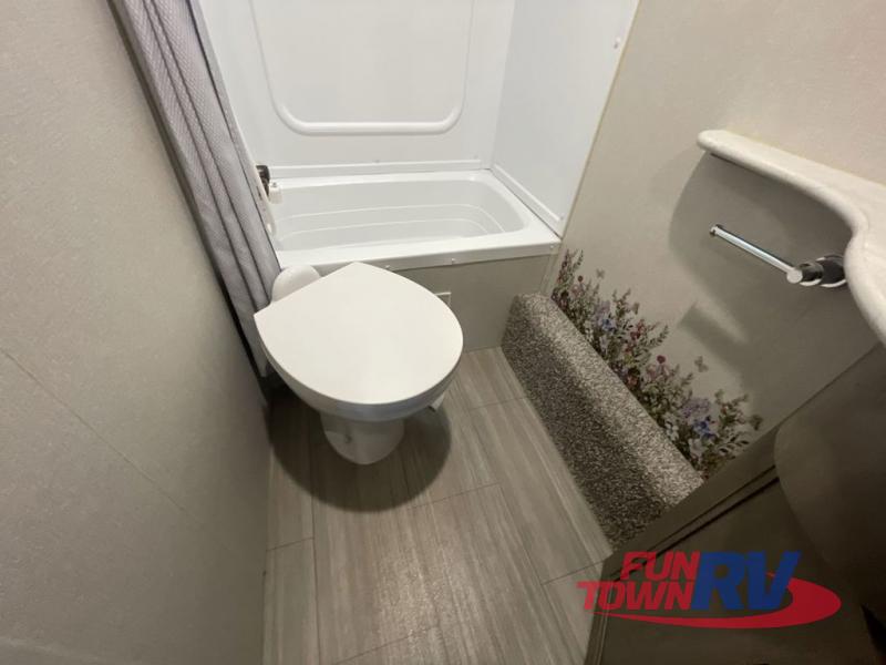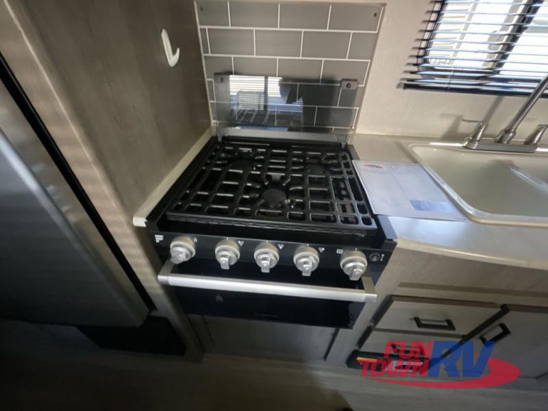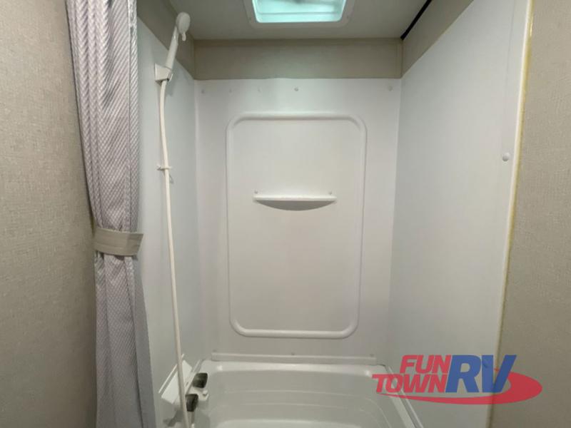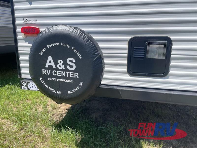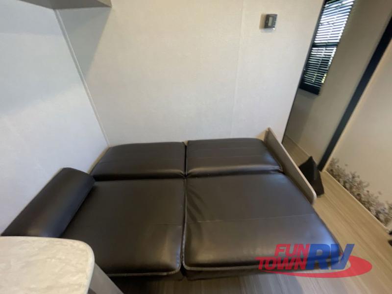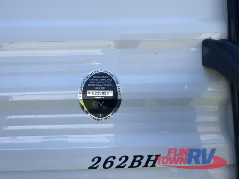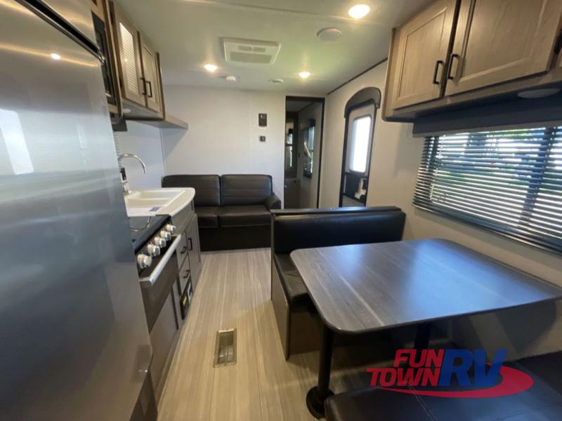With sleeping for nine, this Keystone Hideout is the perfect travel trailer for a larger family to enjoy. This model offers a full bathroom where you can easily and privately get ready for the day. Sleeping space for everyone can be found with the set of double-size bunks, a queen-size bed in the private bedroom, a booth dinette, and a sofa. Throughout this model you will find shelf space, as well as overhead cabinets for all of your extra camping items, and the two bedroom closets will come in handy for holding onto those extra sweaters and hiking boots. In the evening if the weather is nice, you will want to sit out under the lighted adjustable power awning and enjoy the scenic sunset together!