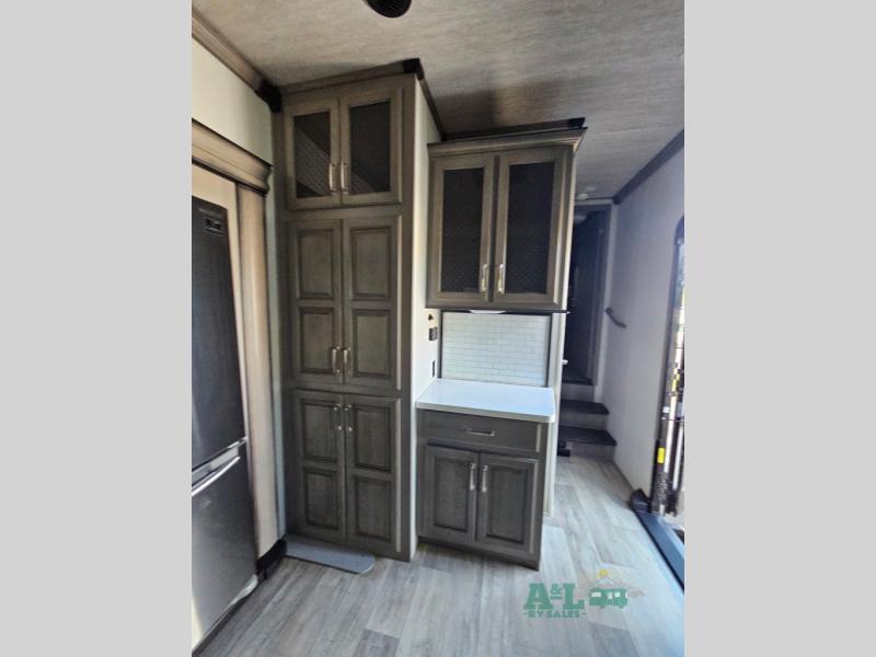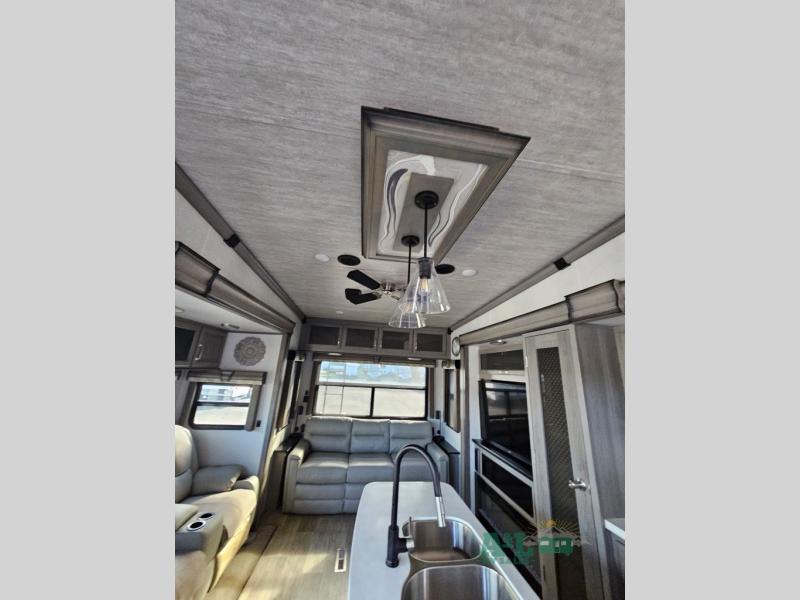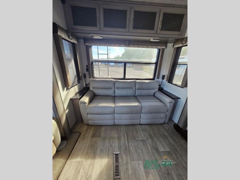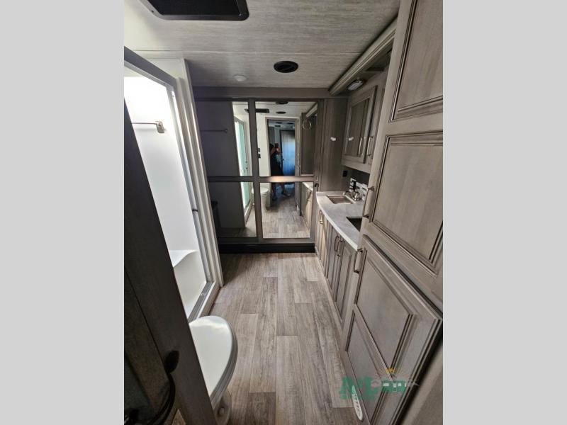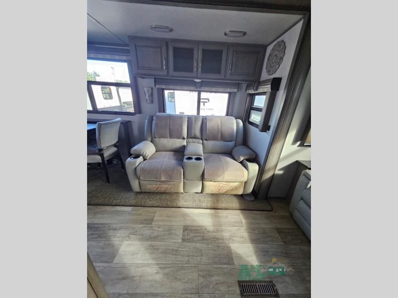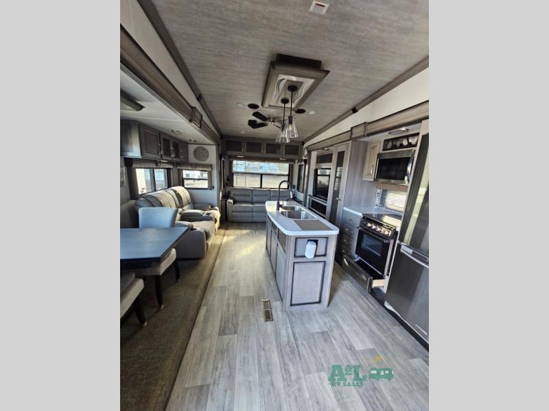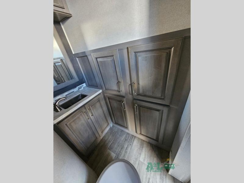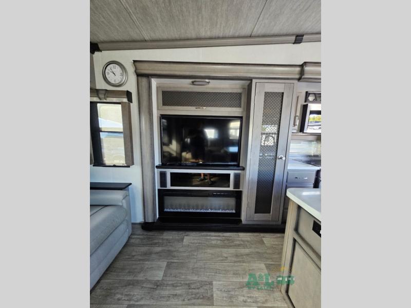You will constantly find new reasons to appreciate this luxurious and stunning Montana fifth wheel! The best feature of this unit is the huge master suite up at the front. A set of steps leads you up to the bedroom, and there is a barn door that separates the large full bathroom from the bedroom. Within this front bathroom is a full-width closet, a bench seat, a 48" x 30" shower, and a dual-sink vanity. You will feel so glamorous spending your mornings getting ready here. Back out in the main living area, there is a half bath so that your fellow travelers can also get ready in the morning, and they will find the hide-a-bed sofa to provide them with comfortable sleeping arrangements each night. Since the sofa is right next to the fireplace, it will provide everyone with a cozy place to sit down with a book and hot chocolate.