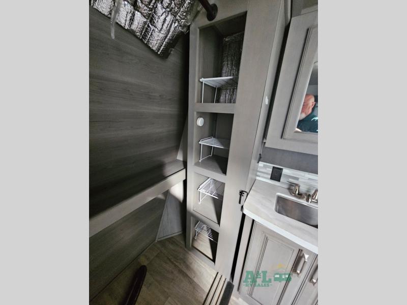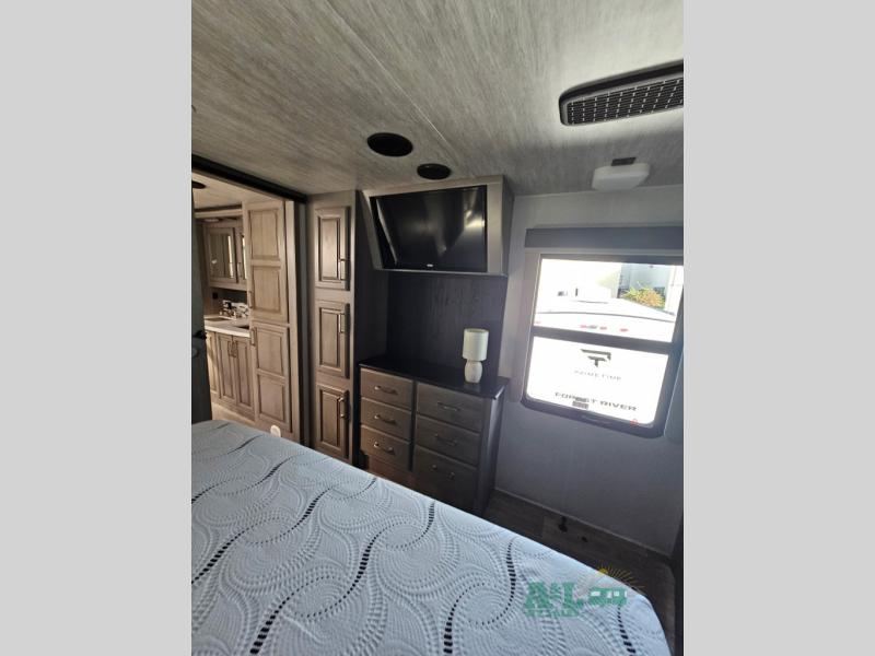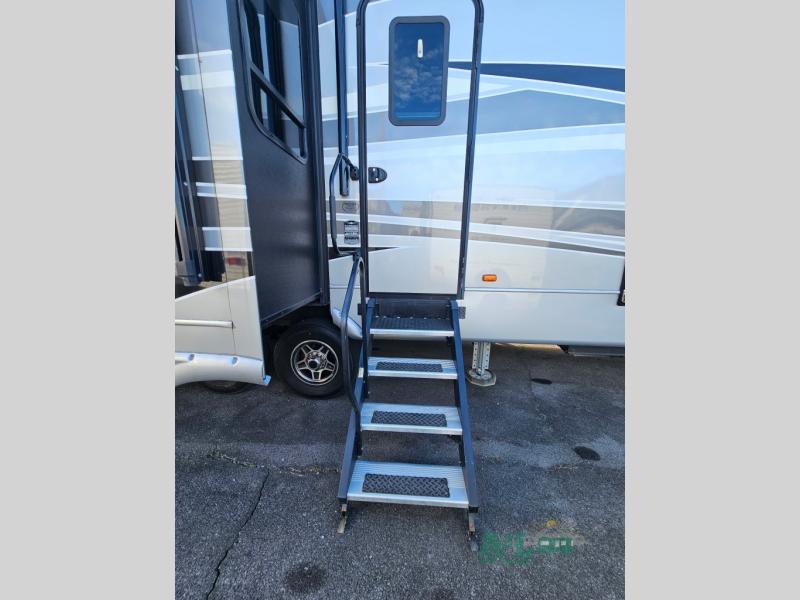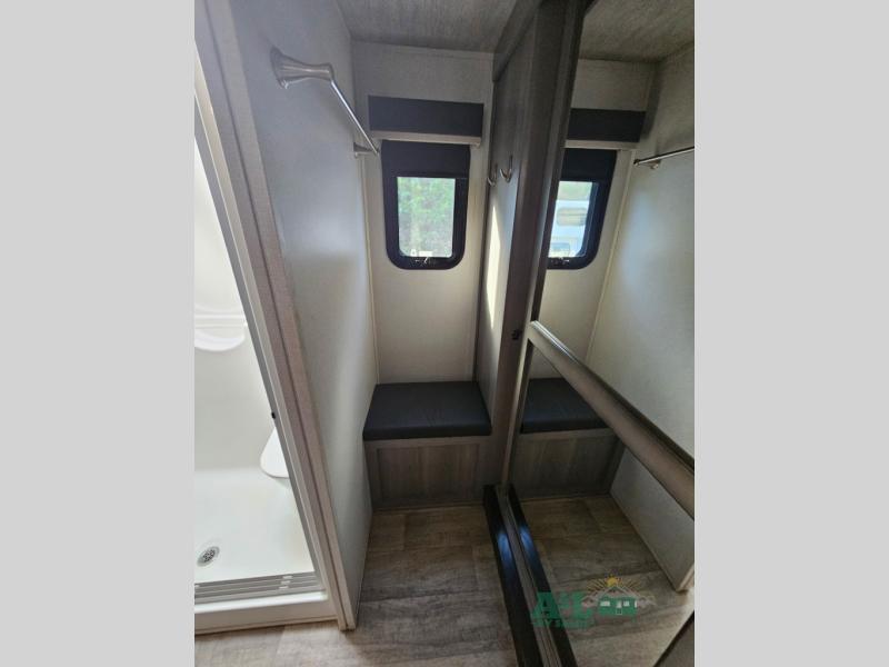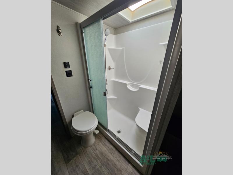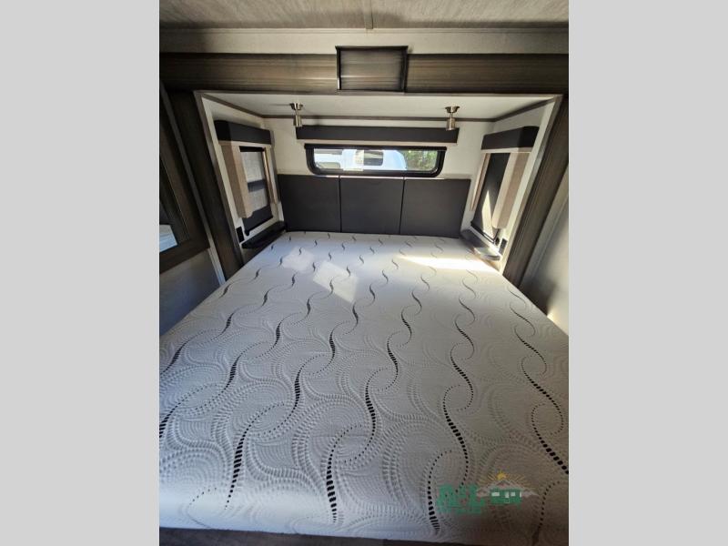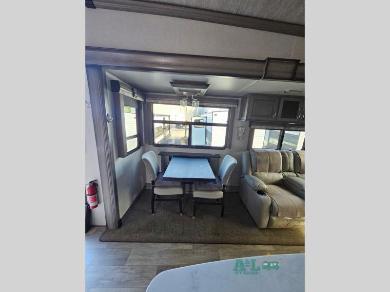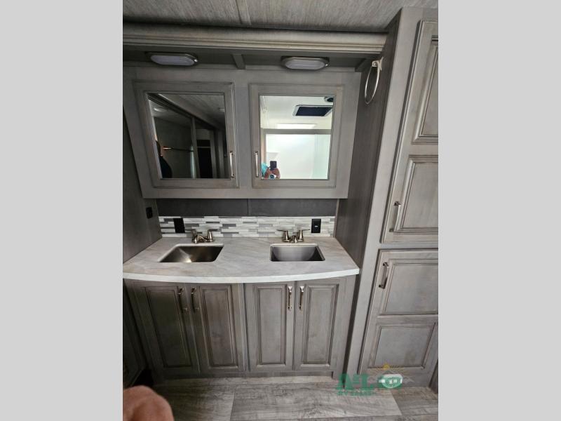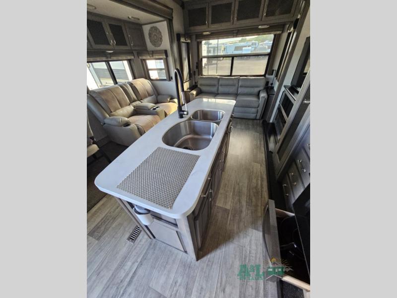 You will constantly find new reasons to appreciate this luxurious and stunning Montana fifth wheel! The best feature of this unit is the huge master suite up at the front. A set of steps leads you up to the bedroom, and there is a barn door that separates the large full bathroom from the bedroom. Within this front bathroom is a full-width closet, a bench seat, a 48" x 30" shower, and a dual-sink vanity. You will feel so glamorous spending your mornings getting ready here. Back out in the main living area, there is a half bath so that your fellow travelers can also get ready in the morning, and they will find the hide-a-bed sofa to provide them with comfortable sleeping arrangements each night. Since the sofa is right next to the fireplace, it will provide everyone with a cozy place to sit down with a book and hot chocolate.