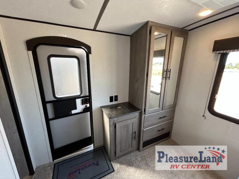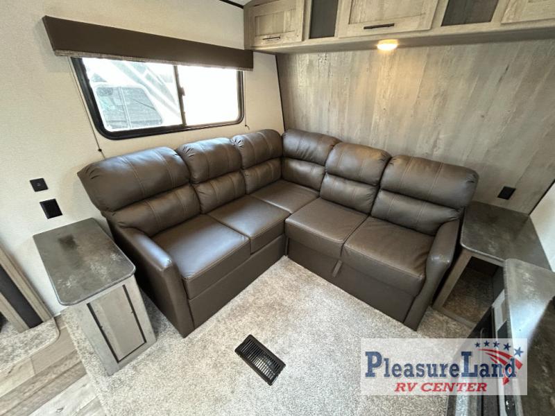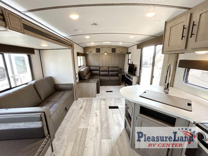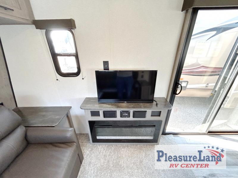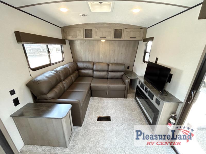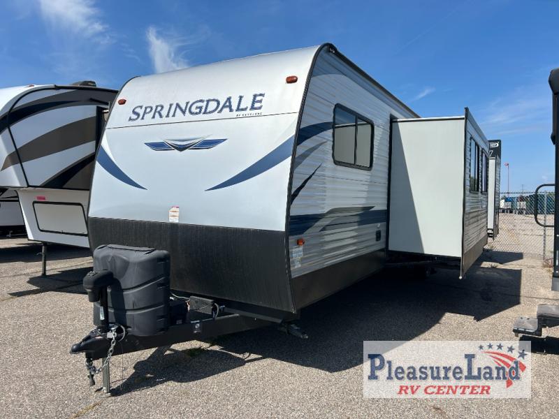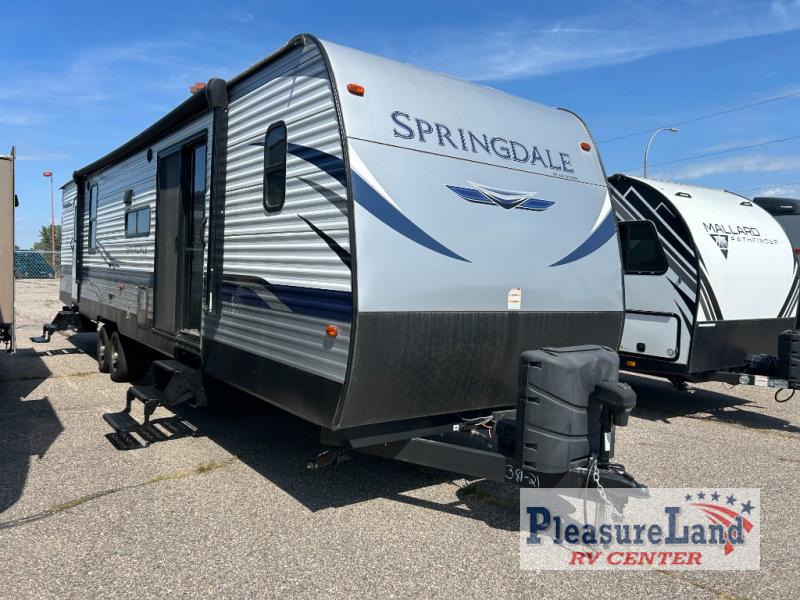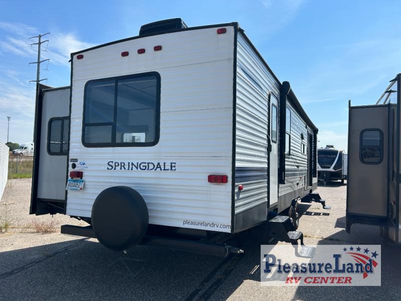 This spacious Keystone Springdale destination trailer allows you and your family or friends to escape to your favorite place be it the lake or the ranch. The front living area offers an L-shaped mega tri-fold sofa, an entertainment center, an LED TV and a fireplace making this area both cozy and comfortable. This is the perfect space to hang out and enjoy a conversation or a movie with family and friends. You will find more seating space in the slide out on the booth dinette and tri-fold sofa, both provide extra sleeping space as well. The kitchen offers all that you need to prepare and cook for your hungry crew for a weekend or longer. There is a large kitchen sink making cleaning up easy, a three-burner range for cooking your meals, and two pantries for dry good storage. And at night, you will have your own queen bed slide in the rear bedroom which offers storage and the second exterior entry for convenience.