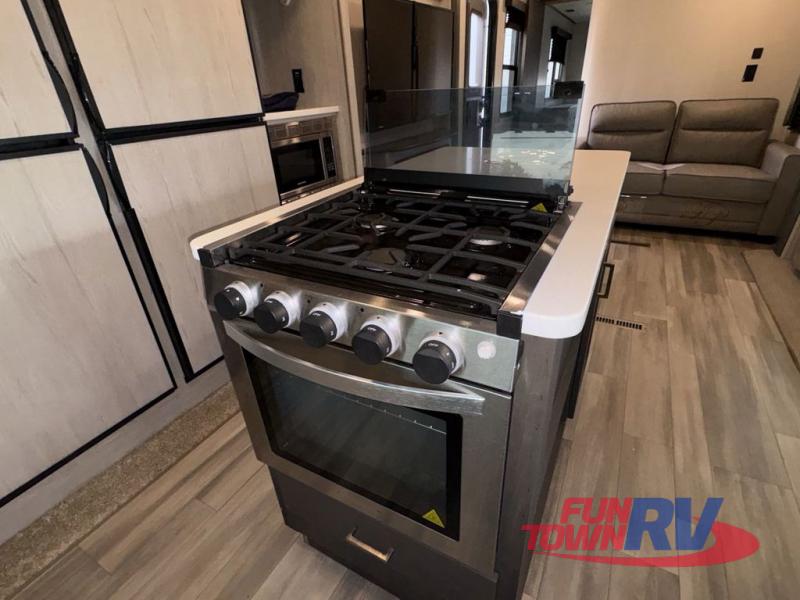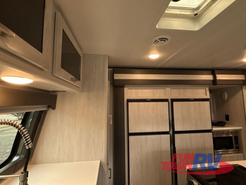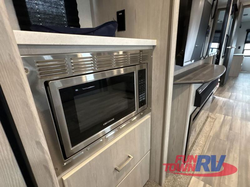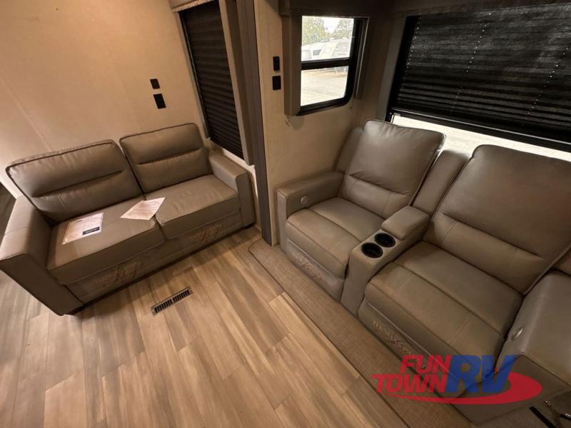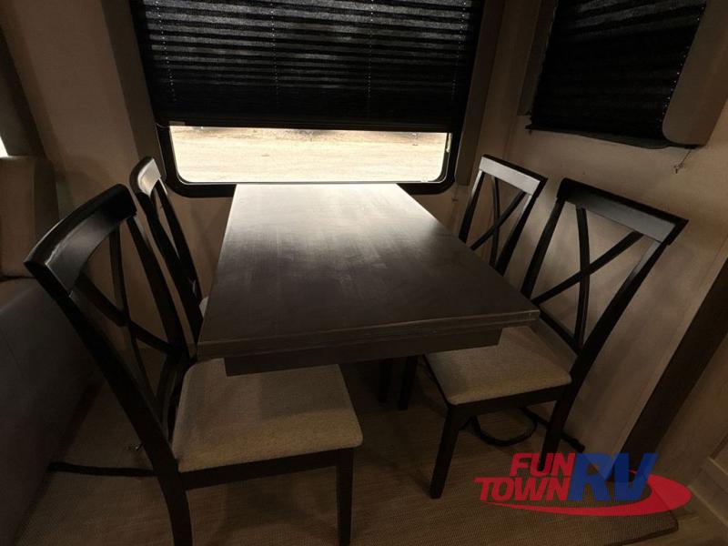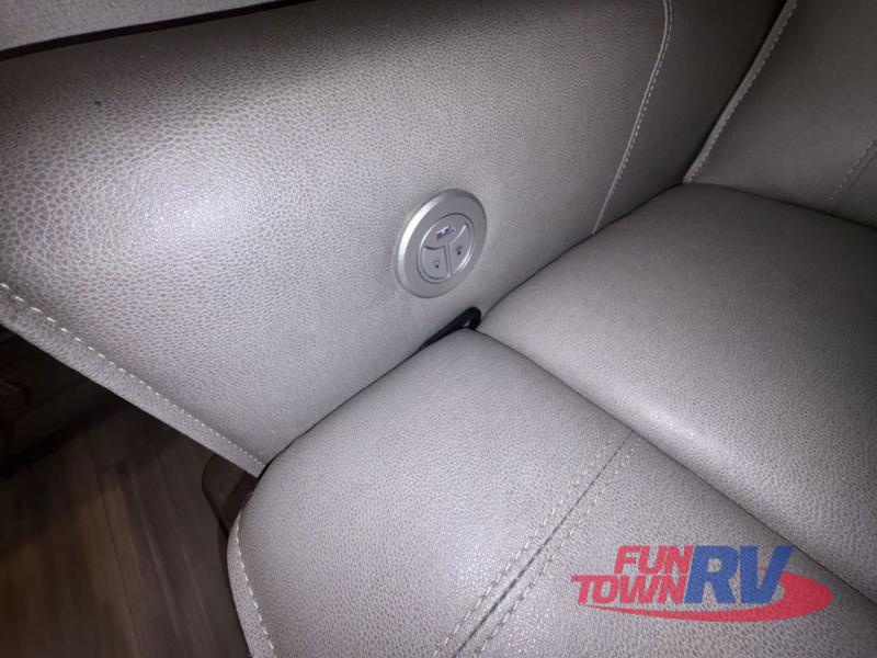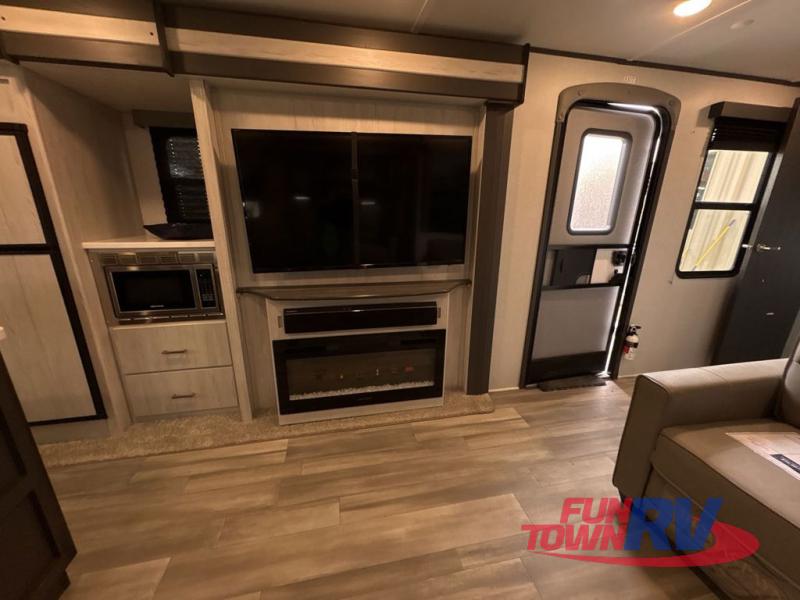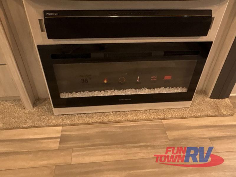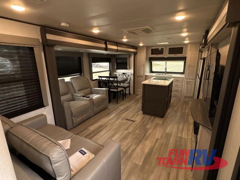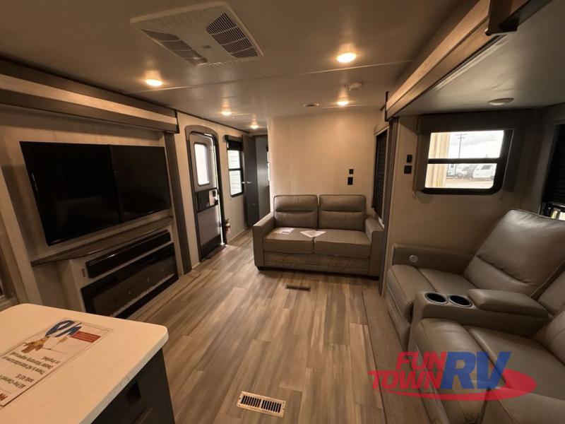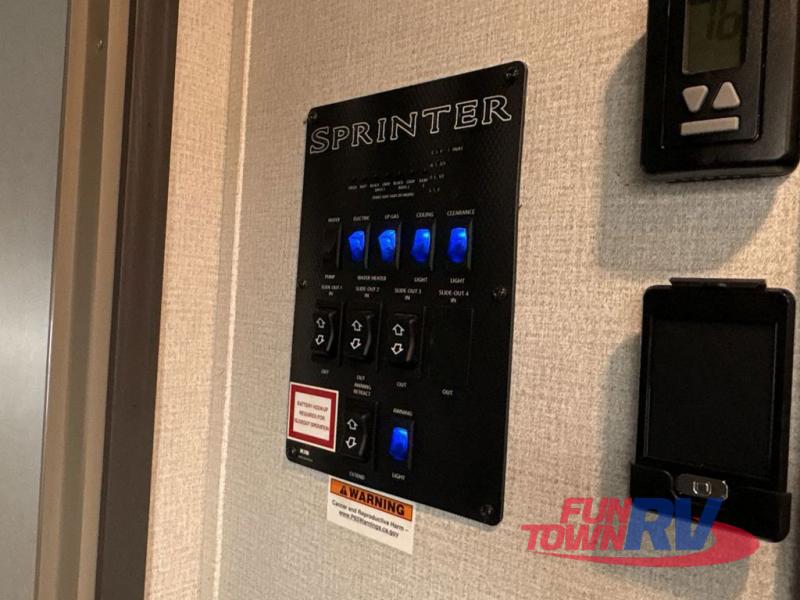 It's time you do camping the right way with this Sprinter Limited travel trailer! The front kitchen makes it easy for you to move around as you create a delicious meal. With two pantries and two 7-cubic foot refrigerators, you can be sure to have enough room for everyone's favorite drinks and snacks. The free-standing dinette with four chairs and a live edge table top offers a comfortable place for you to enjoy your meals. What better way to wind down your nights than to relax on either the full reclining theater seating or on the tri-fold sofa which can transform into a queen-size bed while you watch your favorite movie on the 50" TV and enjoy a fire going in the fireplace below. There is even an outdoor convenience center with a two burner cooktop, a refrigerator, and USB ports to charge your gadgets.