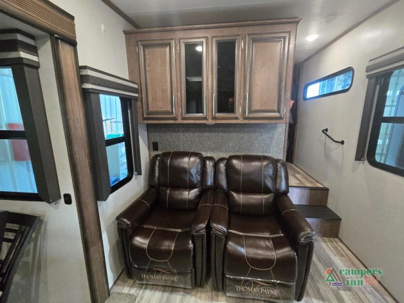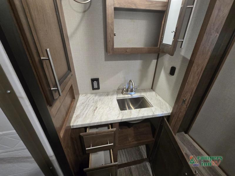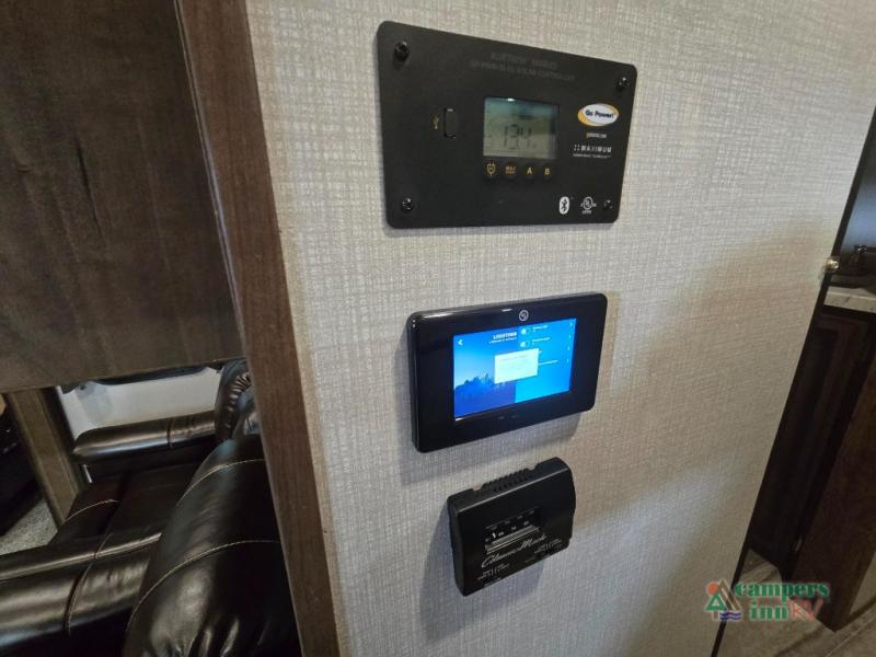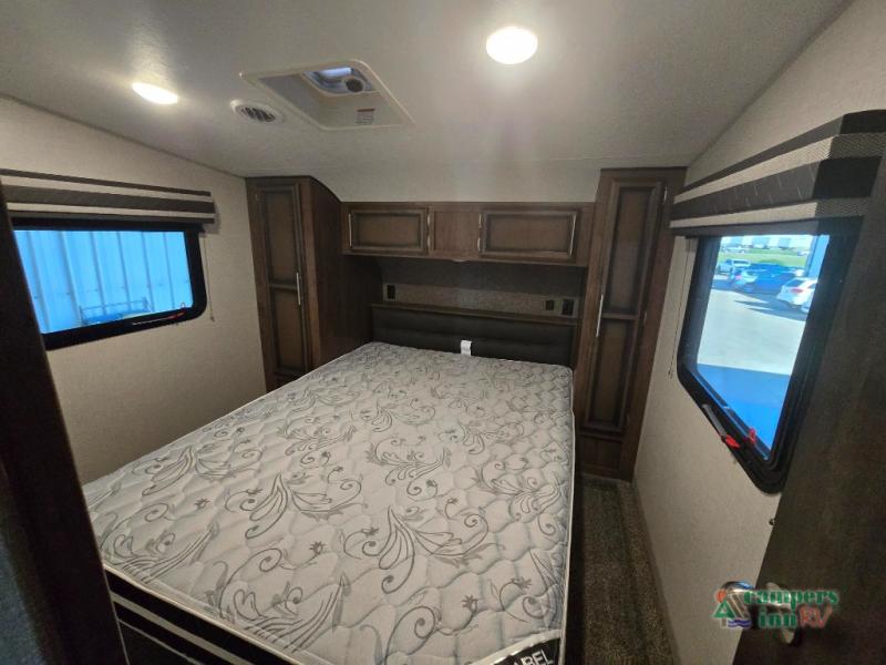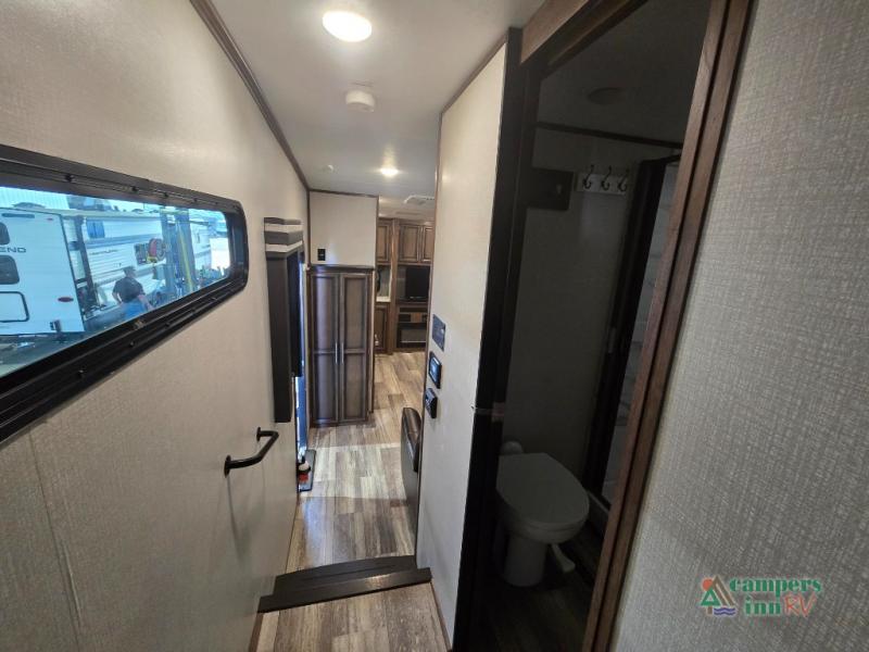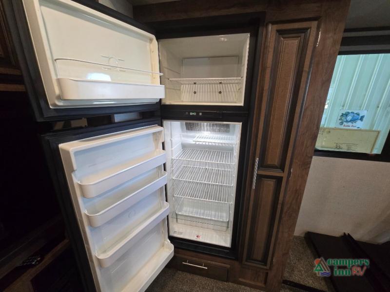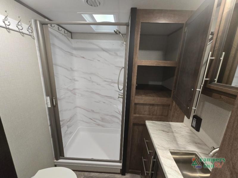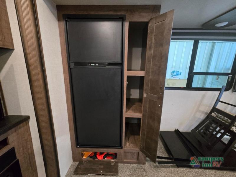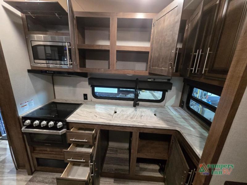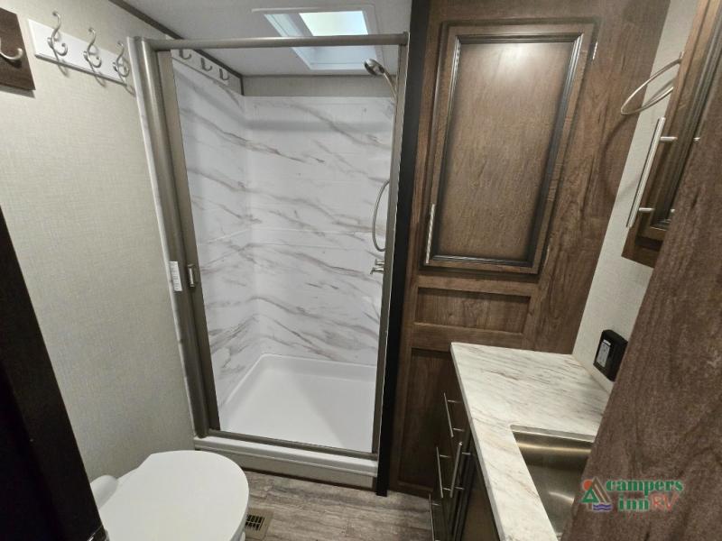 Get ready to head out on your next adventure with this Durango Half-Ton fifth wheel! The main living area is opened up by a single slide that has the booth dinette, pantry, and 8-cubic foot refrigerator, and the rest of the kitchen appliances, like the three-burner range and deep undermount stainless steel sink with residential faucet, are right across from the slide. There is even a kitchen skylight so that you can have some more sunshine while you cook. Another skylight is located in the full bathroom above the shower, and up in the private bedroom, there is a queen-size bed that has an extra-large under-bed storage.
