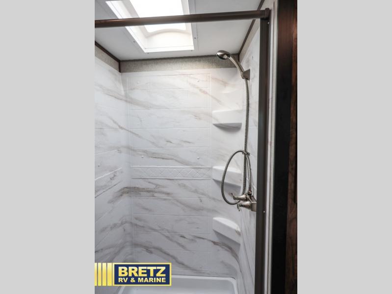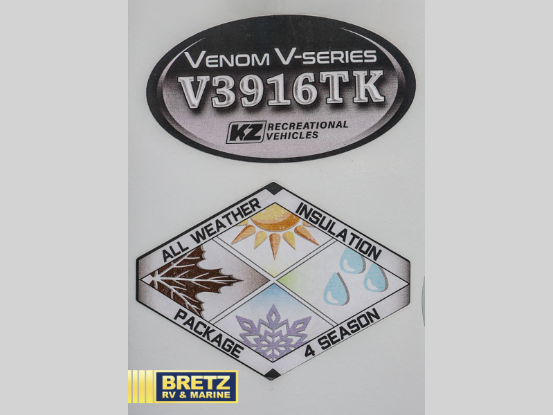 With any KZ Venom V-Series toy hauler fifth wheel, you will have the E-track universal track system with different fittings allowing you to quickly snap in and secure your load for travel, a Zero-G ramp door, and generator prep with a 30 gallon fuel tank and pump station. Other features that stand out include six-point electric auto leveling, Equa-Flex suspension, and Tufflex roofing material for a flexible, puncture resistance and reflective roof. The fully vented attic system provides two attic vents for escape routes for unwanted moisture, and the All-Weather Insulation package allows you to travel during any season. The interior provides deluxe residential-style furniture, decorative lighting above many cabinets, heavy-duty 100 lb. drawer glides on every drawer, and a On-Demand tankless water heater with digital user control panel. Going off-road doesn't mean you have to give up any luxuries, choose your favorite Venom V-Series today!