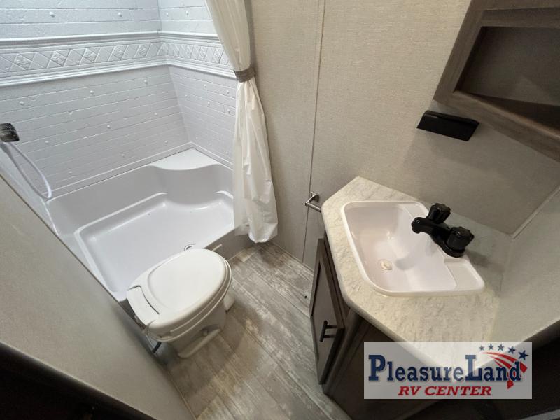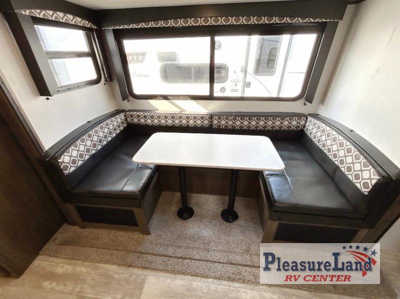 Imagine the kiddos hiking around the campground and laughing about their adventures in this Avenger travel trailer. This trailer offers sleeping accommodations for eight because of the double-size bunks, U-shaped dinette, and queen-size bed, and it also includes a full bathroom with a shower curtain on a curved track providing more elbow room. You will find full kitchen amenities inside, as well as an outdoor kitchen where you can watch the kids play while making dinner. The single slide provides more living space on the interior, as well as extra sleeping space.