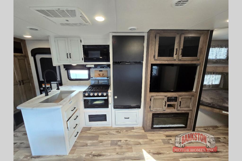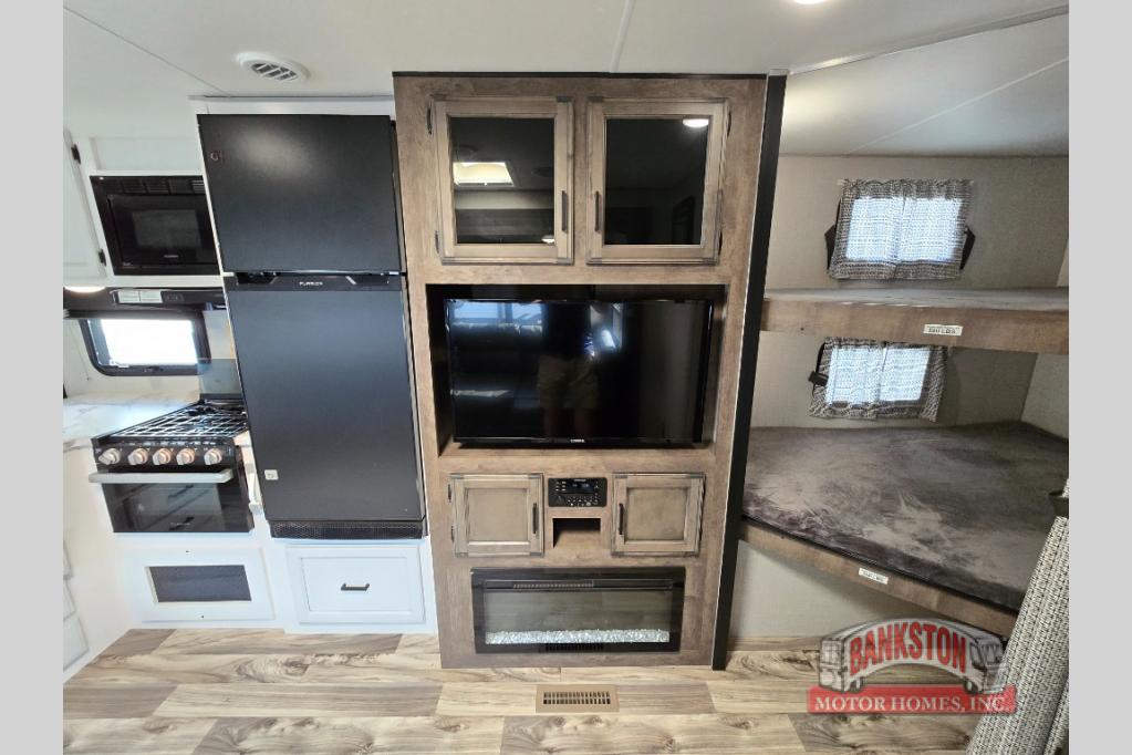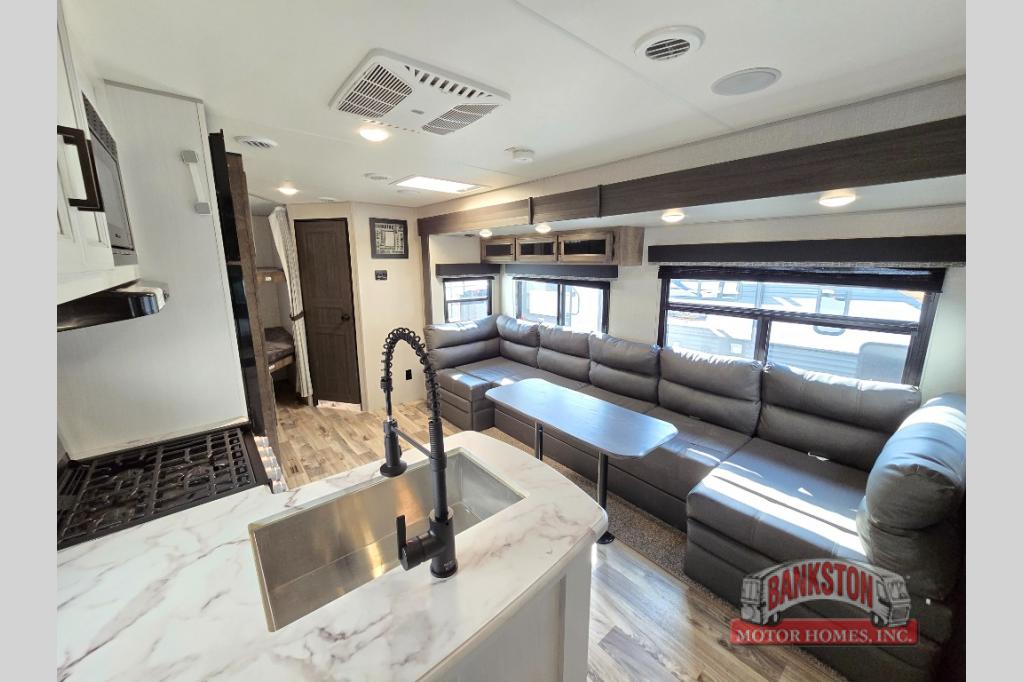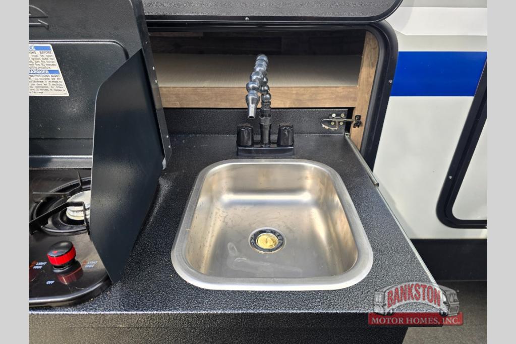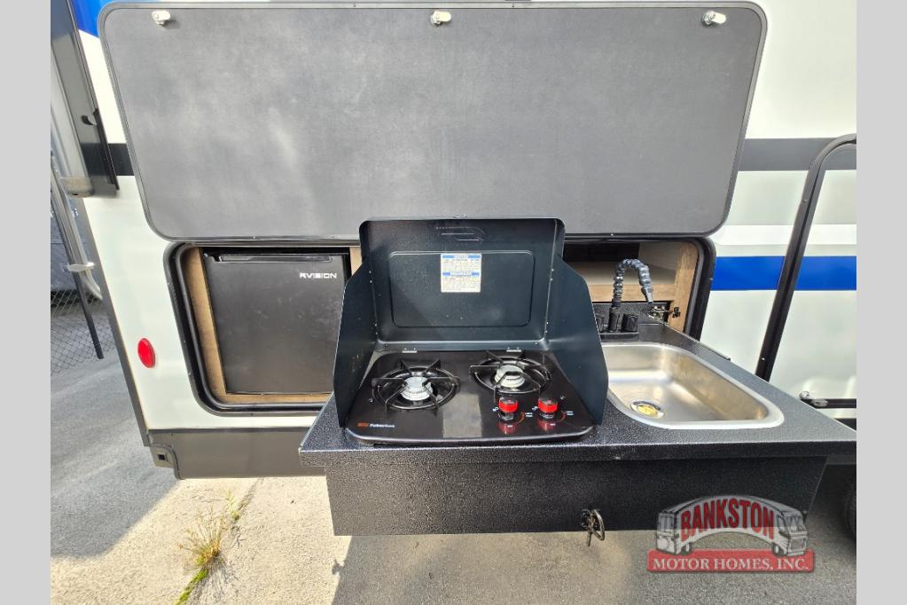 This SportTrek travel trailer has excellent storage capacity with its exterior trunk door, pass-through storage, and interior hidden pantry! You will also find that this trailer has many kitchen amenities with the microwave, Furrion oven, 10-cubic foot refrigerator, and large undermount stainless steel sink on the interior, as well as the additional tools at the outdoor kitchen. The front private bedroom has sliding doors to close it off from the rest of the trailer, and you will find a walk-around queen bed with bedside closets within the bedroom. Out in the main living area, you can put your feet up on the 70" sofa, or you can use the 42" dinette to sit down with an afternoon snack.