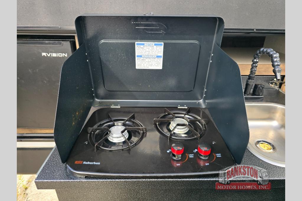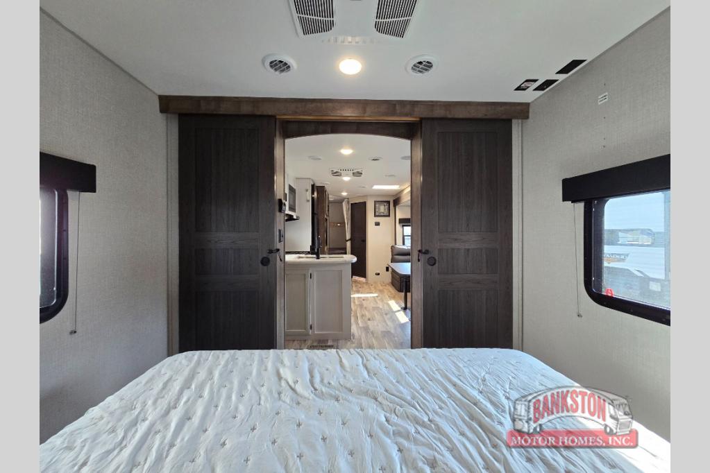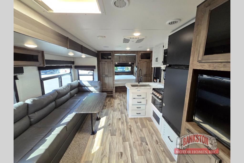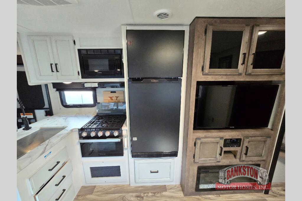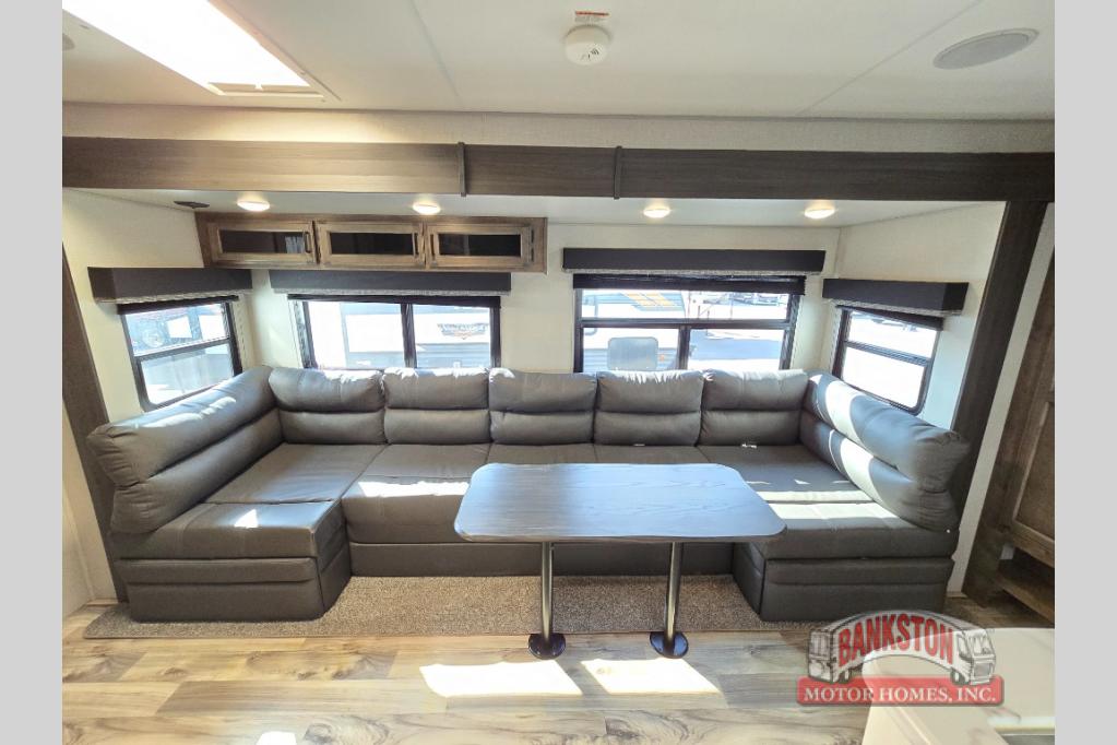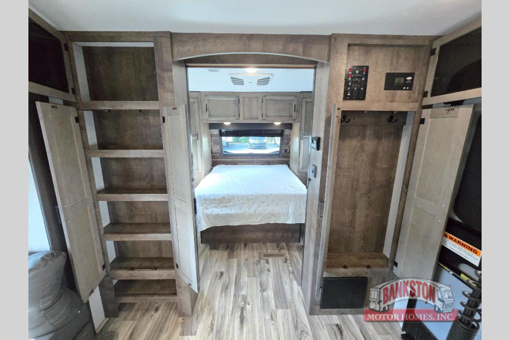 This SportTrek travel trailer has excellent storage capacity with its exterior trunk door, pass-through storage, and interior hidden pantry! You will also find that this trailer has many kitchen amenities with the microwave, Furrion oven, 10-cubic foot refrigerator, and large undermount stainless steel sink on the interior, as well as the additional tools at the outdoor kitchen. The front private bedroom has sliding doors to close it off from the rest of the trailer, and you will find a walk-around queen bed with bedside closets within the bedroom. Out in the main living area, you can put your feet up on the 70" sofa, or you can use the 42" dinette to sit down with an afternoon snack.