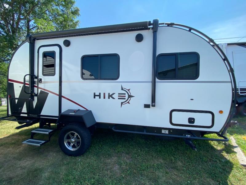 Each one of these Winnebago Industries Towables Hike travel trailers will take you off the beaten path with off-road tires, offset wheels, and robust fenders! The front multi-use gear storage lets you pack in more adventure with space for a battery, LP tanks or adventure gear. Their rugged exoskeleton lets you securely attach a bike or kayak with an exterior powder coated rack system. The exterior fiberglass sidewalls come with an Azdel substrate for an easier tow, and the NXG engineered frame will hold up through all of your adventures. Crank up the tunes with the exterior speakers and relax underneath the power awning with LED lighting!