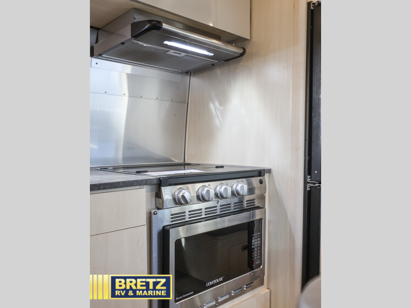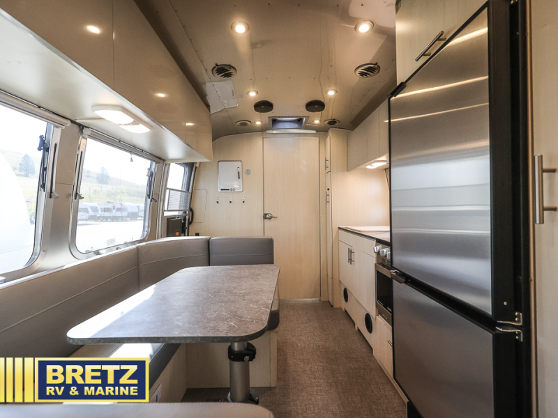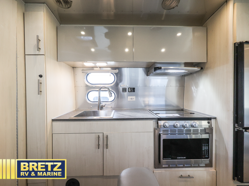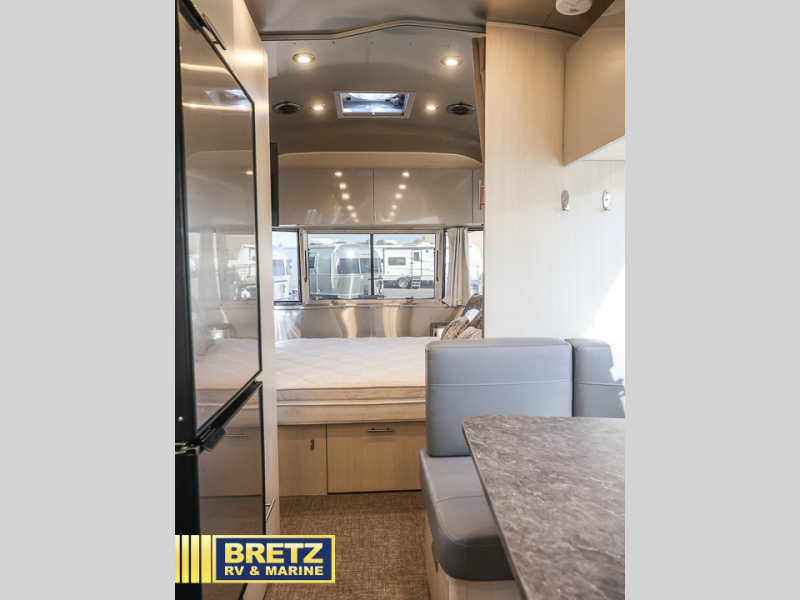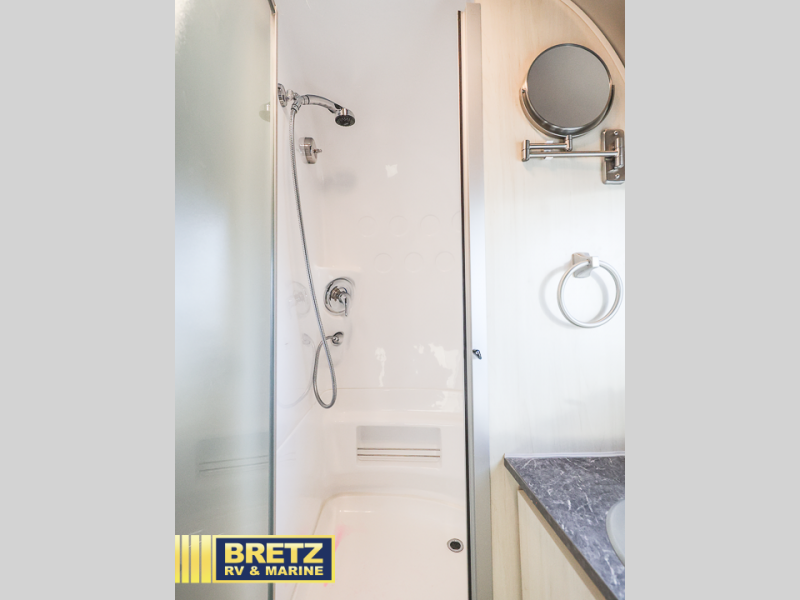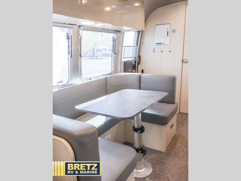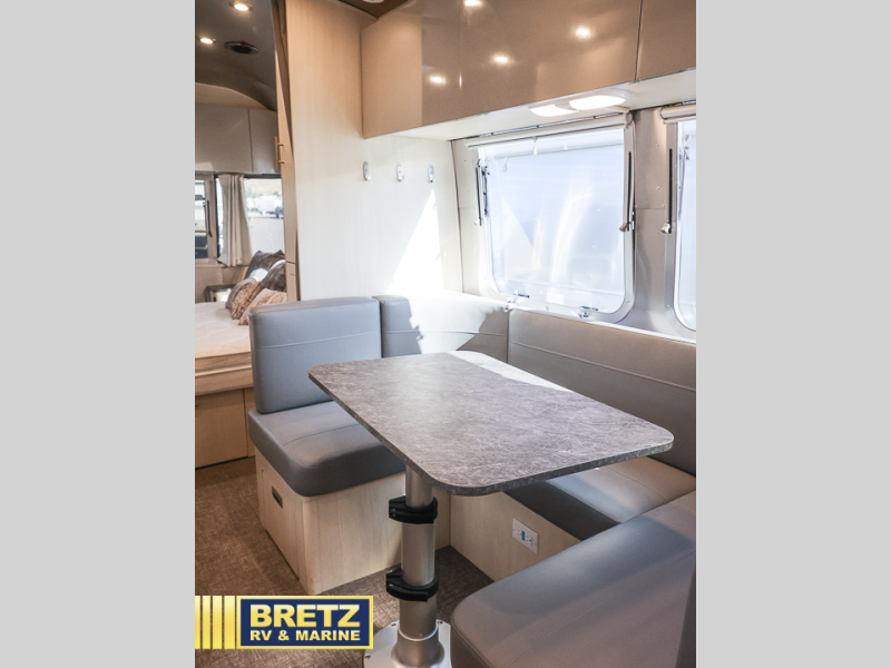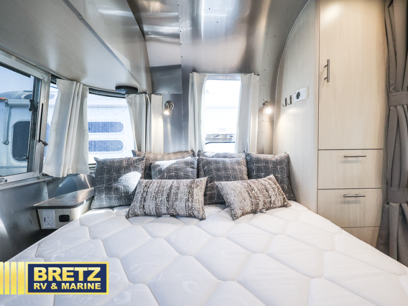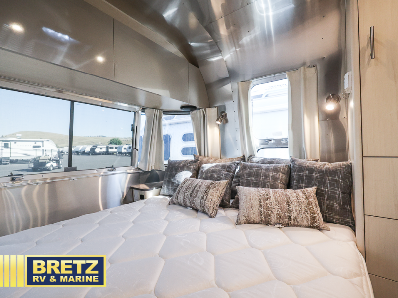 Every time you step foot into the Airstream International travel trailer, you will feel as if you are breathing in a breath of fresh air! The fresh coastal décor was inspired by the waterfront, and the stylish interior delivers a relaxing environment and comfortable luxury. The panoramic windows increase the amount of natural sunlight that streams through to the interior, but they also have blackout shades that you can close whenever you need a darkened room. The beautiful handcrafted Italian Lite-Ply laminated cabinetry is an attractive base for the overhead storage lockers that have sliding doors and LED lighting. The dimmable interior LED lighting will create the perfect amount of illumination for you as you spend time indoors. The exterior has excellent features as well with its enclosed aluminum insulated heated underbelly, unique front door key with heavy-duty deadbolt, optional solar package, solar front window protection, and exterior shower with hot and cold water.