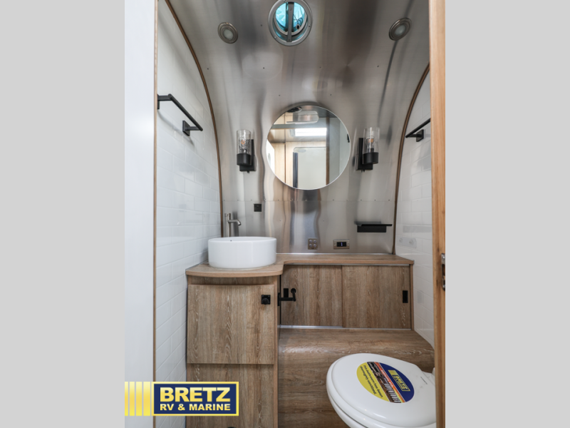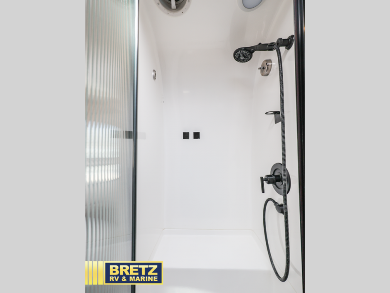 You will be astounded by this design-focused Pottery Barn Special Edition travel trailer! The ready-to-camp accessories make this trailer extremely functional. Some of those features are the Pottery Barn 16-piece dinnerware set, 20-piece flatware set, 4-piece set of marble cheese knives, folding bistro table, and set of two folding chairs. The Fusion touchscreen stereo with surround sound and subwoofer will help you set the mood for relaxing, and the Pottery Barn colossal handknit throw will help you cozy up on the couch. In the private bedroom, you'll find canvas storage bins that you can use to keep all of your belongings easily accessible, LED reading lights, a wardrobe with hanging bar, blackout pleated curtains for the panoramic windows, and an LED HDTV for entertainment. The residential bathroom is quite impressive with its sconce lighting, removable Moen handheld shower head, reeded glass shower door, retractable clothes line, and round mirror with two-shelf medicine cabinet.
