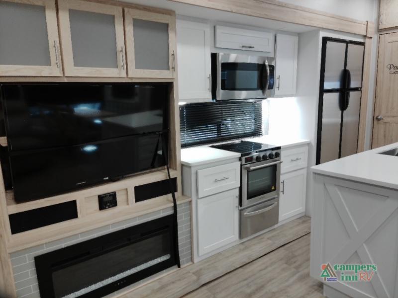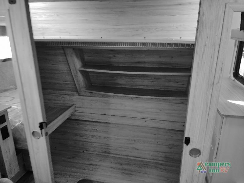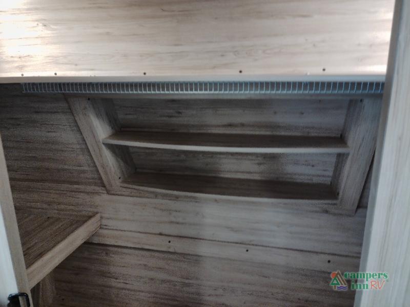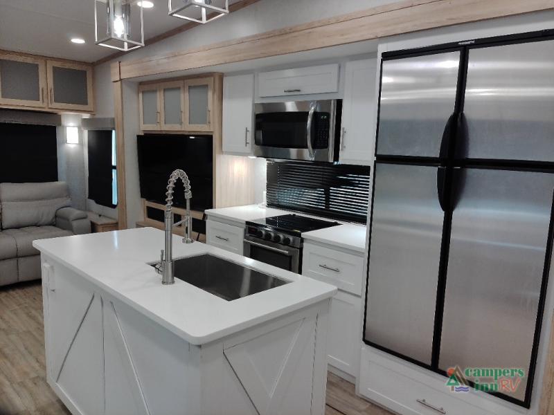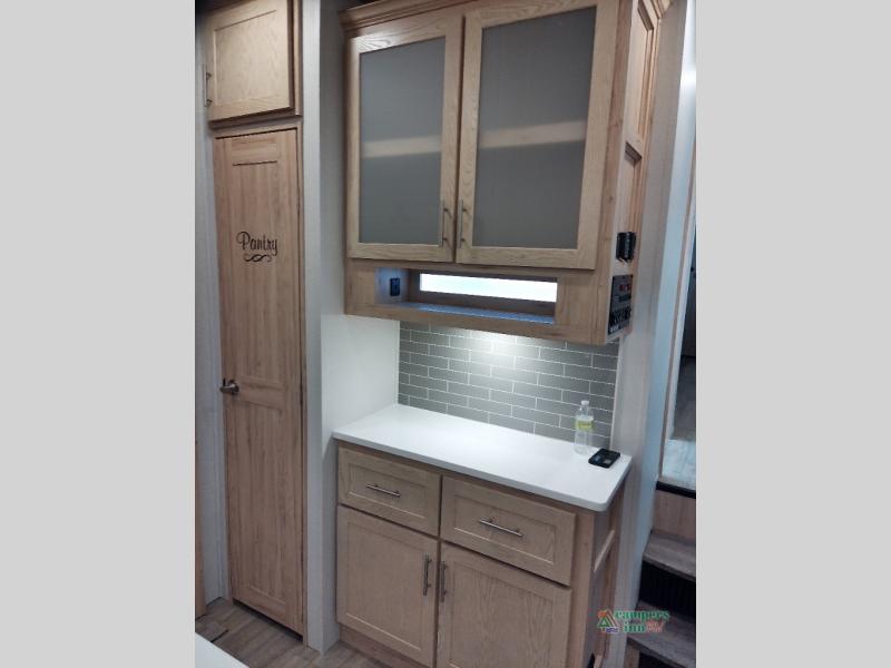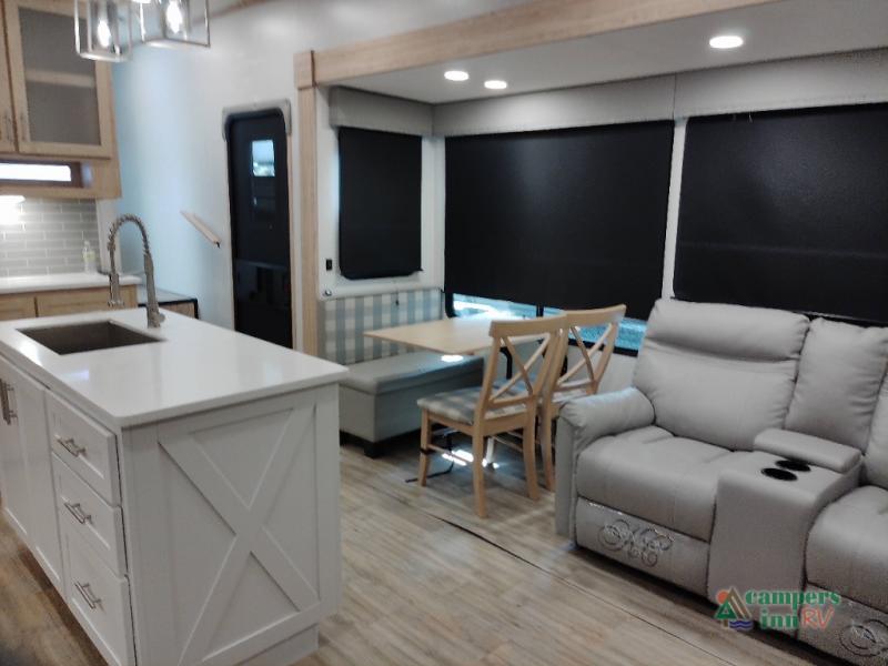 A kitchen island with countertop space makes it easy to prepare meals in this fifth wheel! The floating dinette table has two chairs on one side and a movable ottoman with flip up storage on the other side to keep your games or extra table cloths in. You can store your dishes and snacks inside the hutch/pantry or in the second pantry. The front private bedroom has a queen bed slide but can be switched out for the optional king bed if you like. There is also a dresser and large wardrobe for storage, and either side of the wardrobe has been prepped for a washer and dryer which you could add for those extended trips. The rear living area has dual recliner theater seating across from an entertainment center which has a 50" class HDTV with hidden storage behind it and is also on a swing mount for all to see even at the rear sleeper sofa!