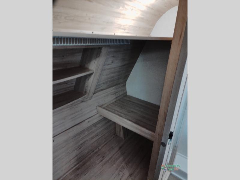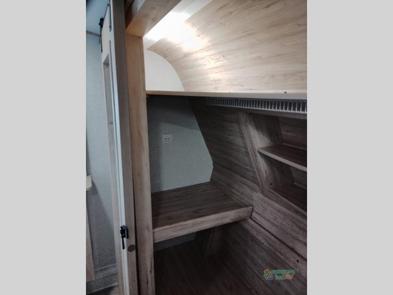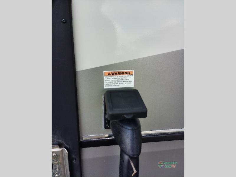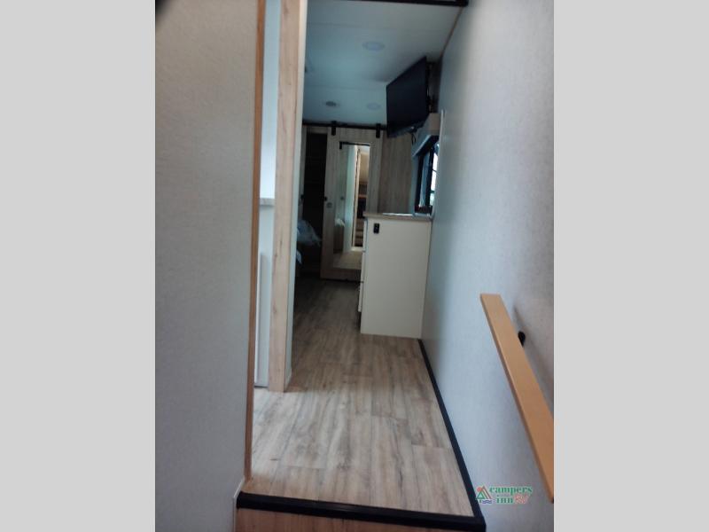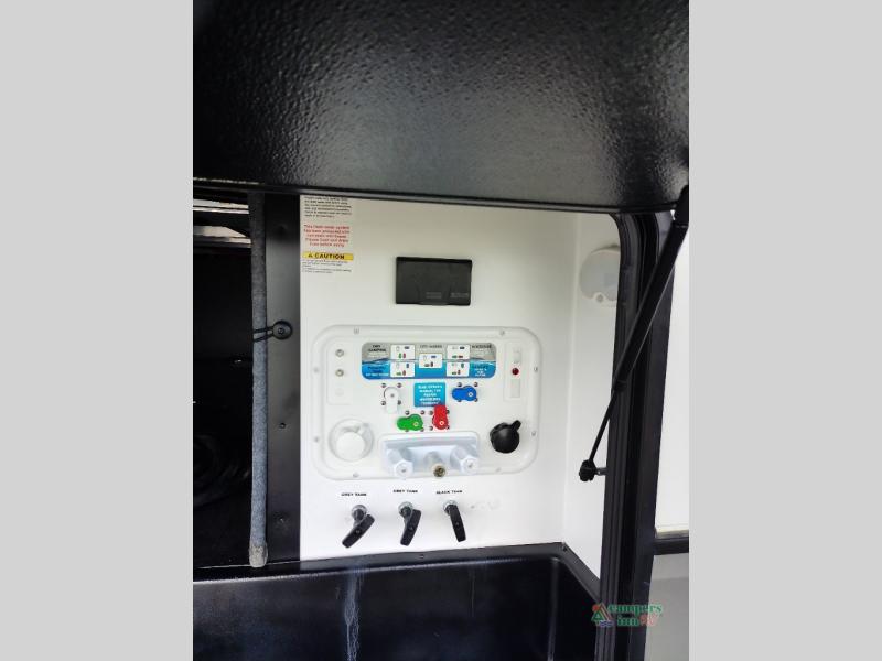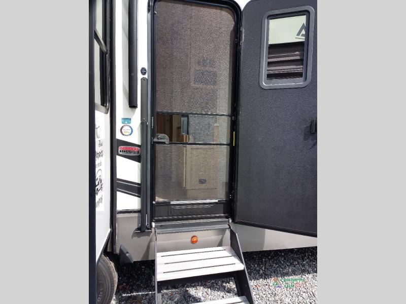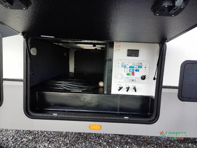 A kitchen island with countertop space makes it easy to prepare meals in this fifth wheel! The floating dinette table has two chairs on one side and a movable ottoman with flip up storage on the other side to keep your games or extra table cloths in. You can store your dishes and snacks inside the hutch/pantry or in the second pantry. The front private bedroom has a queen bed slide but can be switched out for the optional king bed if you like. There is also a dresser and large wardrobe for storage, and either side of the wardrobe has been prepped for a washer and dryer which you could add for those extended trips. The rear living area has dual recliner theater seating across from an entertainment center which has a 50" class HDTV with hidden storage behind it and is also on a swing mount for all to see even at the rear sleeper sofa!