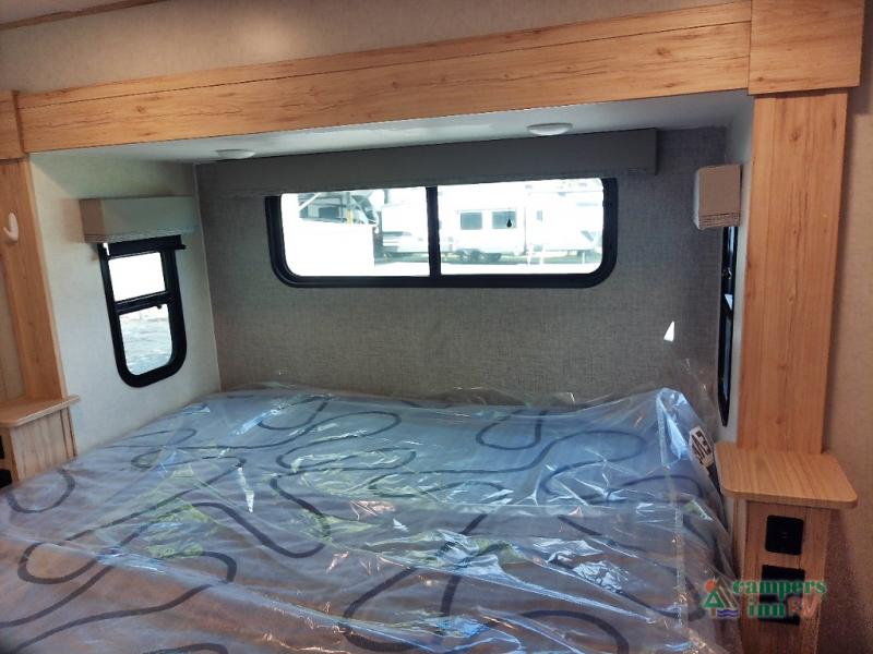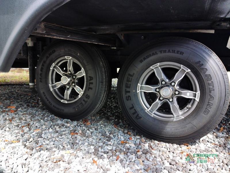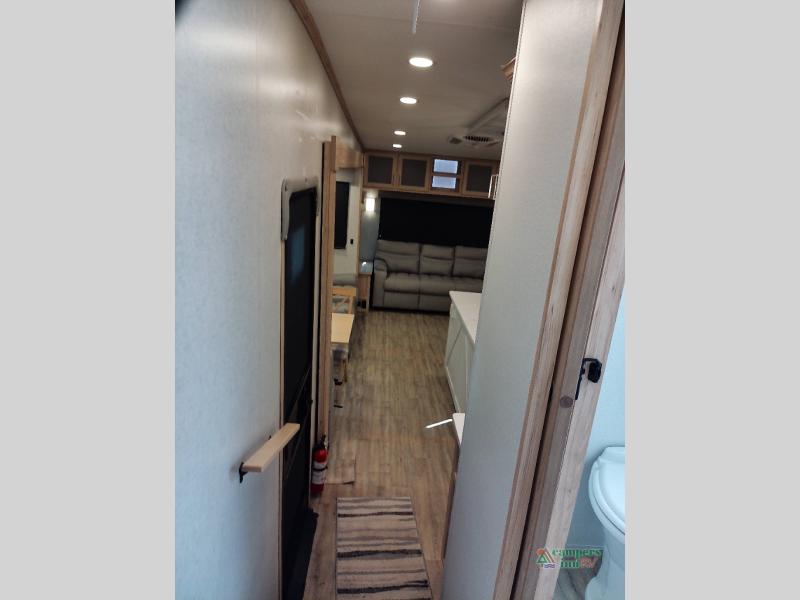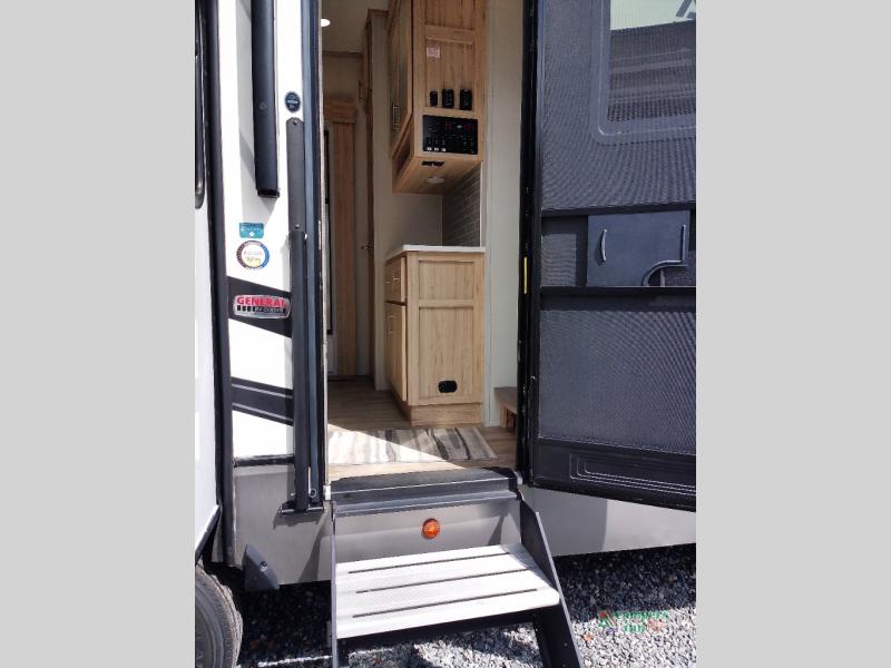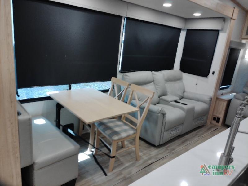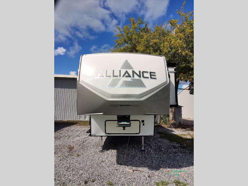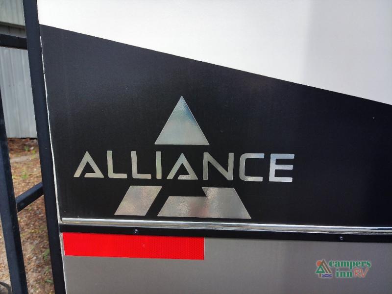 A benchmark chassis creates a space saver upper deck with each one of these Avenue fifth wheels by Alliance RV! The 101 in. wide-body construction gives you more room to walk around and the flush slide out floors throughout prevent any tripping. There are Azdel composite sidewalls inside and out, and a seamless fully walkable PVC roof for extreme durability, zero maintenance, and it is more solar reflective because of the bright white color. Twin 13,500 BTU A/C units provide 27,000 BTUs of cooling power which are ultra quiet and independently controlled keeping you comfortable during your entire trip. And, the fully enclosed and heated underbelly means that you can extend your camping season into the colder months if you like. You are sure to love the "no carpet zone" making each Avenue easy to clean and allergen free, not to mention pet friendly with vinyl flooring throughout. And, strategically placed Atrium windows in the bedroom and living area will not only provide more light, cross ventilation and fresh air, but bring a spectacular view of your surroundings right inside. You can maximize your space throughout with innovative storage solutions like the hidden storage behind the TV, inside the end tables, ottoman, and dinette chairs. Come choose your favorite model today!