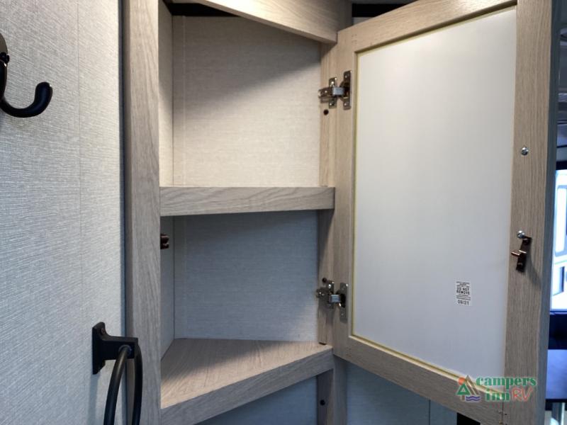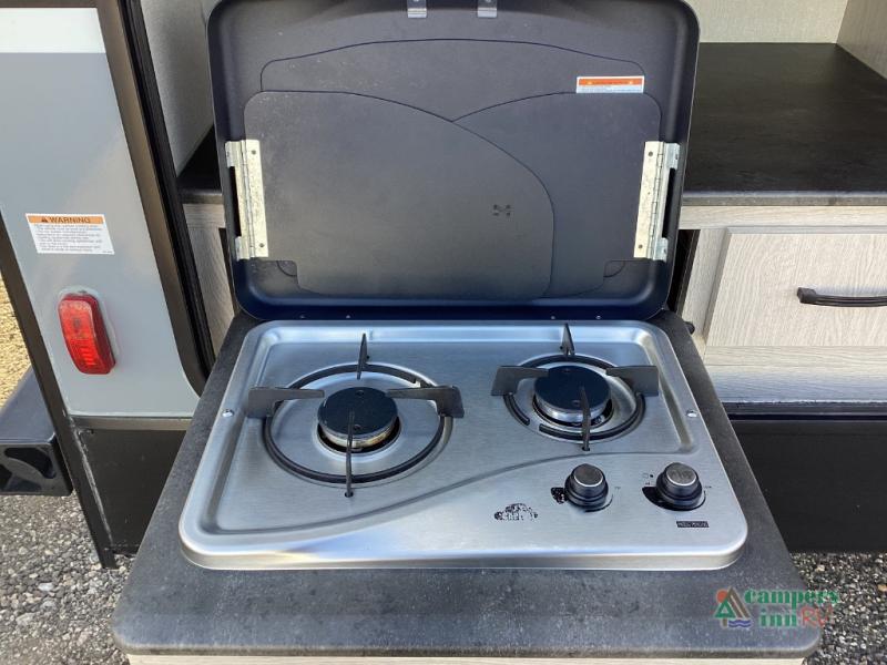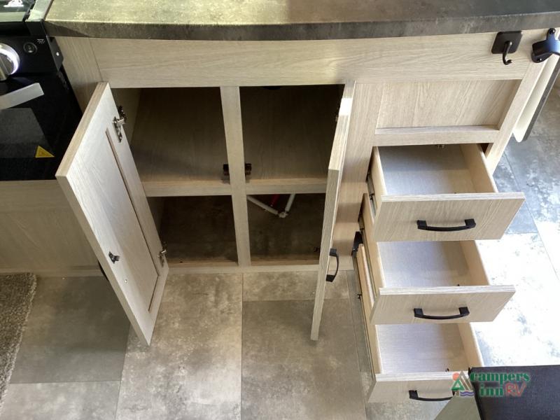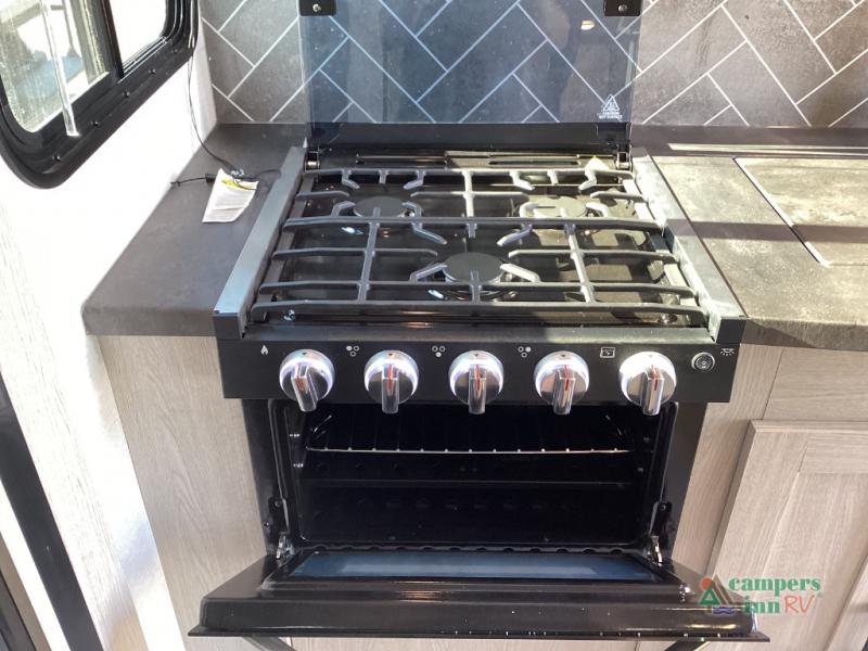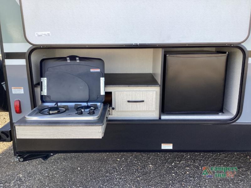 Whether you’re flipping burgers under the awning or making s’mores inside, the three-burner cooktop, microwave, and exterior camp kitchen have got you covered.