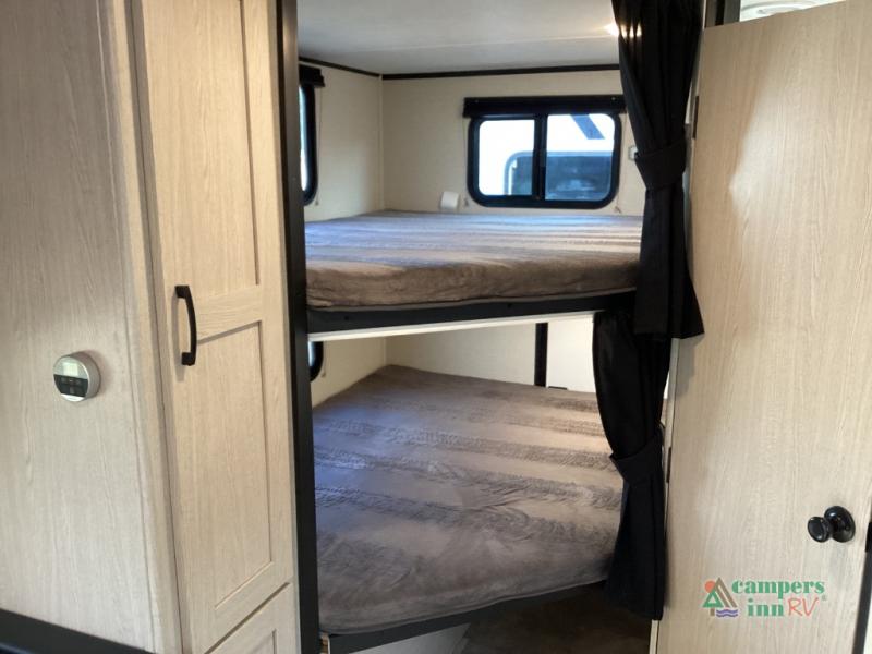 Doppel bunks in the back plus a queen bed up front closed off in its own space—room for friends, kids, and camping gear galore.