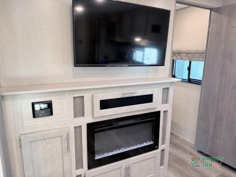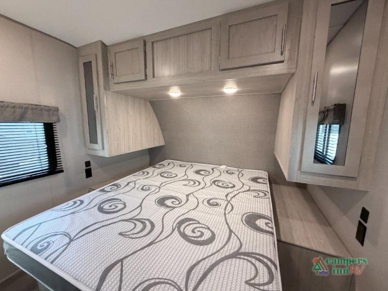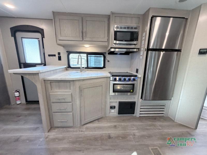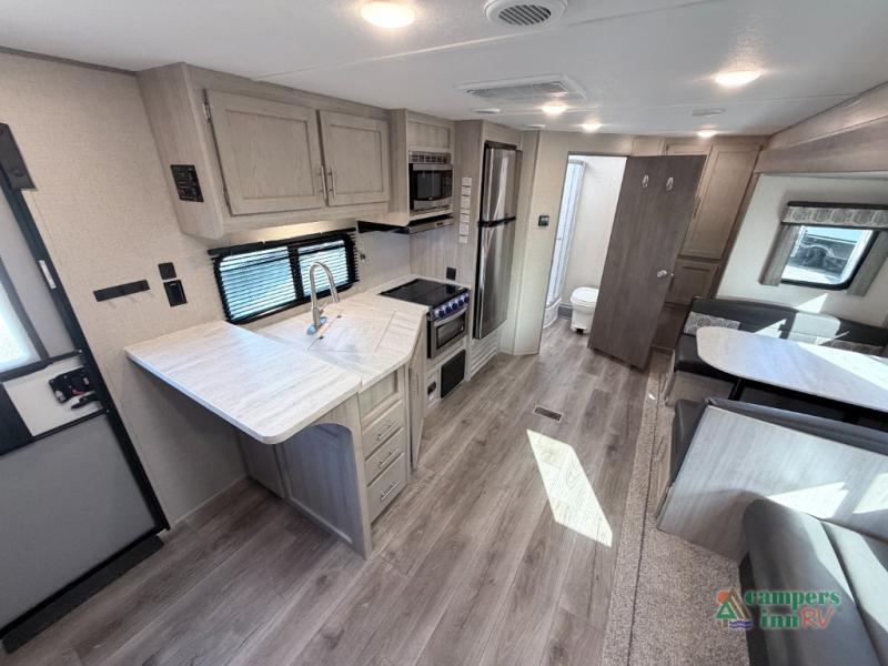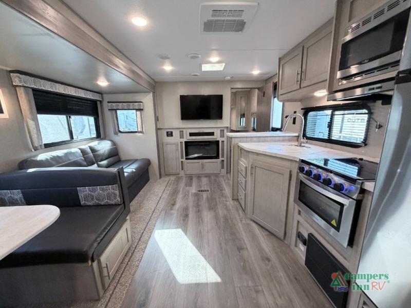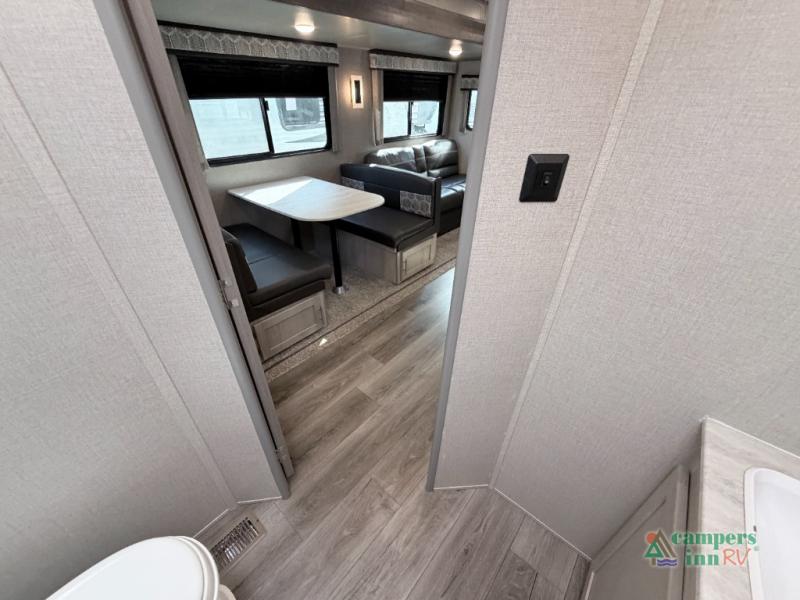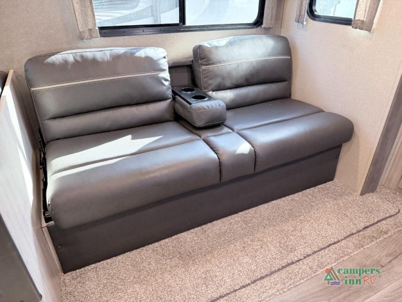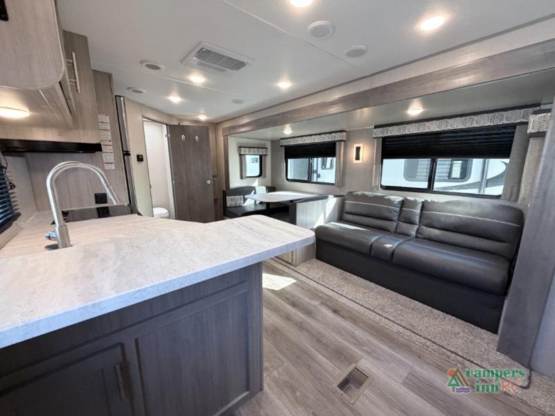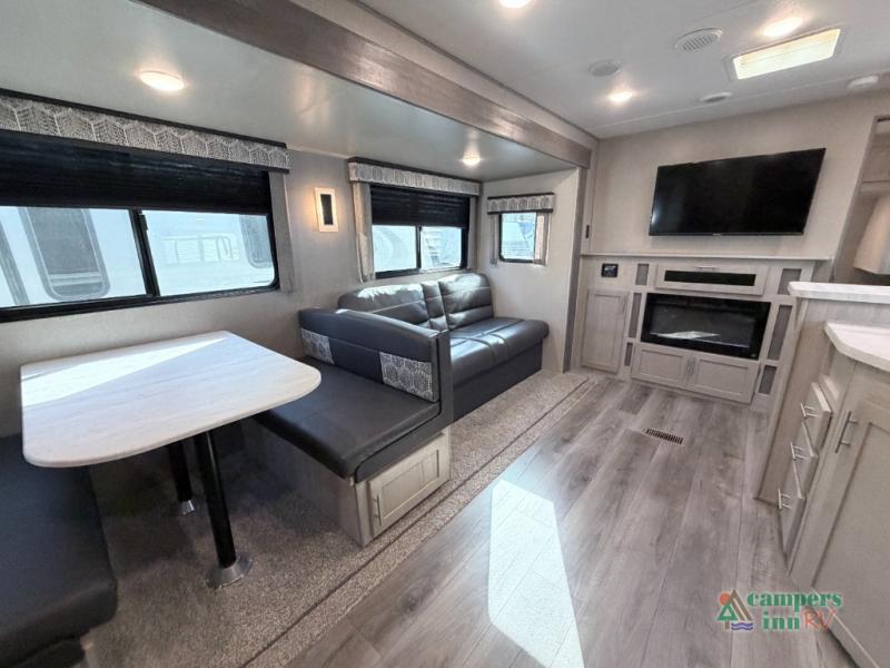 This half-ton friendly trailer is easy to pull, easy to park, and impressively spacious thanks to the large slide-out in the main living and kitchen area! Dine at the booth dinette—or opt for the free-standing dinette—and relax on the sofa with built-in drink holders while watching the entertainment center with an optional fireplace below. A full rear corner bathroom provides convenience, while the large wardrobe/pantry gives you all the storage space you need.