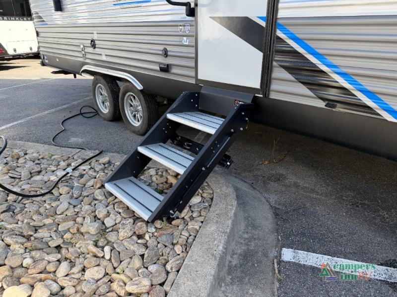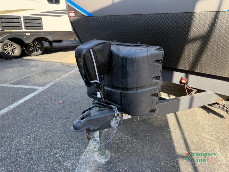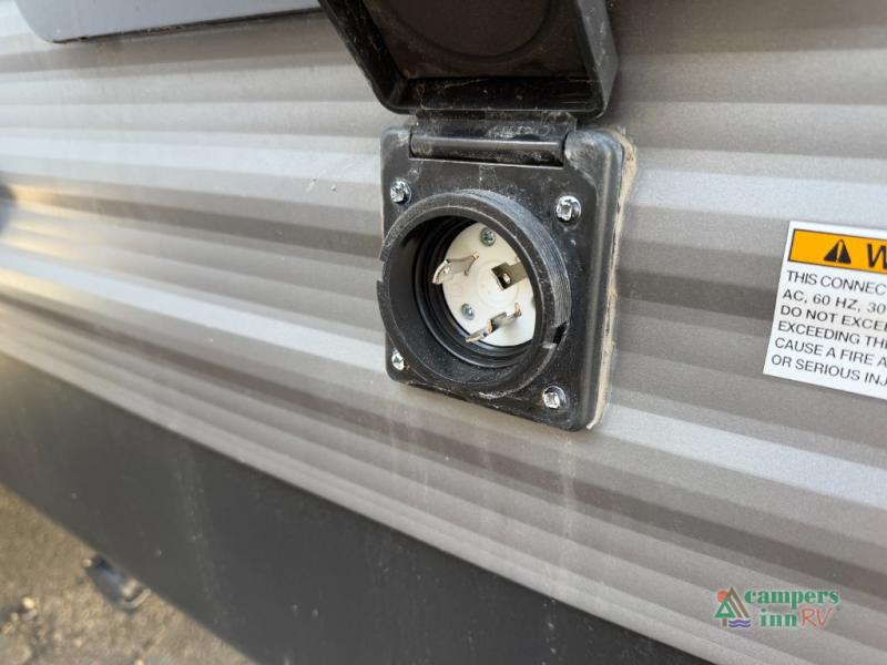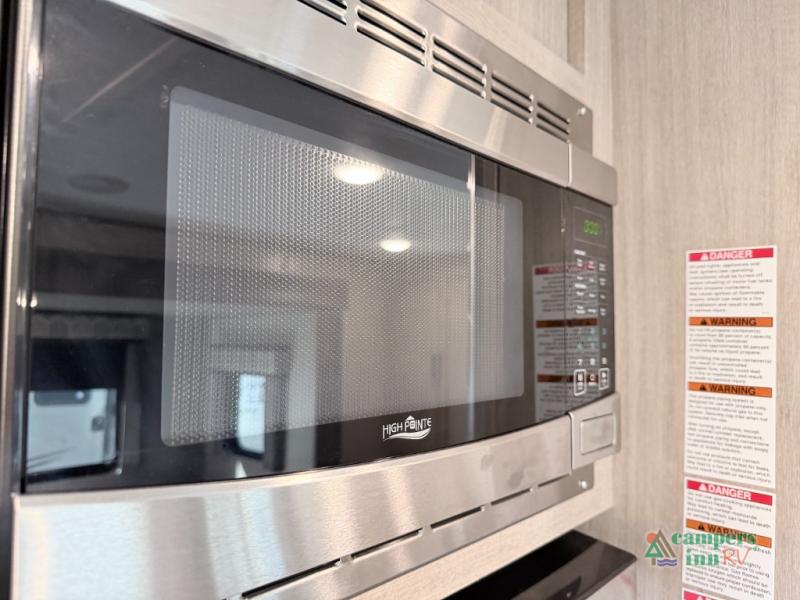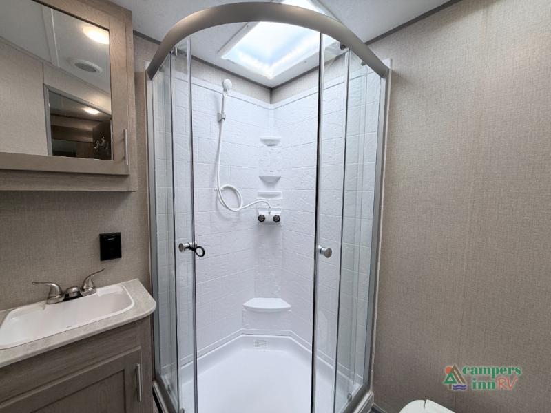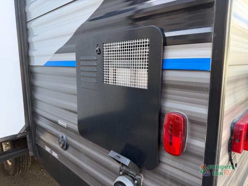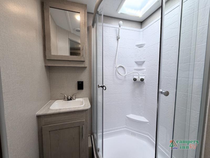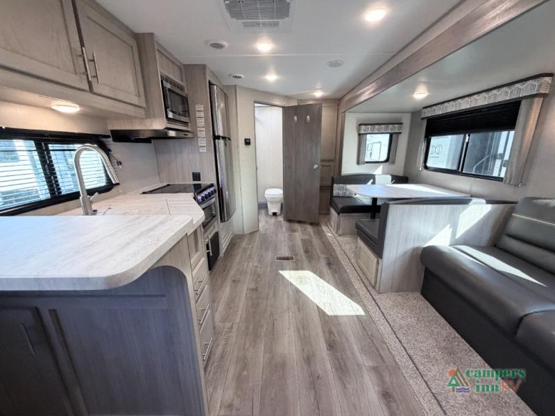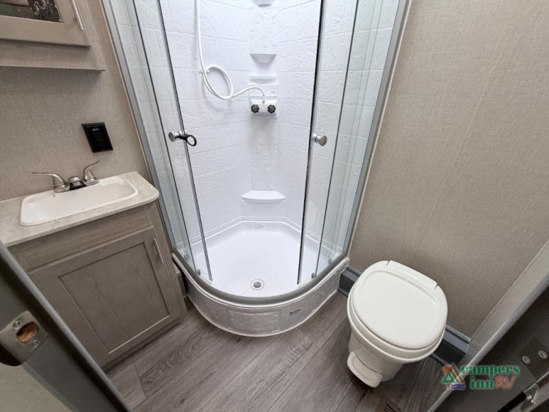 This half-ton friendly trailer is easy to pull, easy to park, and impressively spacious thanks to the large slide-out in the main living and kitchen area! Dine at the booth dinette—or opt for the free-standing dinette—and relax on the sofa with built-in drink holders while watching the entertainment center with an optional fireplace below. A full rear corner bathroom provides convenience, while the large wardrobe/pantry gives you all the storage space you need.