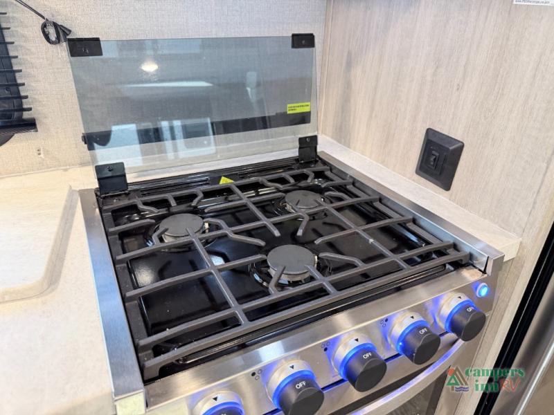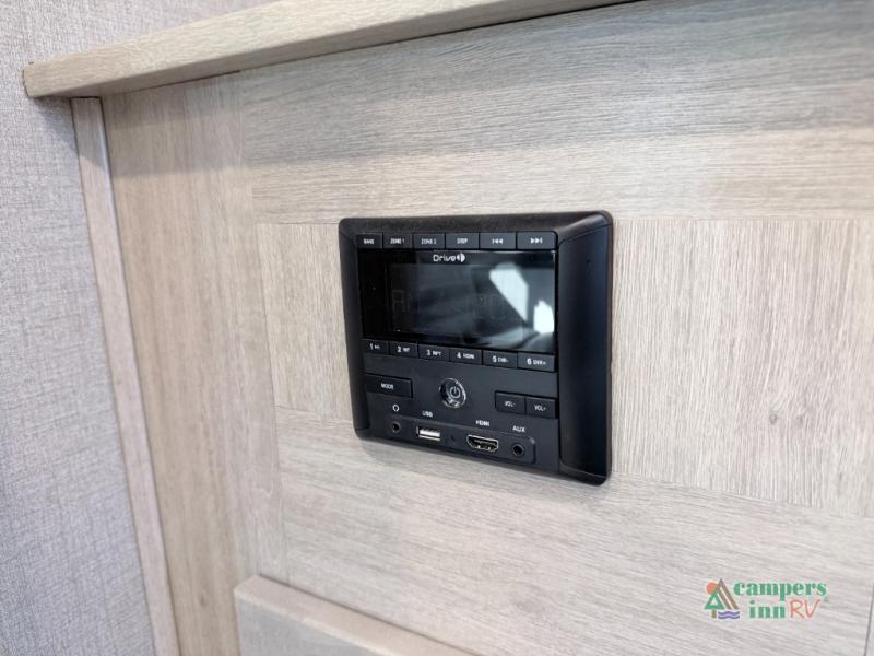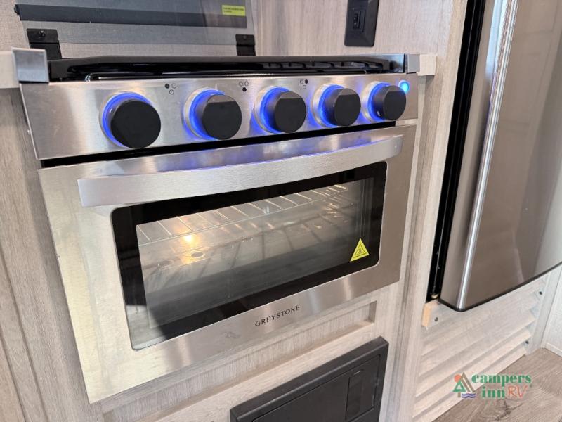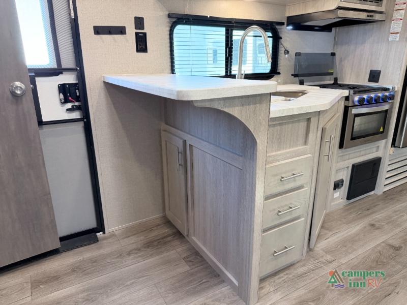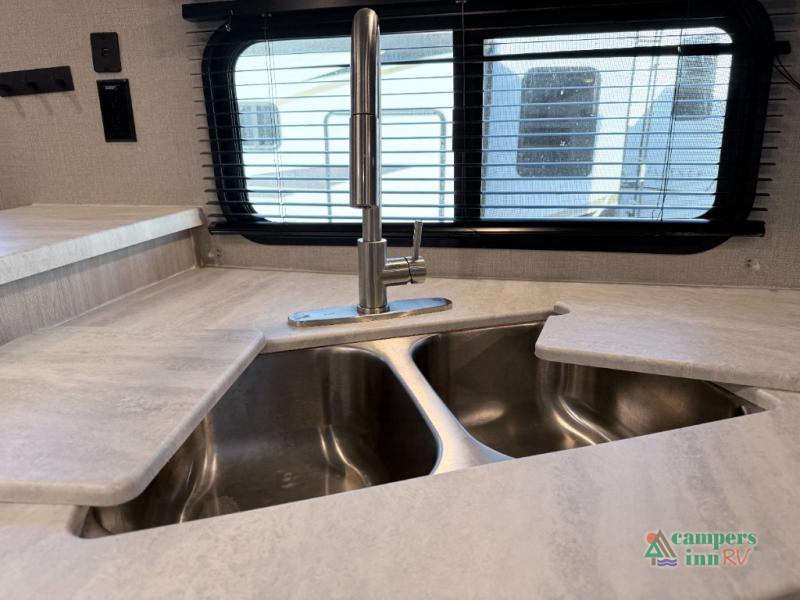The galley kitchen includes full amenities, plus a breakfast bar with optional stools for added seating. Step outside and enjoy shade and atmosphere under the 15' power awning, complete with remote-controlled LED lighting in multiple color options for the perfect campsite vibe.