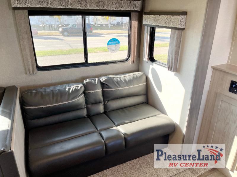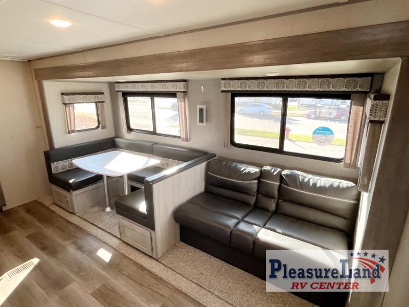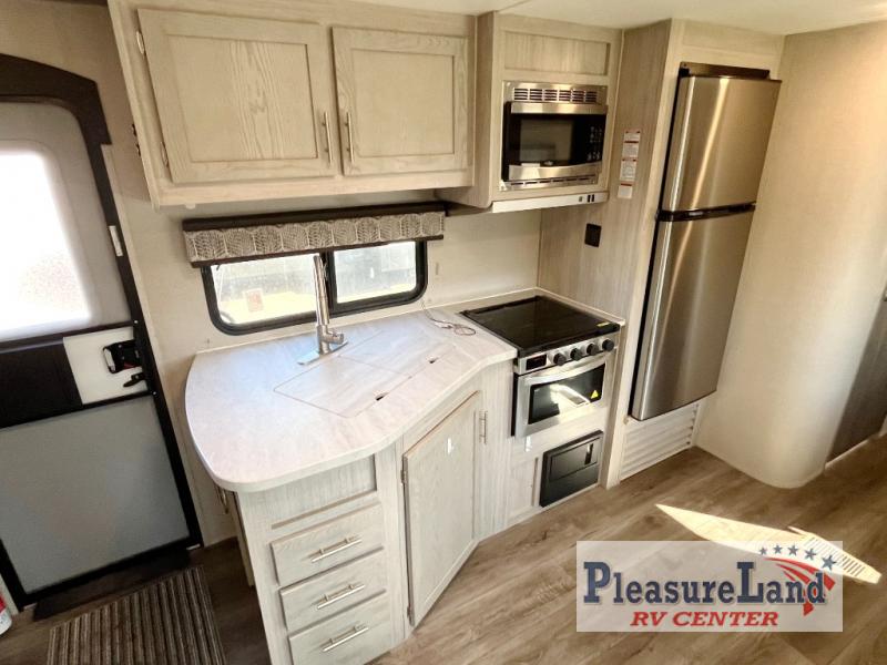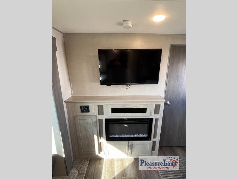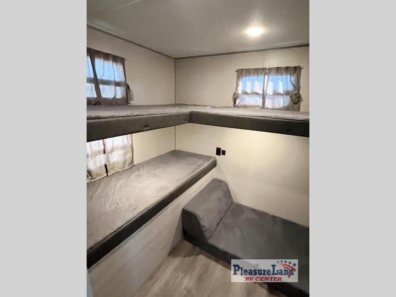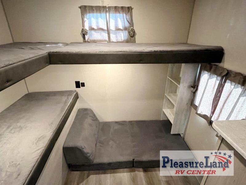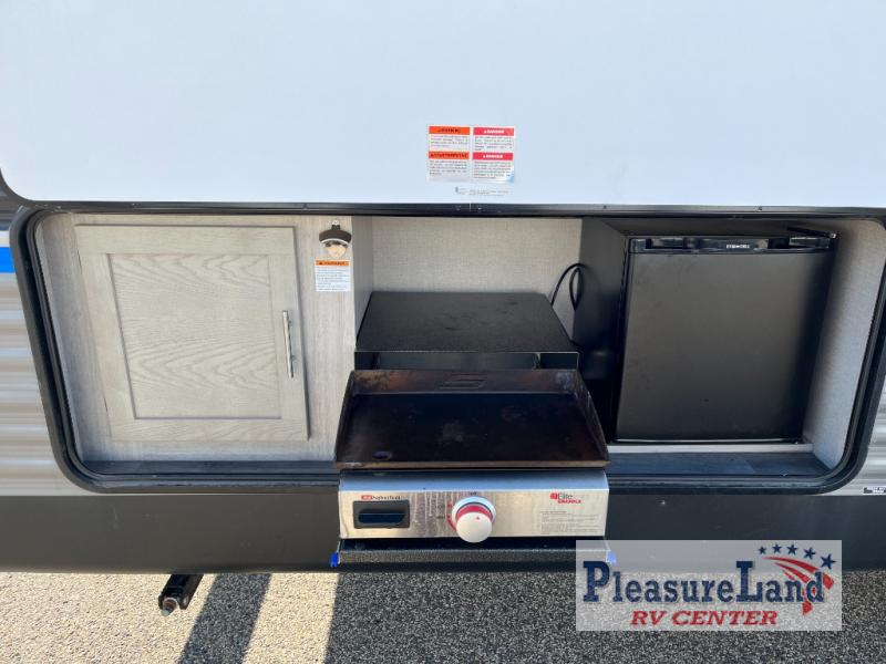 Not only will you be comfortable in this trailer, your friends will have comfort and privacy thanks to having their own bunkhouse on the opposite side of the trailer has the front bedroom where you can sleep like a queen! There are three bunk beds and two COA cube seats plus a location for a TV, a wardrobe, and windows for natural lighting. The combined living and kitchen is spacious thanks to the slide out U-shaped dinette and sofa with drink holders. And some might even decide to sleep on the furniture at night so they can watch the 39" TV. You can even add the fireplace option if you want that feature. The cook will have full amenities to whip up meals including overhead cabinets for dishes and snacks. And the exterior camper kitchen allows the cook to visit with everyone outside under the 18' electric awning that includes multicolor LED lights with a remote.