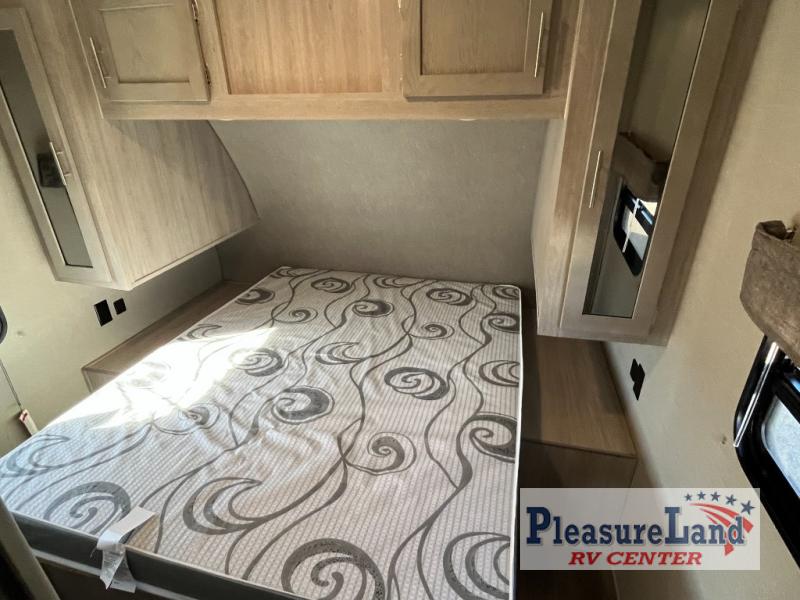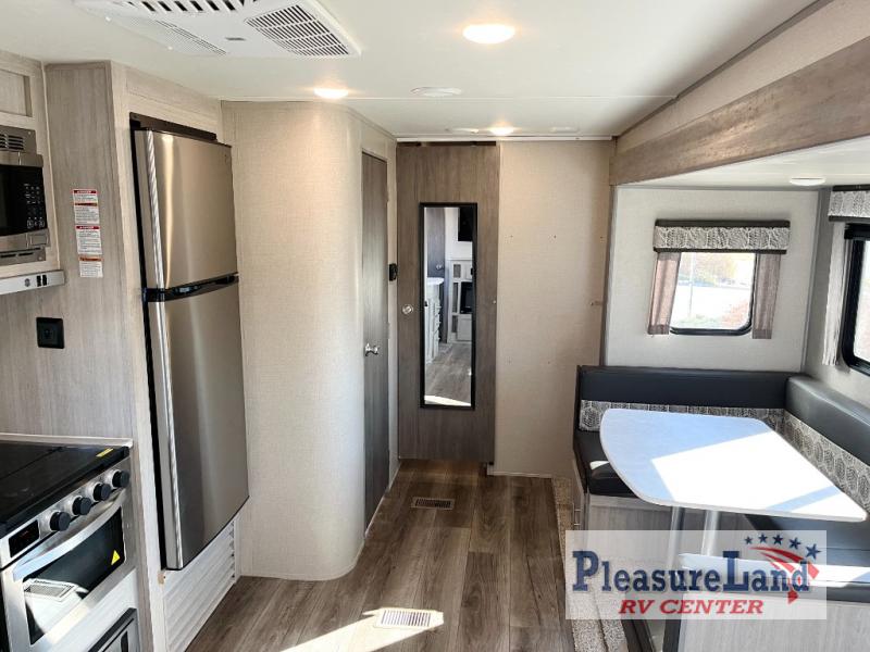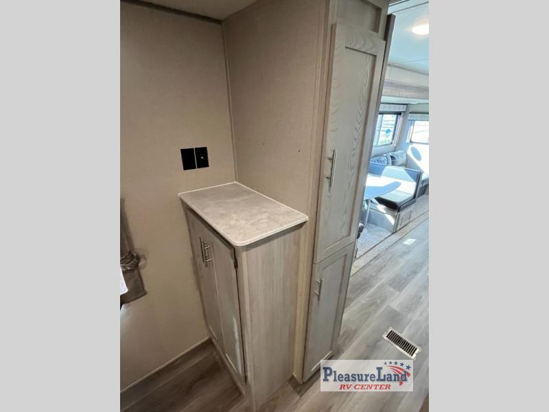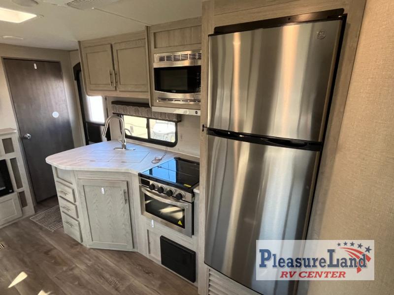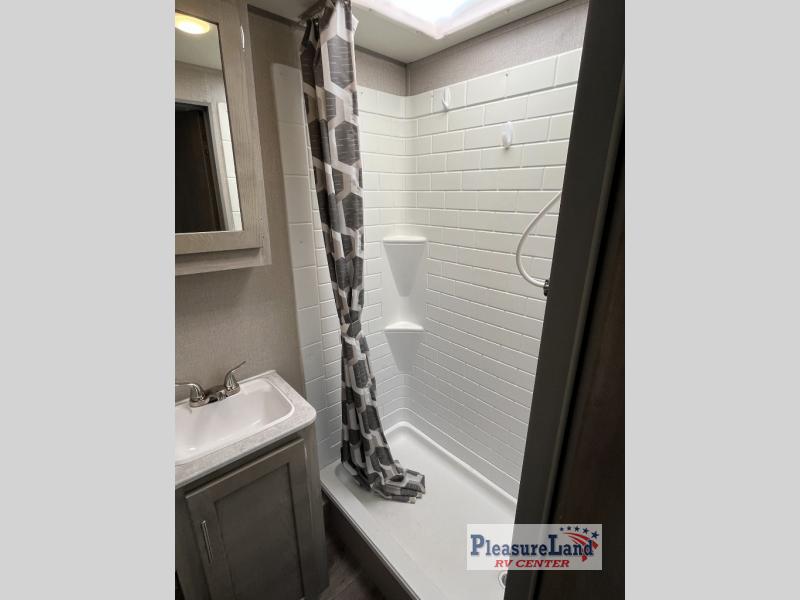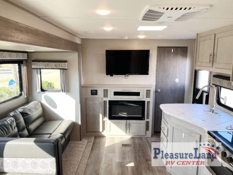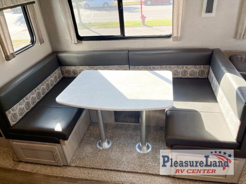 Not only will you be comfortable in this trailer, your friends will have comfort and privacy thanks to having their own bunkhouse on the opposite side of the trailer has the front bedroom where you can sleep like a queen! There are three bunk beds and two COA cube seats plus a location for a TV, a wardrobe, and windows for natural lighting. The combined living and kitchen is spacious thanks to the slide out U-shaped dinette and sofa with drink holders. And some might even decide to sleep on the furniture at night so they can watch the 39" TV. You can even add the fireplace option if you want that feature. The cook will have full amenities to whip up meals including overhead cabinets for dishes and snacks. And the exterior camper kitchen allows the cook to visit with everyone outside under the 18' electric awning that includes multicolor LED lights with a remote.