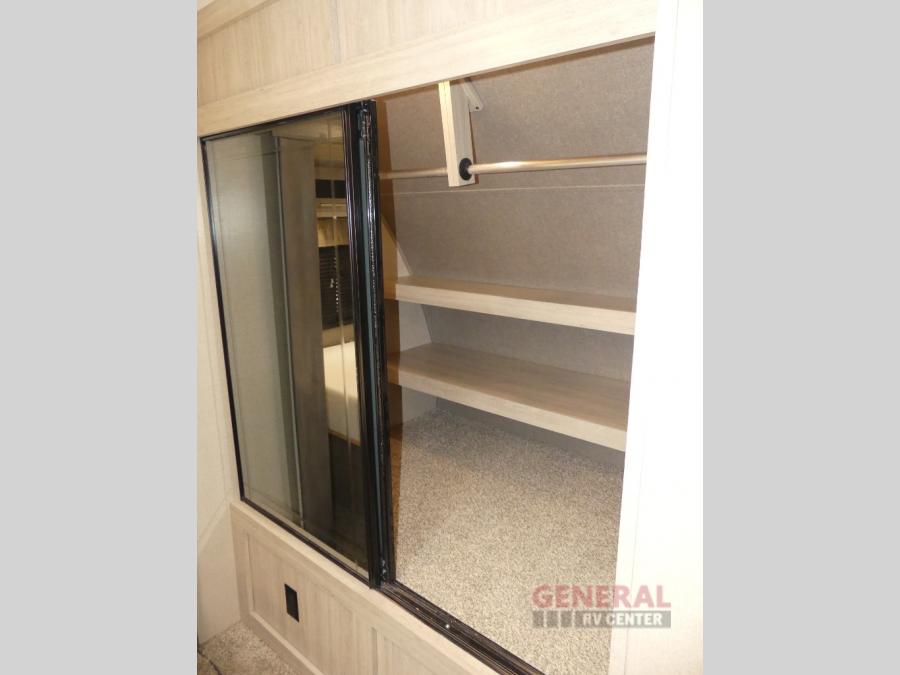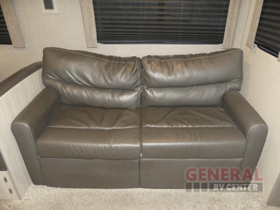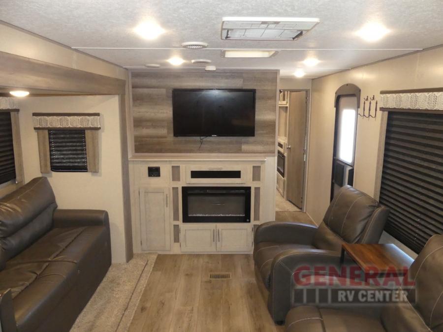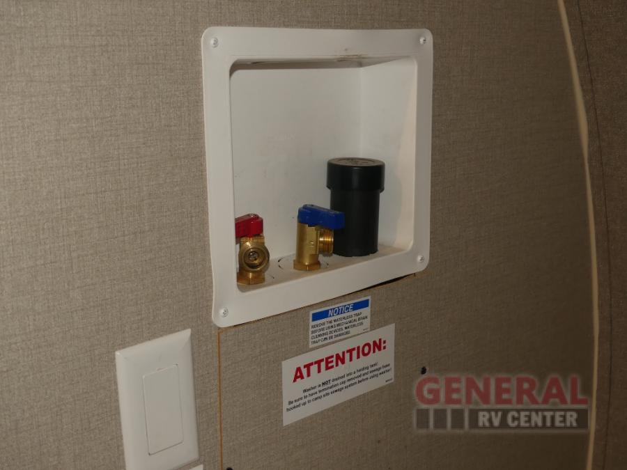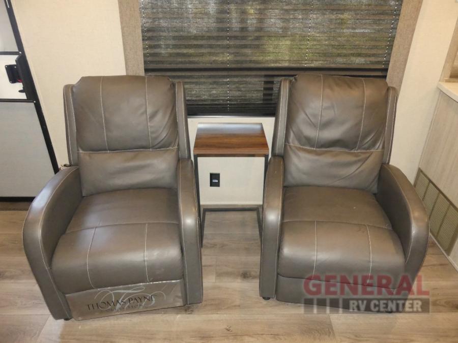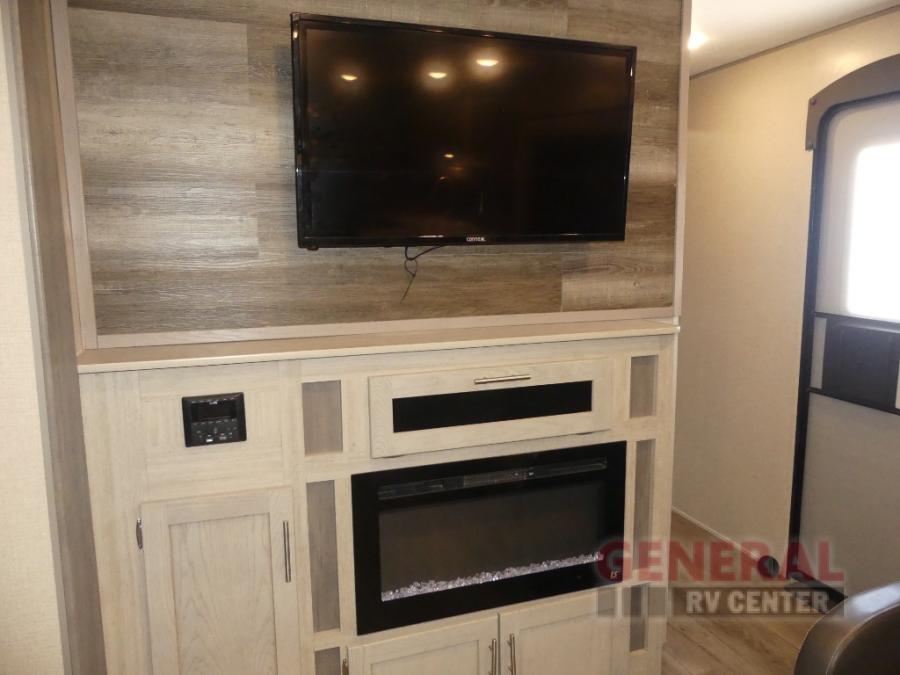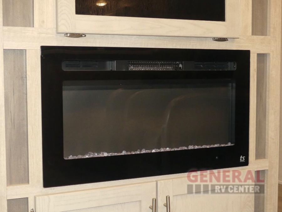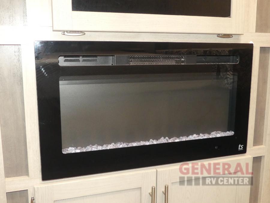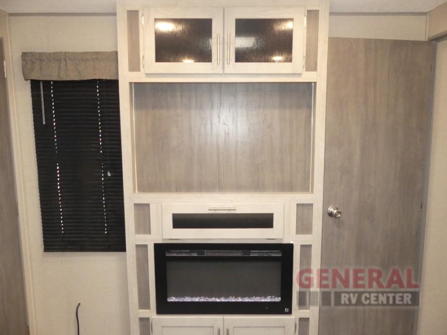 Enjoy relaxing under the 18' electric awning during the daytime for some protection from the sun, and at night with multicolor LED lights to set the mood for the evening. You can store beverages in the exterior mini fridge for convenience, and there is exterior storage for outdoor games and such. The interior is spacious with a large slide out booth dinette and sofa with drink holders. There is also a fireplace under the 39" TV. The two recliner lounges are sure to be a favorite spot, and the cook will love the rear kitchen including the U-shaped counter when preparing meals and drying the dishes. Now the front bedroom is unique with a fireplace, entertainment center, slide out queen bed with nightstands and a large front closet plus a closet prepped for a washer/dryer.