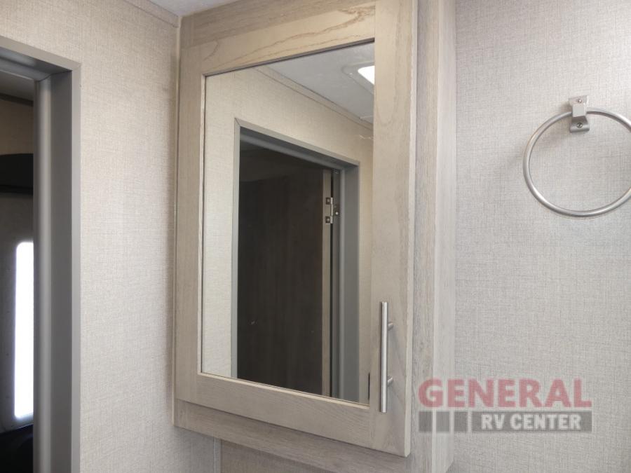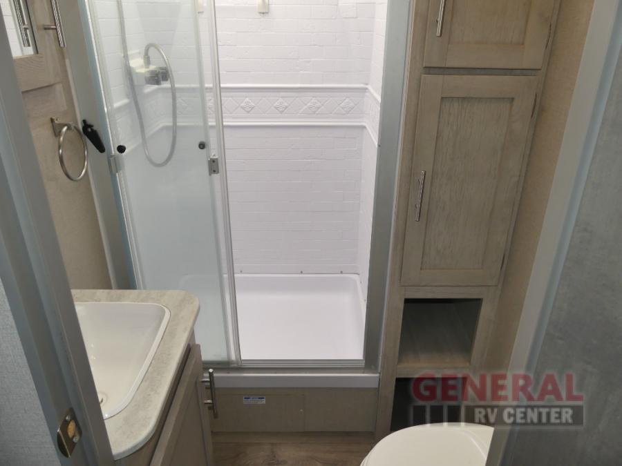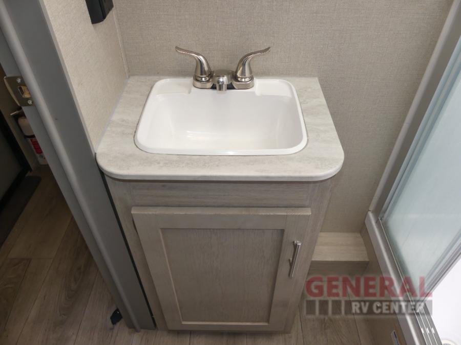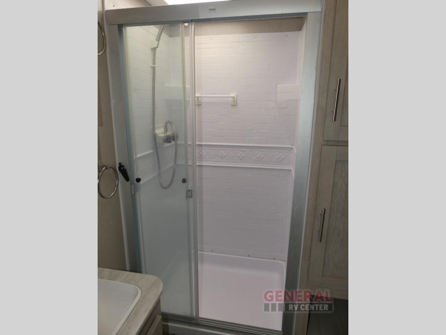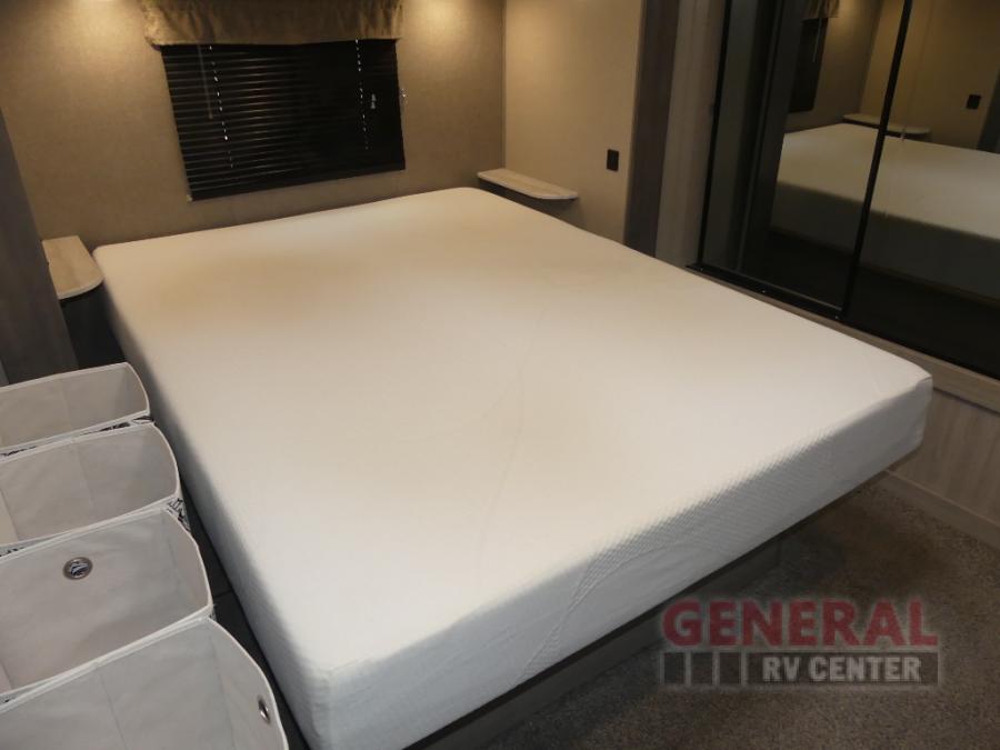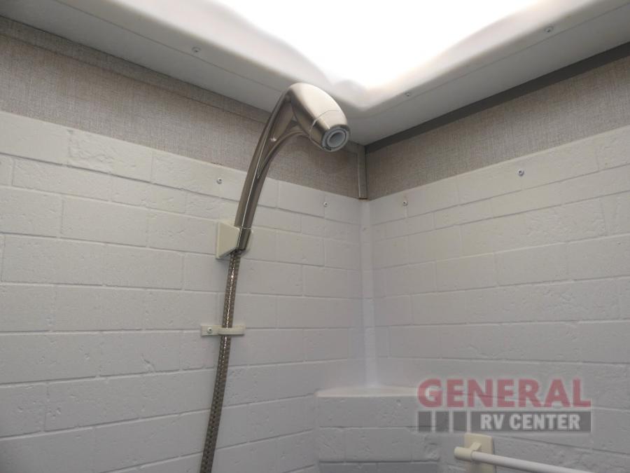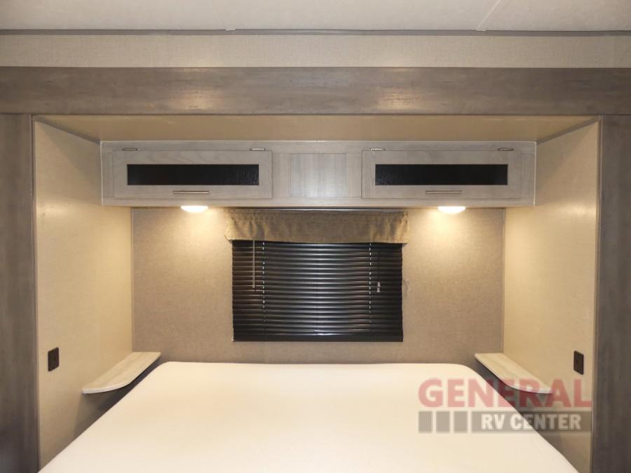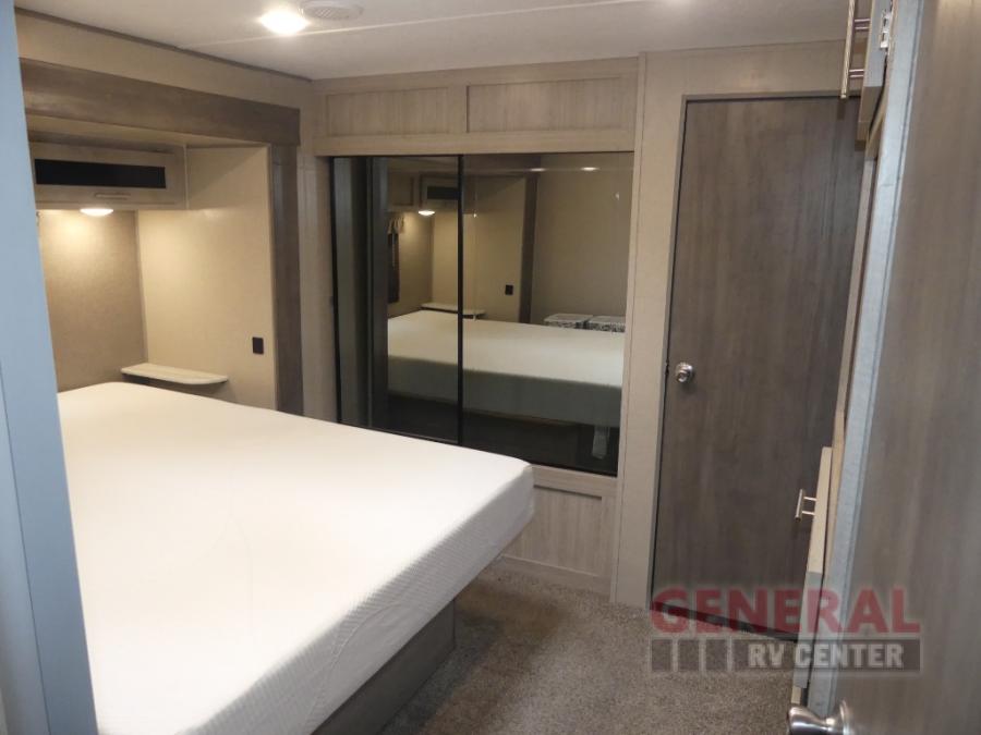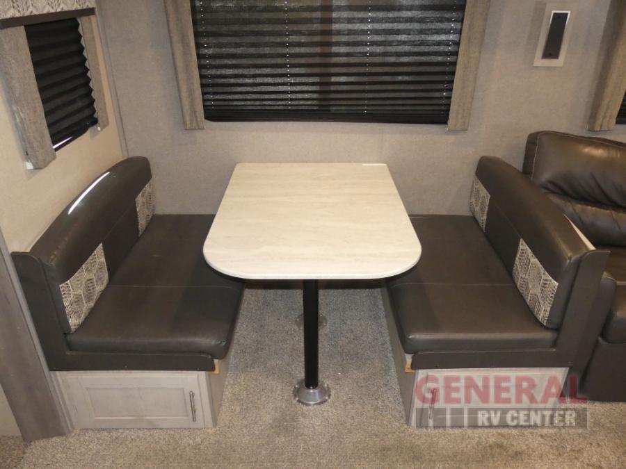 Enjoy relaxing under the 18' electric awning during the daytime for some protection from the sun, and at night with multicolor LED lights to set the mood for the evening. You can store beverages in the exterior mini fridge for convenience, and there is exterior storage for outdoor games and such. The interior is spacious with a large slide out booth dinette and sofa with drink holders. There is also a fireplace under the 39" TV. The two recliner lounges are sure to be a favorite spot, and the cook will love the rear kitchen including the U-shaped counter when preparing meals and drying the dishes. Now the front bedroom is unique with a fireplace, entertainment center, slide out queen bed with nightstands and a large front closet plus a closet prepped for a washer/dryer.