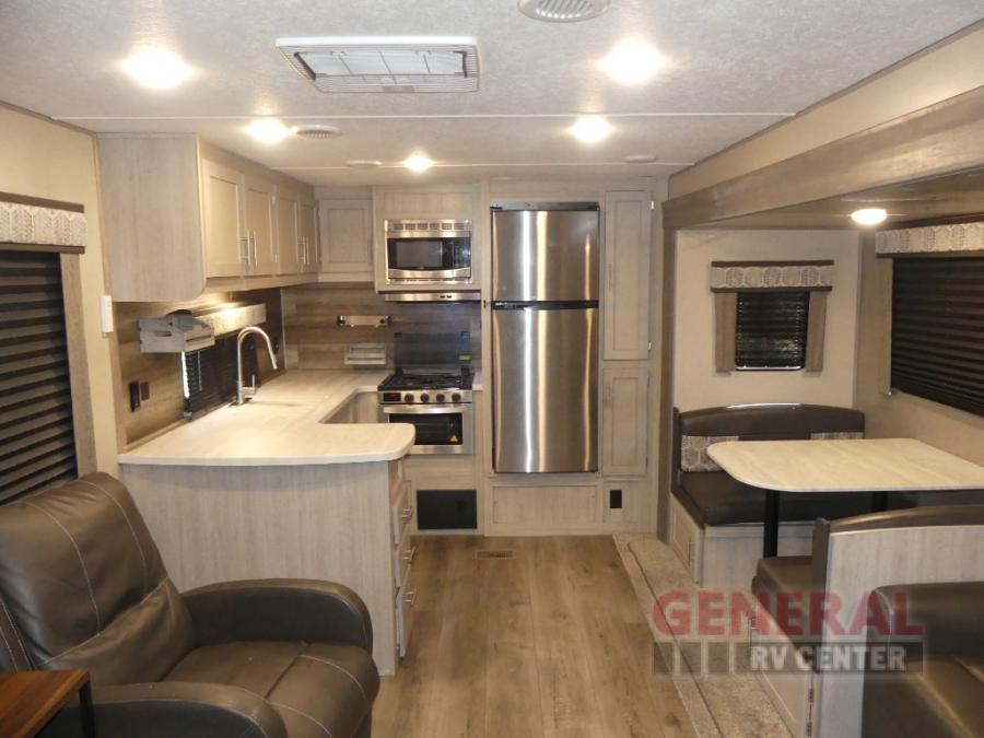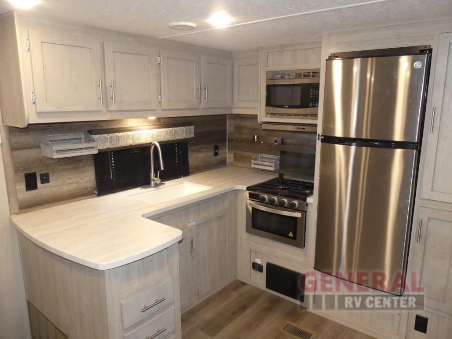 With any Catalina Legacy Edition travel trailer by Coachmen, there is an enclosed, fully sealed underbelly to protect against road debris and help control the interior climate, a seamless Alpha roof membrane, a platinum aluminum exterior, a smooth HD aluminum radius front, and polished HD aluminum fender skirts, plus upgraded aluminum wheels. The interior includes seamless Thermofoil countertops throughout, an under-mount farm style sink with residential kitchen faucet with pull down sprayer to easily clean the fruits and veggies as well as the dishes, full length kitchen drawer guides, and an All-In-One monitor panel system.