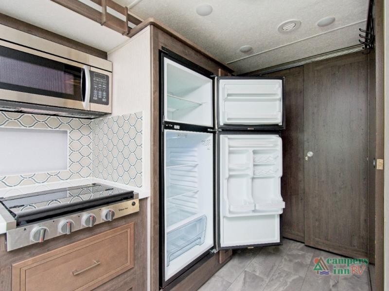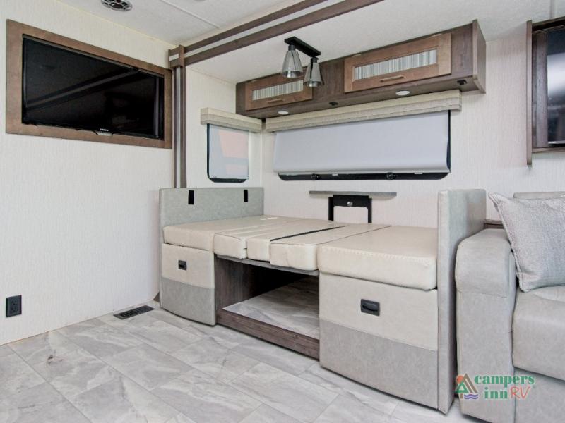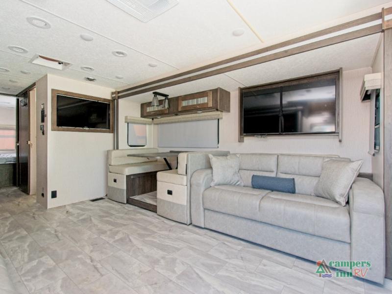 Inside, the fully equipped kitchen includes a farm-style sink, 12V refrigerator, and a 24" x 38" shower in the full bath—ideal for freshening up after a day of adventure. The 42" x 76" booth dinette and 68" sofa bed offer flexible seating and sleeping options, while the optional power theater seating adds even more comfort for movie nights on the 40" LED TV.
