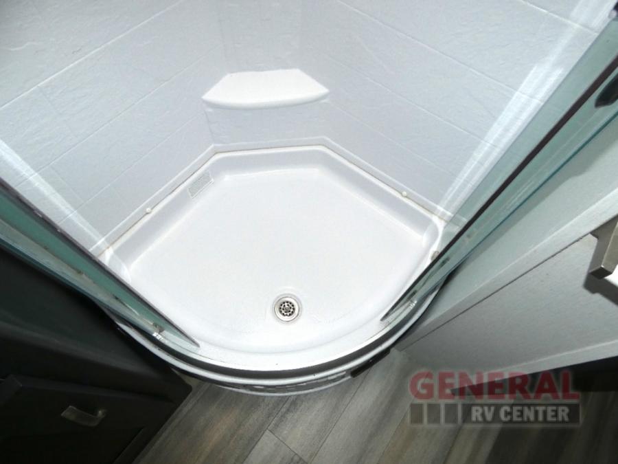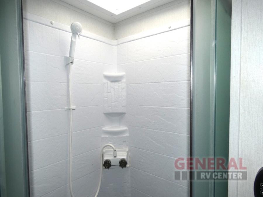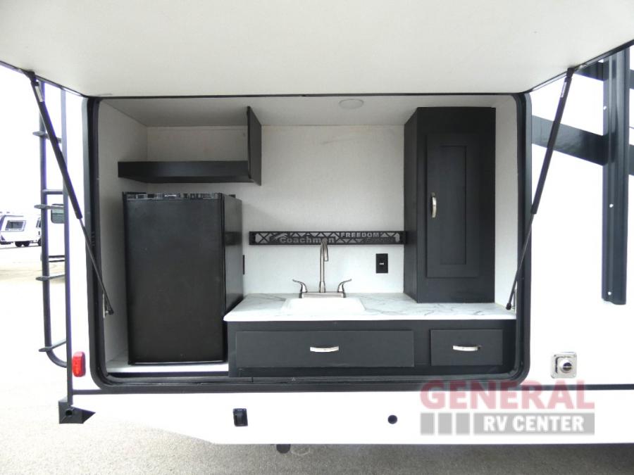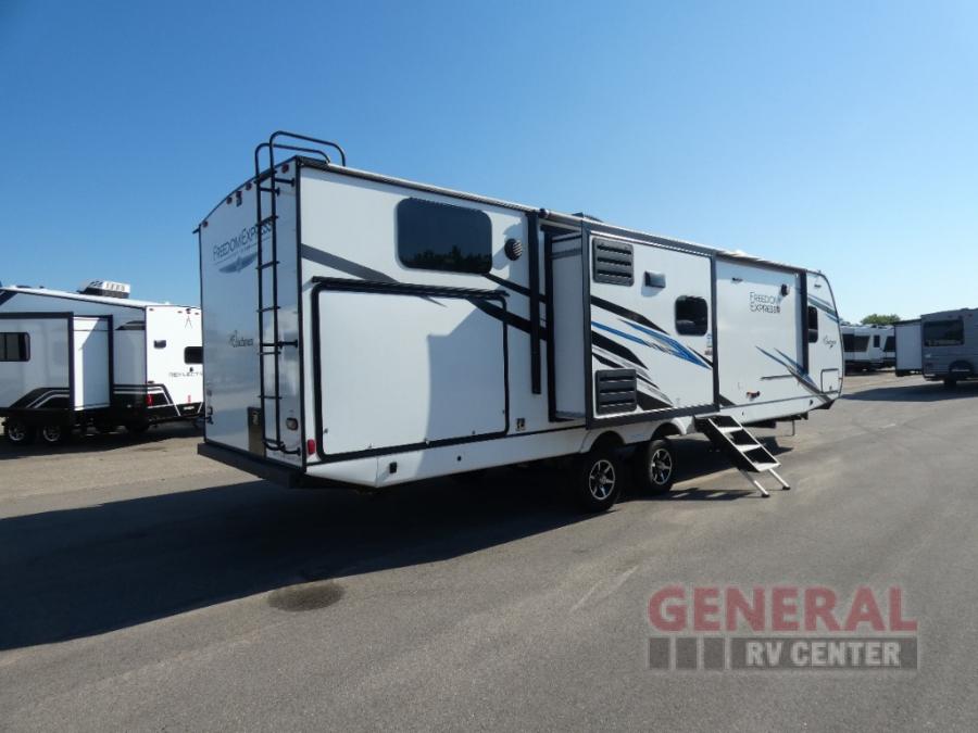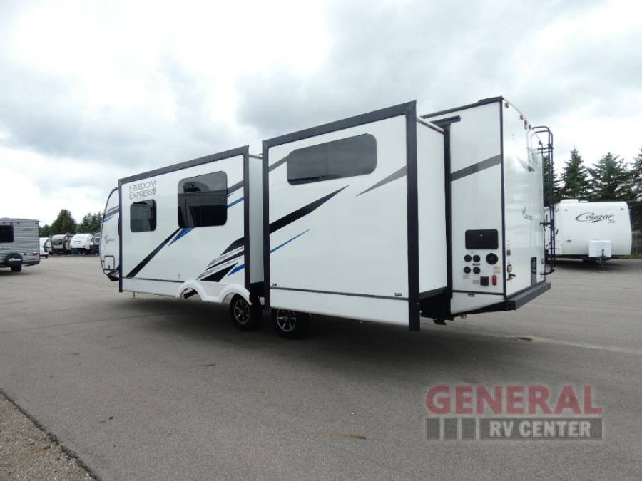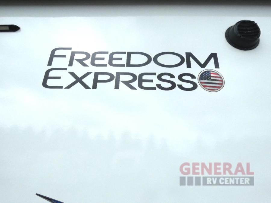 With any Freedom Express Maple Leaf Edition travel trailer by Coachmen you will appreciate lightweight and smooth towing thanks to the spread axle design, E-Z Lube axles, and alumicage construction. The full fiberglass front cap with an automotive glass windshield will grab your attention, and the full pass-through storage allows you to bring along larger camp gear. Each model includes an exterior shower, Keyed-A-Like locks, and a pet leash/bottle opener for extra convenience. Inside, you'll find an impressive 81" interior height, stylish kitchen backsplash, a designer bedspread with matching pillows to make you feel more at home, plus roller shades for added privacy.