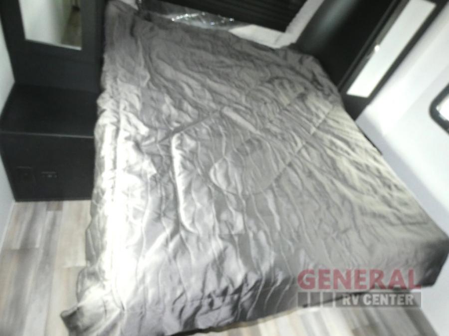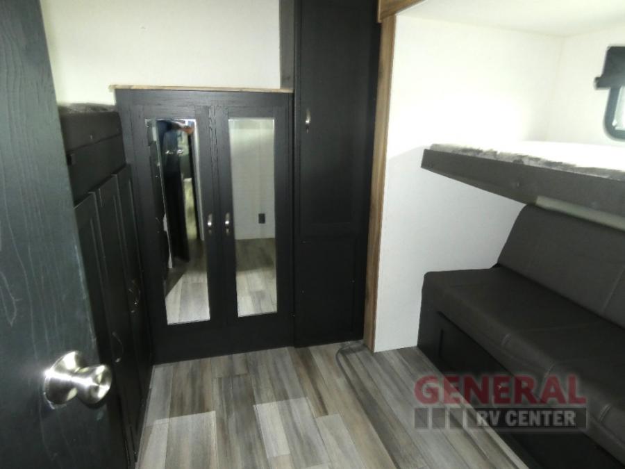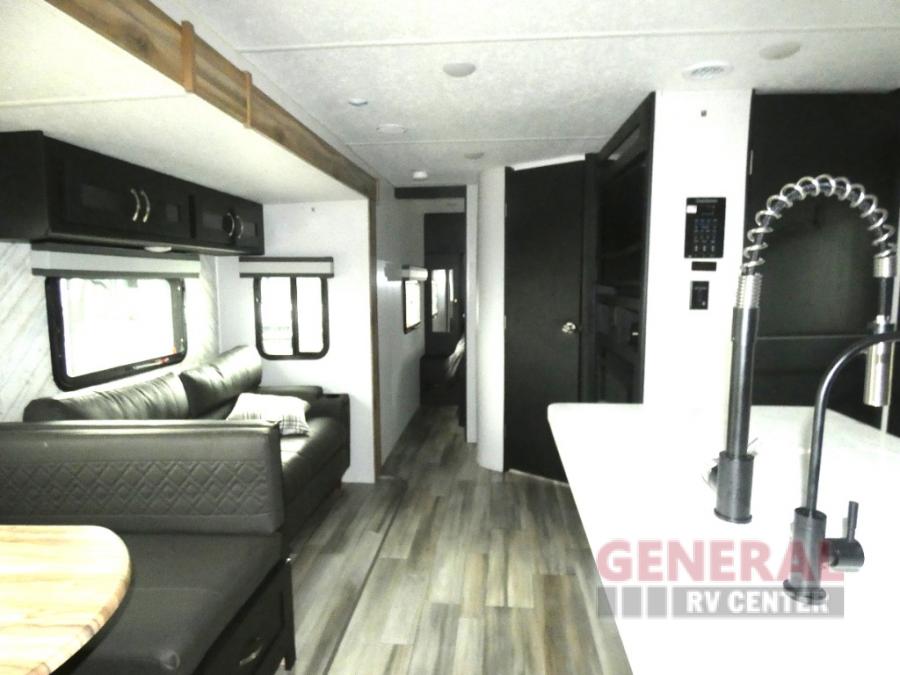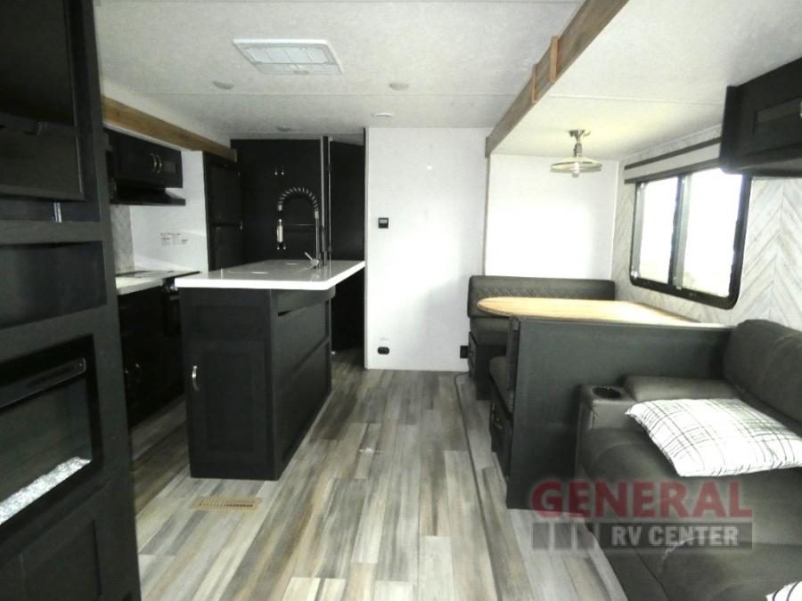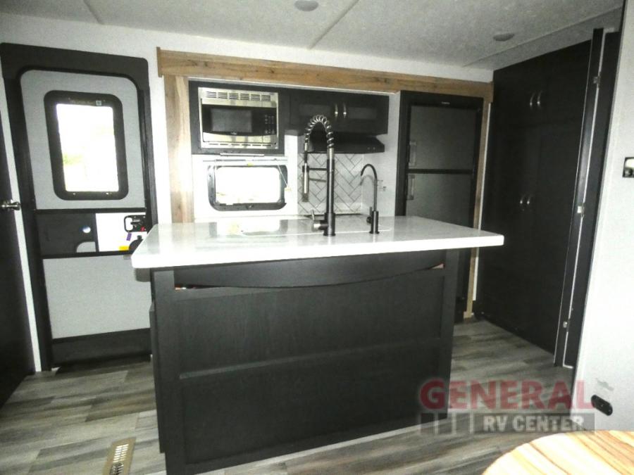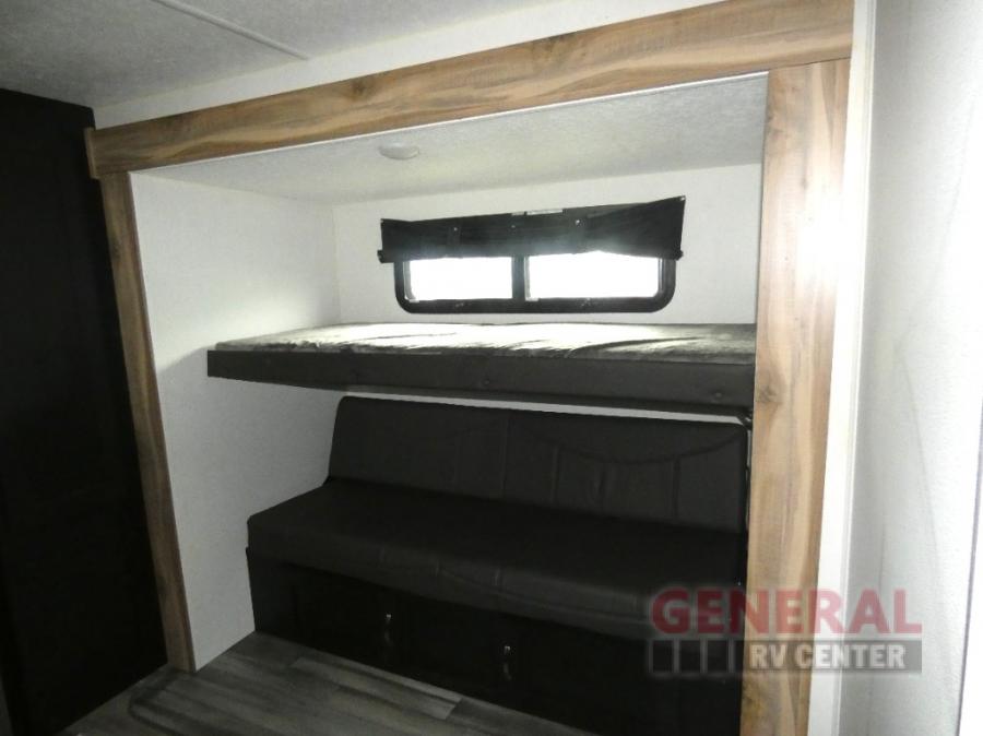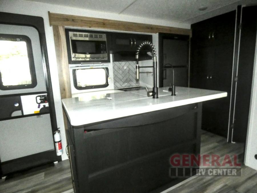 Wow, check out this triple slide out travel trailer that can sleep eight people each night. Your guests will have the rear bunkhouse with two bunks and a roll-over sofa. The dual entry bath will create a front master bedroom you are sure to love, especially with a queen bed and dual wardrobes. A kitchen island will provide more counter space, and the booth dinette can be used as dining space when you aren't eating outdoors at the picnic table. And don't forget to check out the exterior with its full camp kitchen, 20' power awning, and full pass through storage!