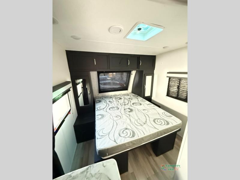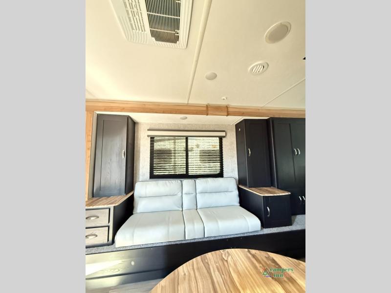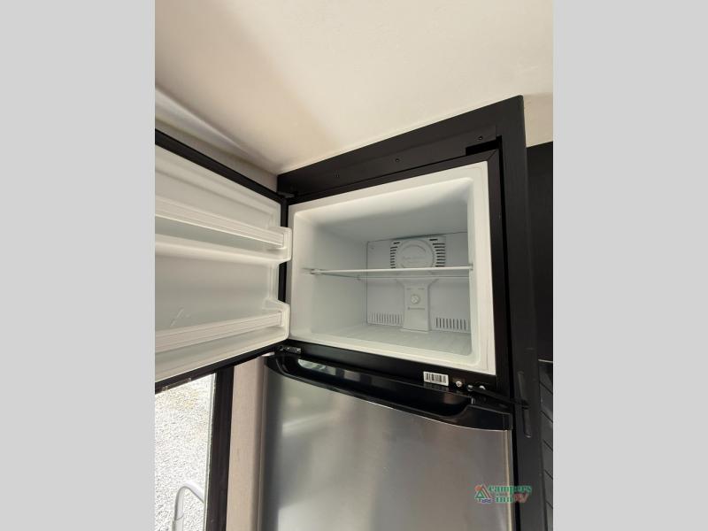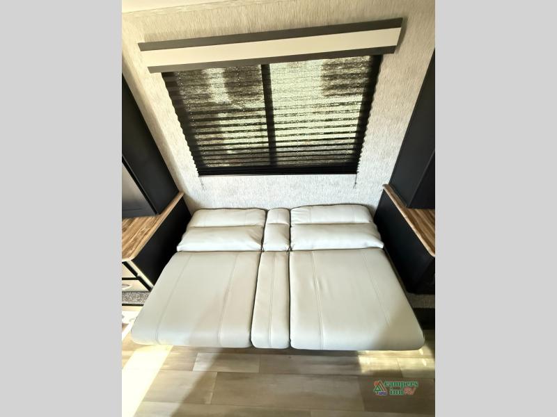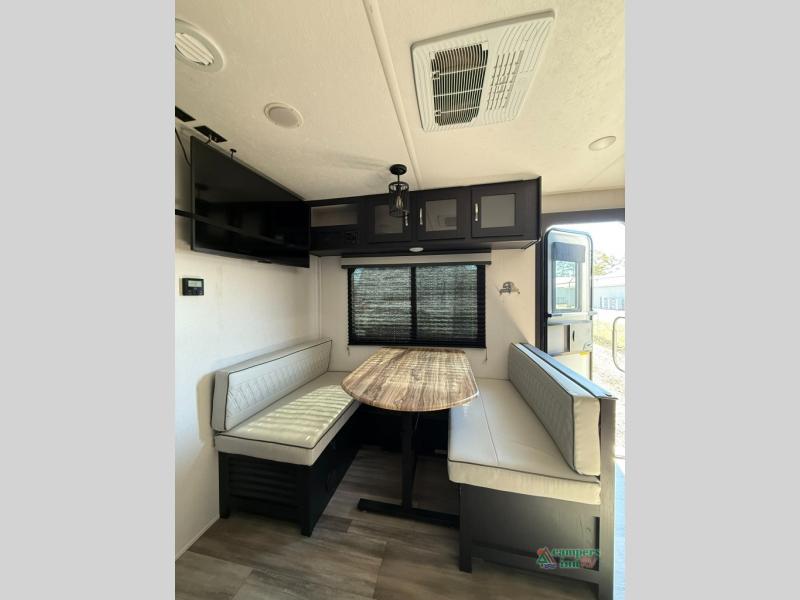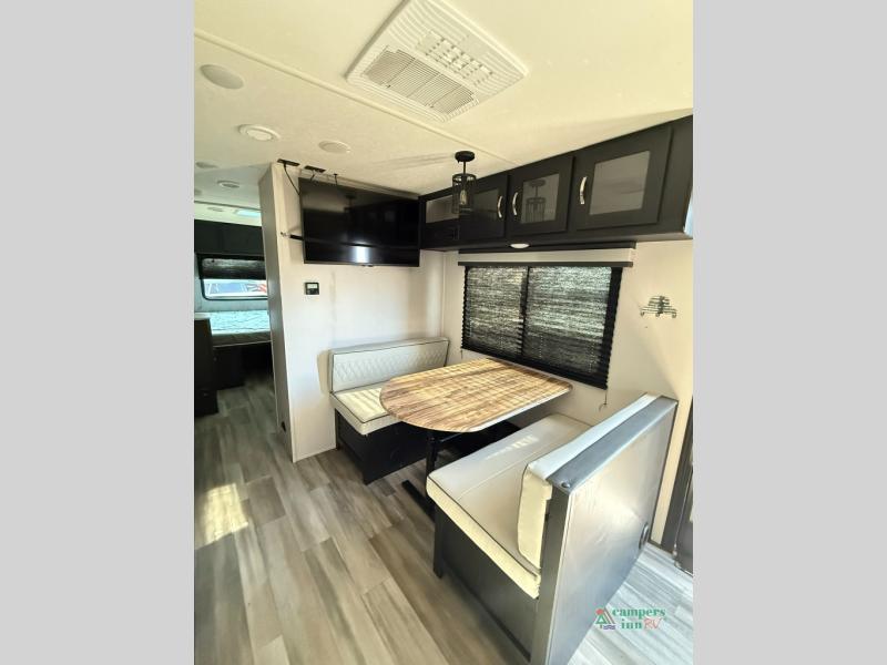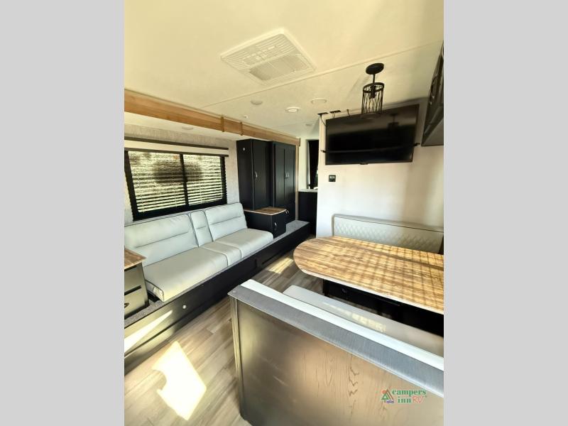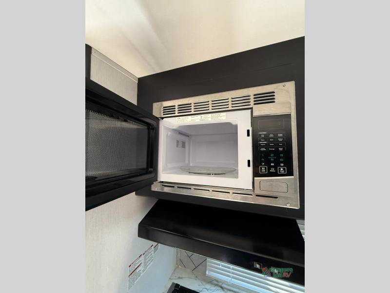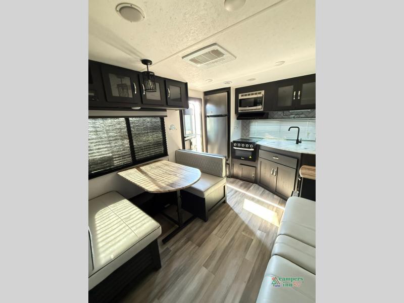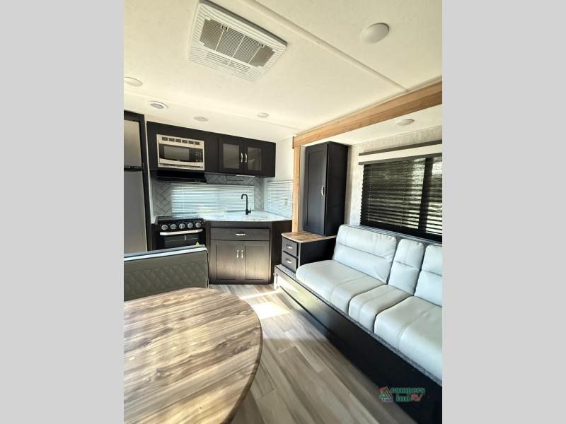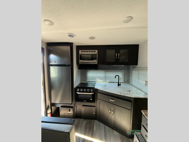 Check out this rear kitchen travel trailer that can sleep three to four each night. The front semi-private bedroom includes a privacy curtain and a queen bed with vaulted under-bed storage for your belongings. The sofa within the large slide out and the booth dinette will provide comfortable seating space, and there is an LED TV for those rainy camp days. This model also includes a three burner cooktop, a microwave oven, and an 8 cu. ft. double door refrigerator for your perishables. And don't forget about the 18' power awning with LED lights!