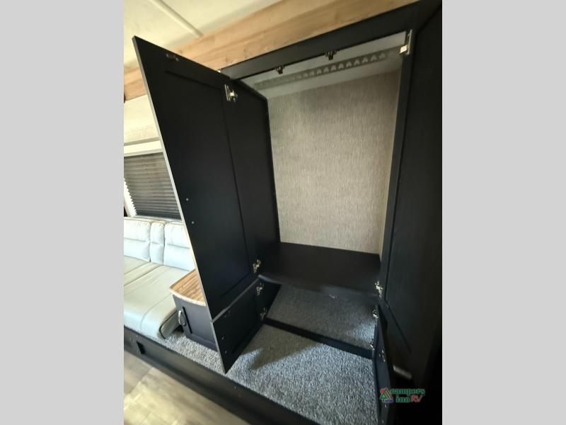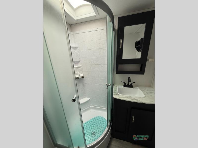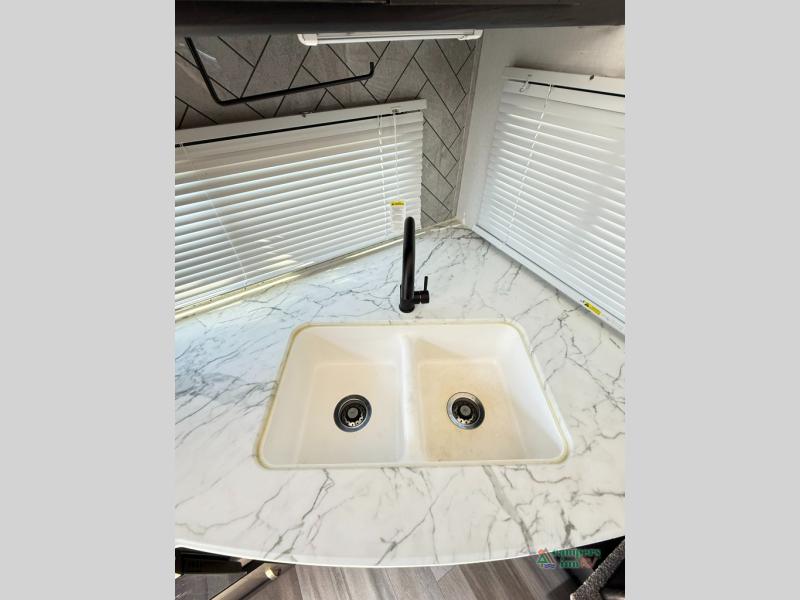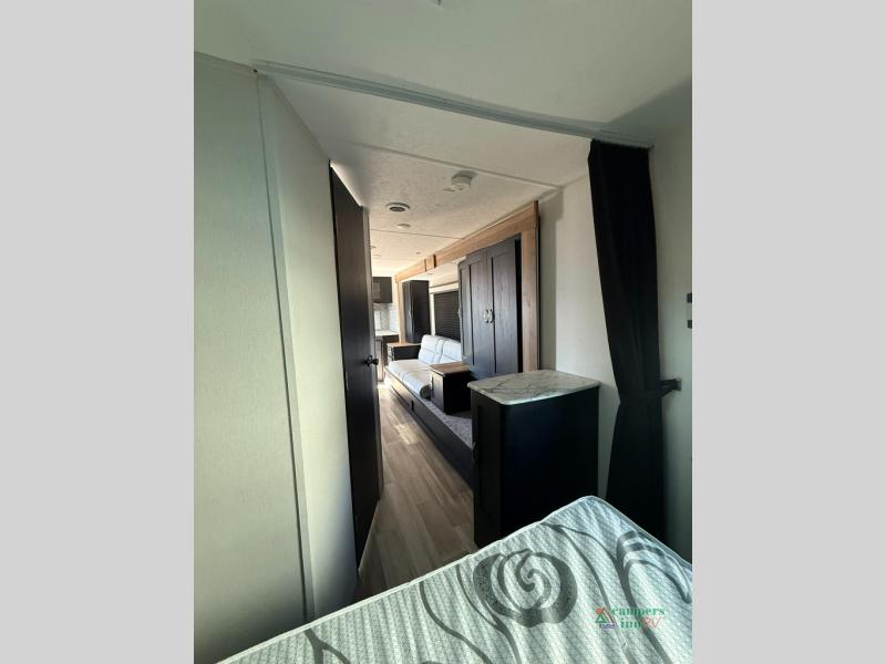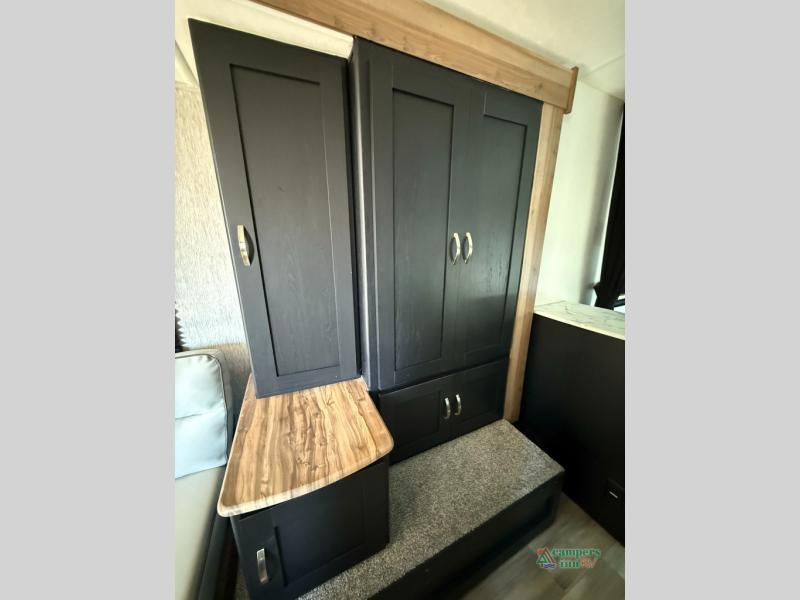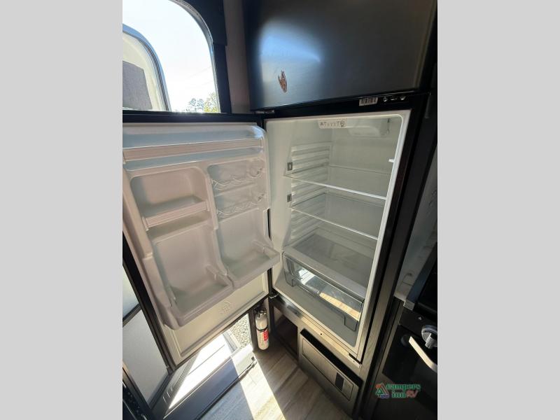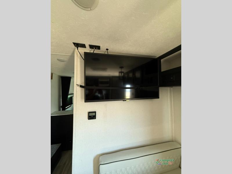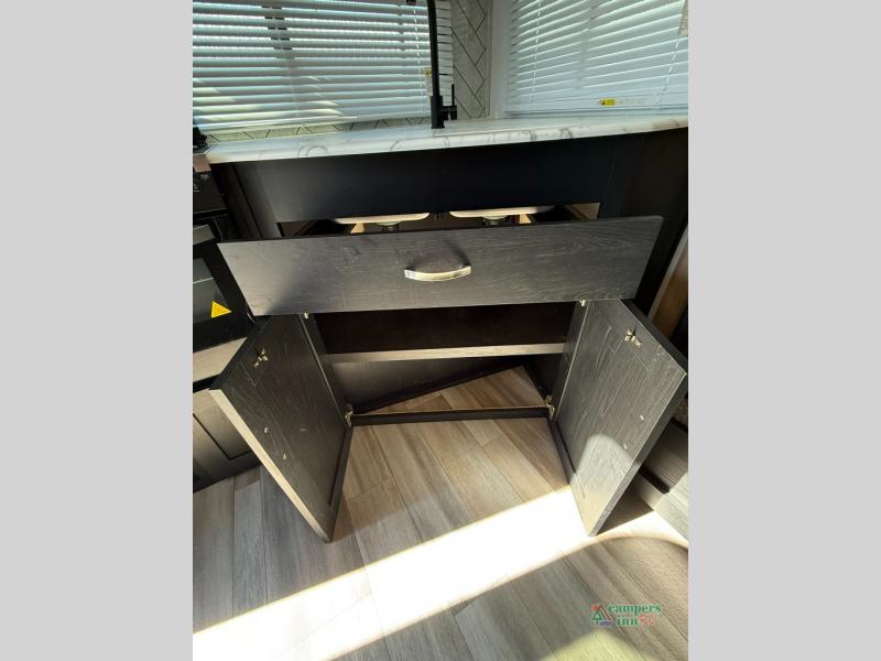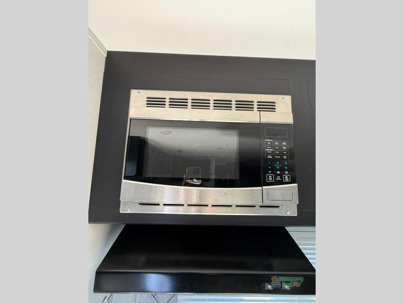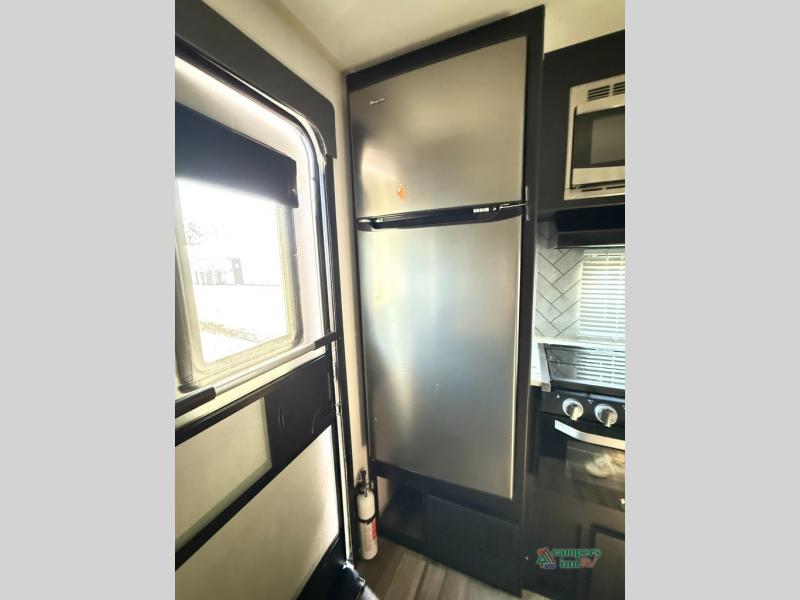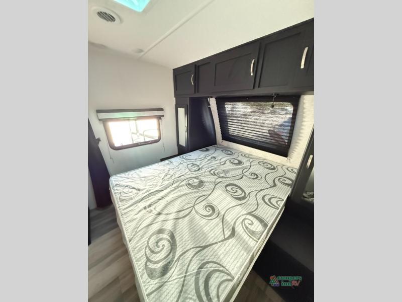 Check out this rear kitchen travel trailer that can sleep three to four each night. The front semi-private bedroom includes a privacy curtain and a queen bed with vaulted under-bed storage for your belongings. The sofa within the large slide out and the booth dinette will provide comfortable seating space, and there is an LED TV for those rainy camp days. This model also includes a three burner cooktop, a microwave oven, and an 8 cu. ft. double door refrigerator for your perishables. And don't forget about the 18' power awning with LED lights!