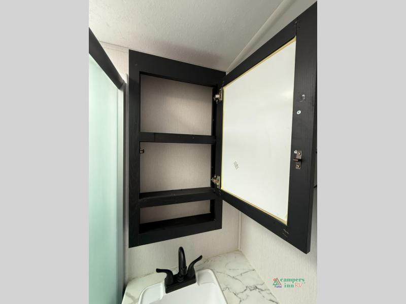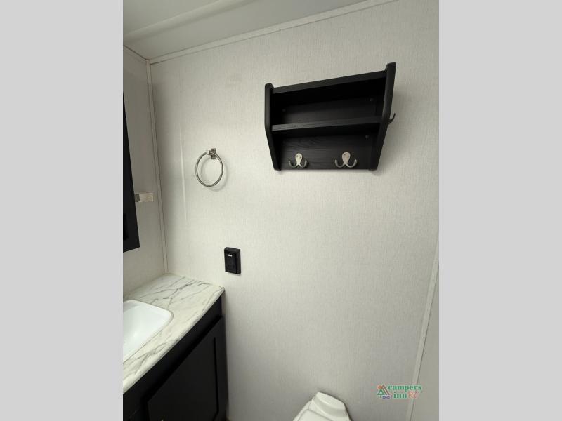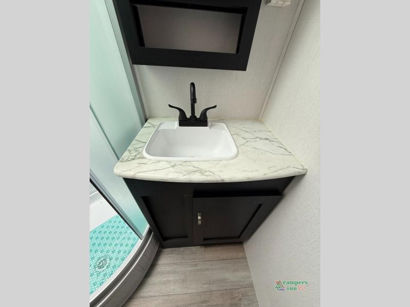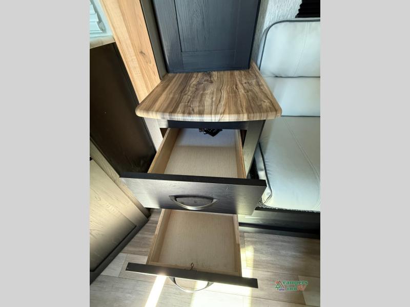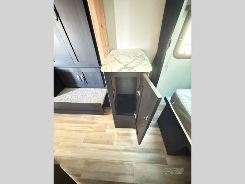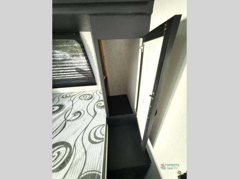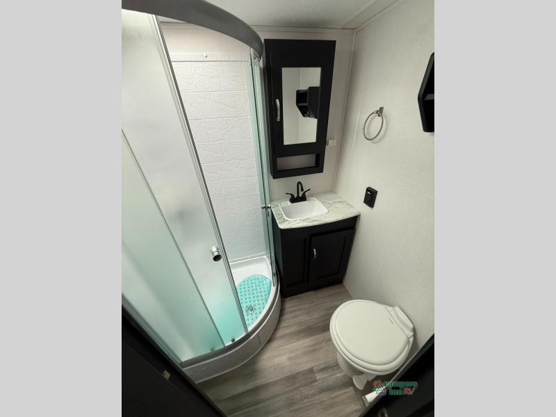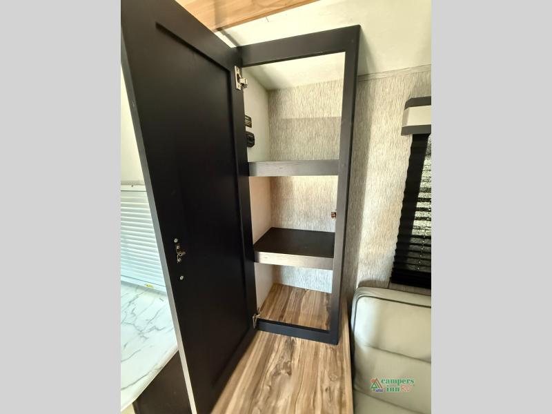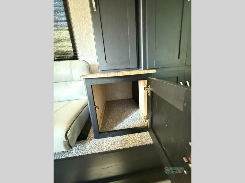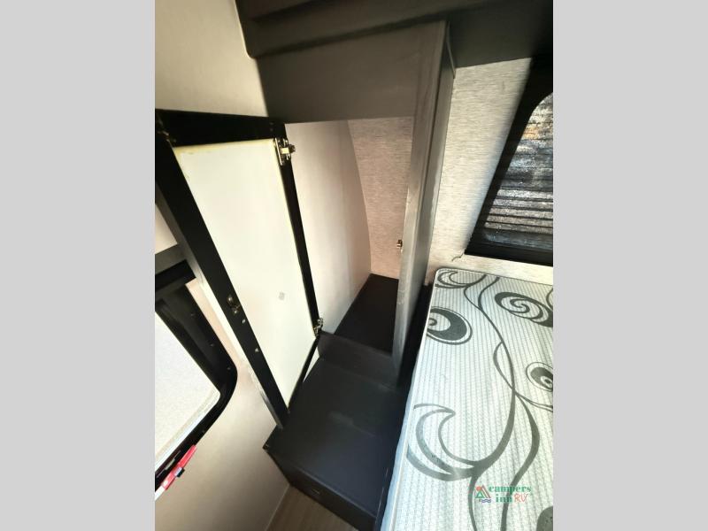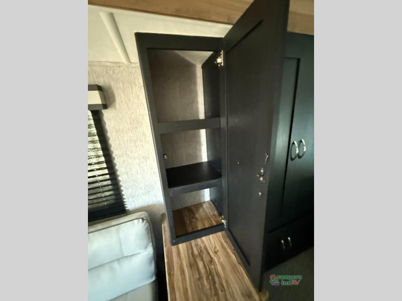Check out this rear kitchen travel trailer that can sleep three to four each night. The front semi-private bedroom includes a privacy curtain and a queen bed with vaulted under-bed storage for your belongings. The sofa within the large slide out and the booth dinette will provide comfortable seating space, and there is an LED TV for those rainy camp days. This model also includes a three burner cooktop, a microwave oven, and an 8 cu. ft. double door refrigerator for your perishables. And don't forget about the 18' power awning with LED lights!
