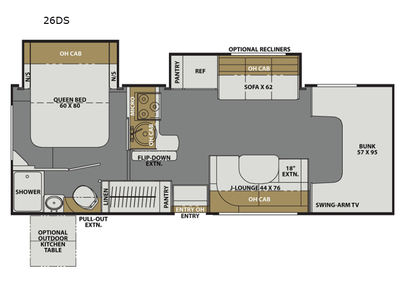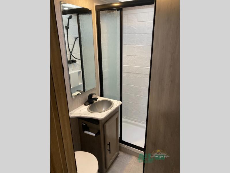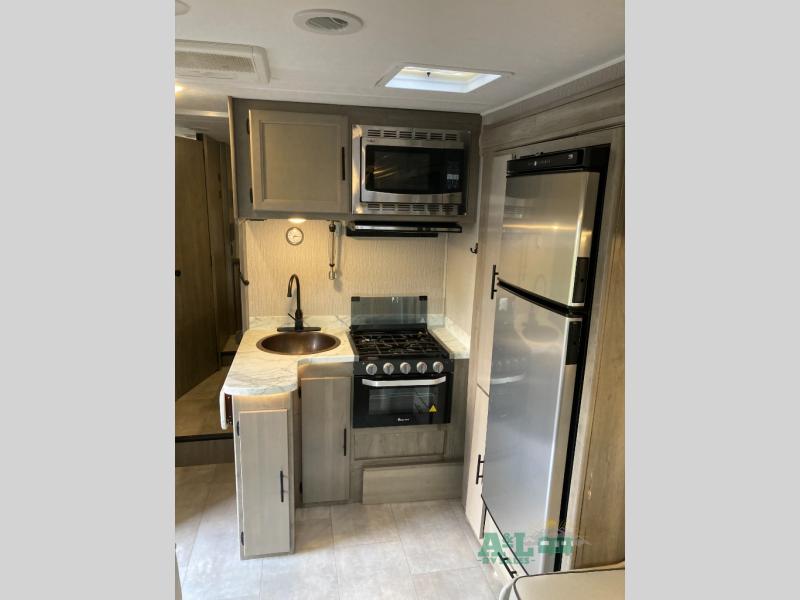 Plan your adventures across the states in this comfortable coach that can sleep six to seven people each night. Once you park at the campsite you can make lunch on the three burner cooktop, then dine at the J-lounge or relax on the sofa slide out. There is a 32" swing-arm TV in the overhead area if you enjoy movies at night, or you may just find yourselves outside under the 18' power awning with LED lights. And you can add the optional outdoor kitchen table to set out items for lunch. When you're ready to call it a night, head to the private bedroom that includes a queen bed slide out, but don't forget to clean up in the full bath before bedtime!