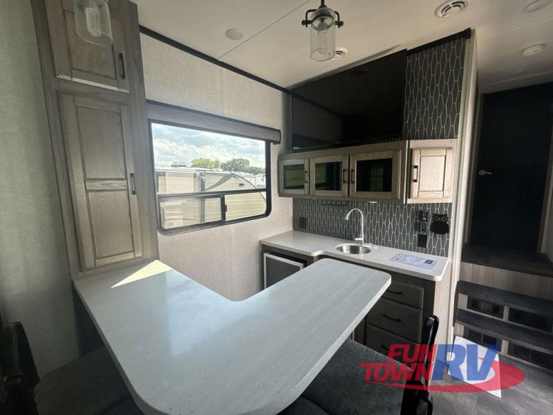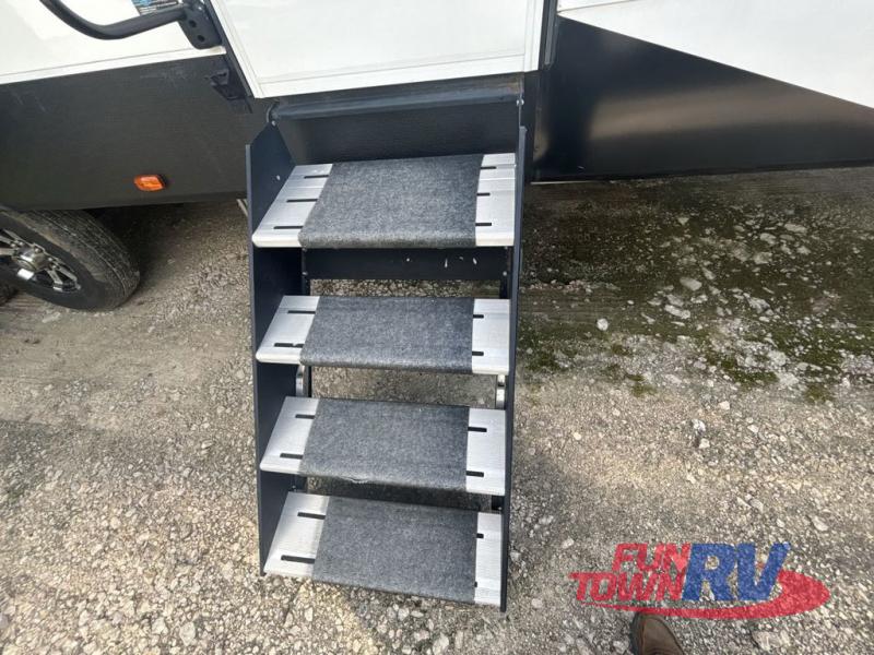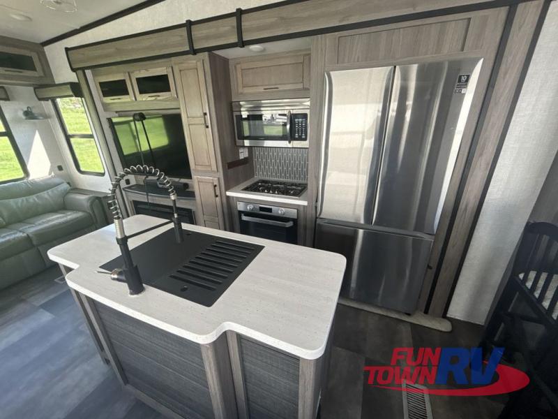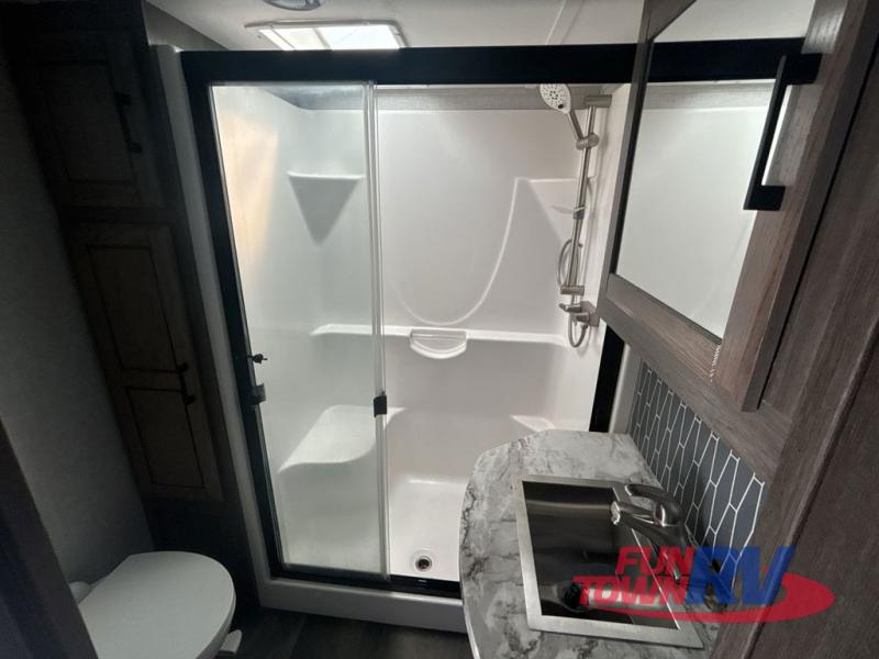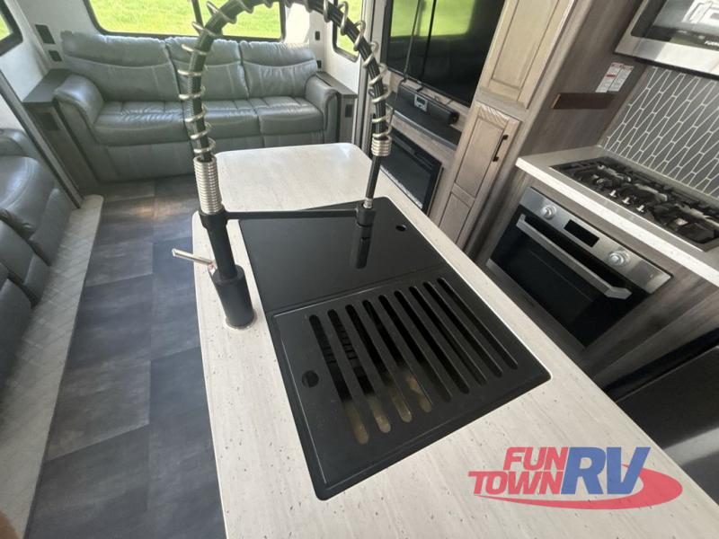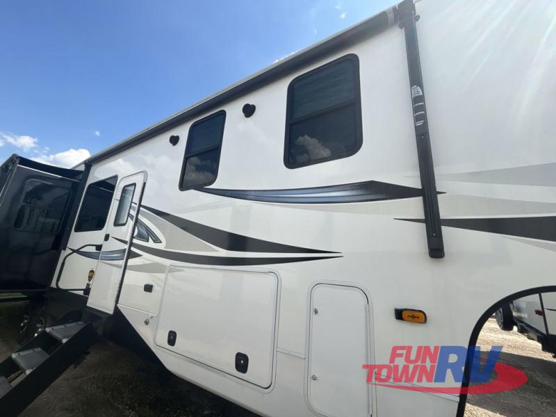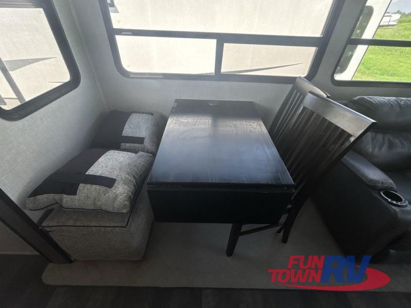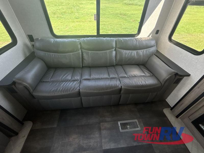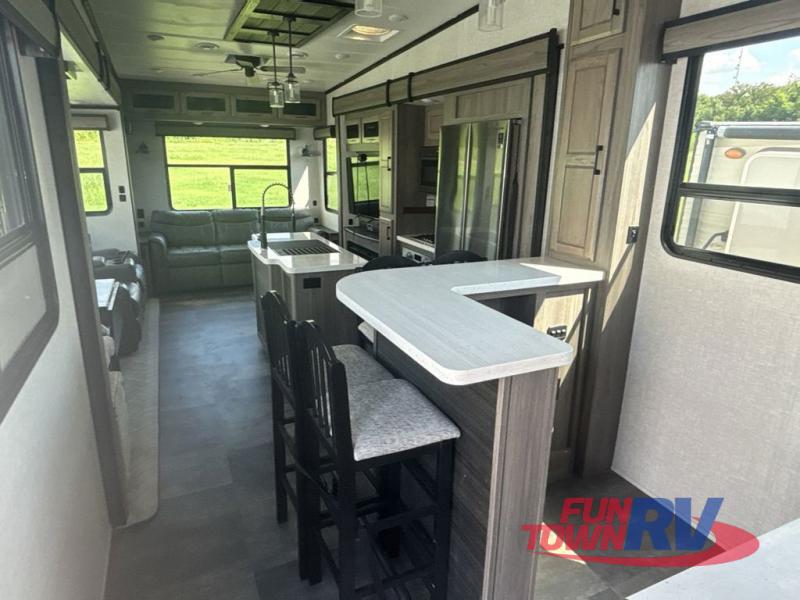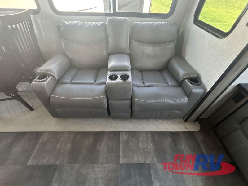 You will be the talk of the campground with this fifth wheel! The personal bar area has a bar top with four bar stools to socialize while the bartender whips up a few drinks with the wet bar and wine cooler. With a kitchen island, you have more space to prepare your best meals and the dinette offers a comfortable place to enjoy them then play a card game or two. The rear living area is the perfect place to wind down your nights by relaxing on either the rear tri-fold sofa or the power theater seating across from the entertainment center with a fireplace and a 50" TV to watch your movies. The 48" shower with a seat in the full bathroom welcomes you to a nice, hot shower. Get ready for bed in the front private bedroom with a dresser base that has a fireplace, a 39" TV, and a bench seat next to it. You can even extend your trip with clean clothes if you add the optional washer and dryer to the prepped area in the front closet!