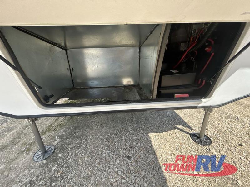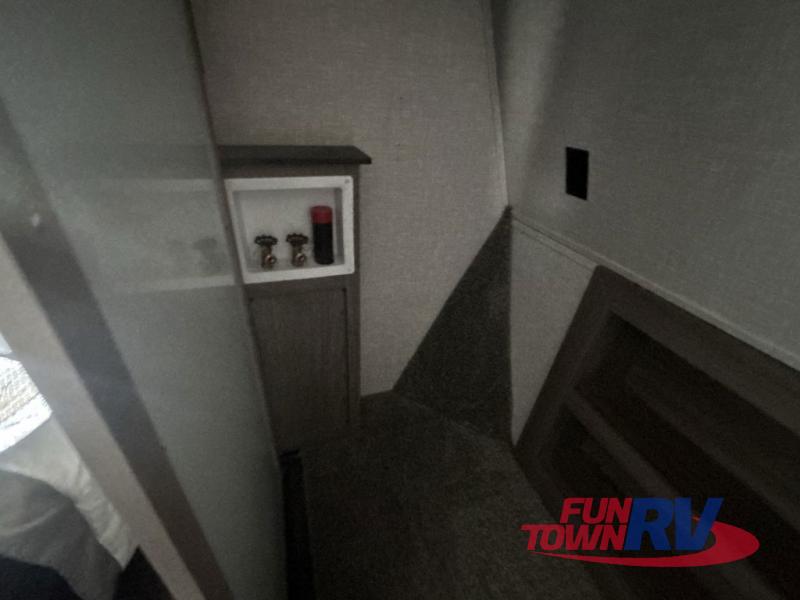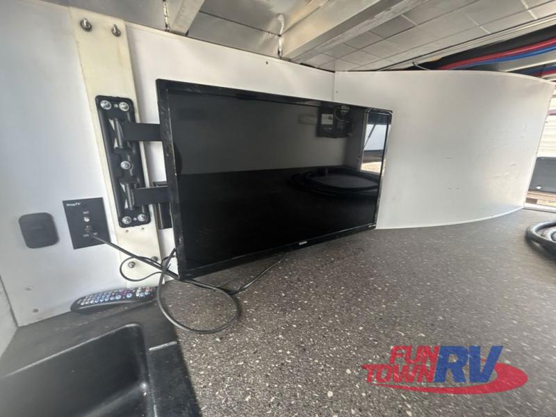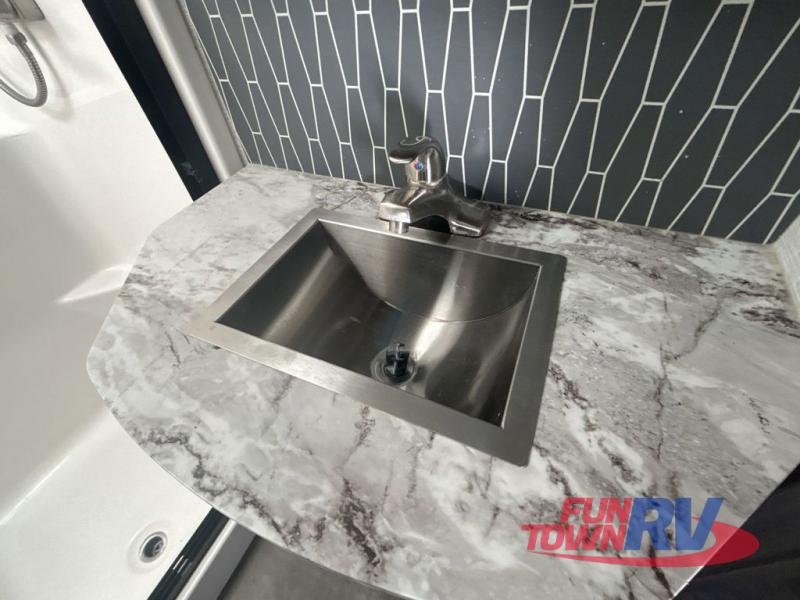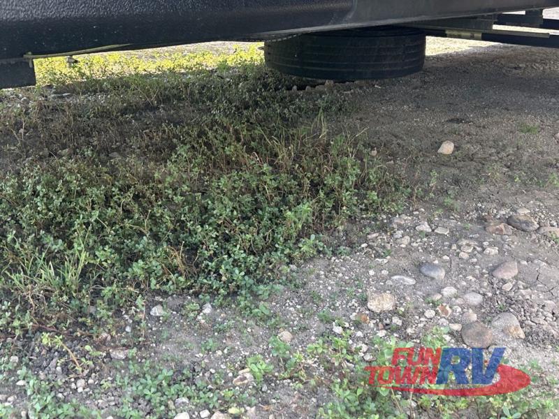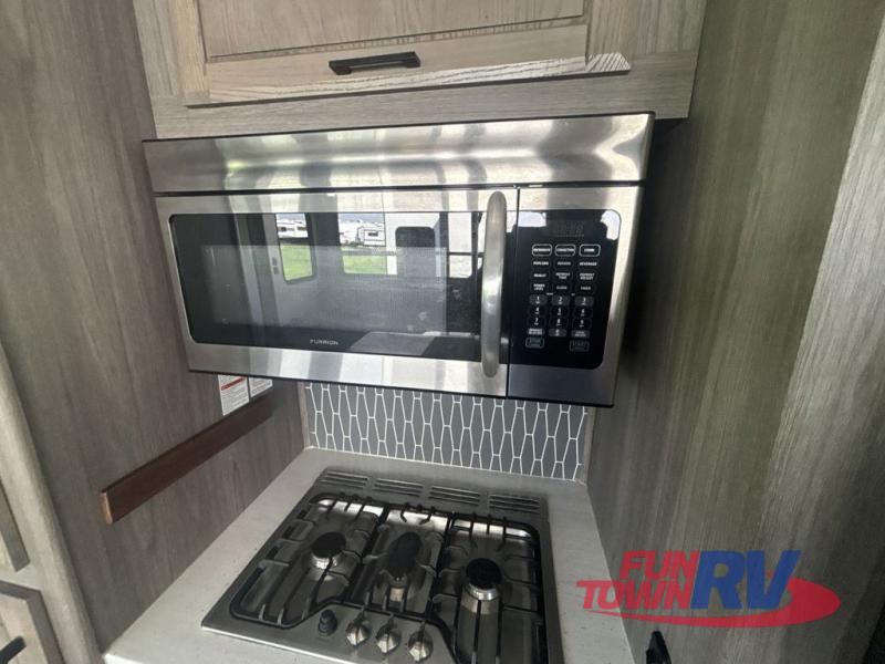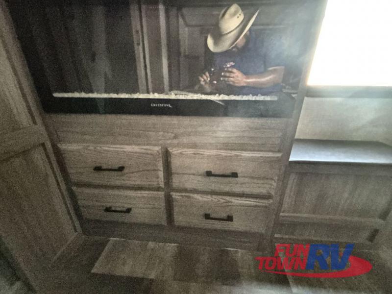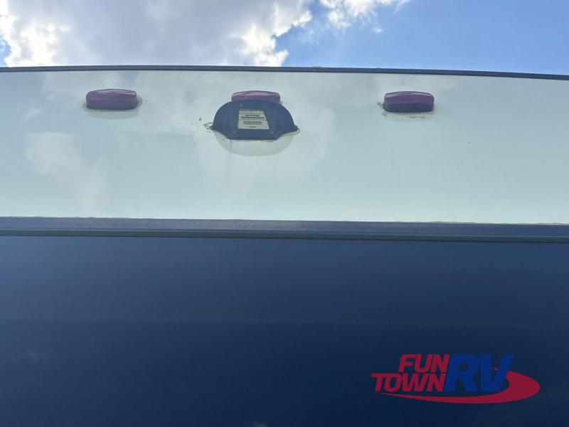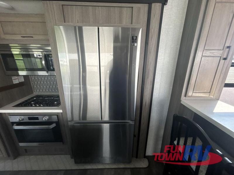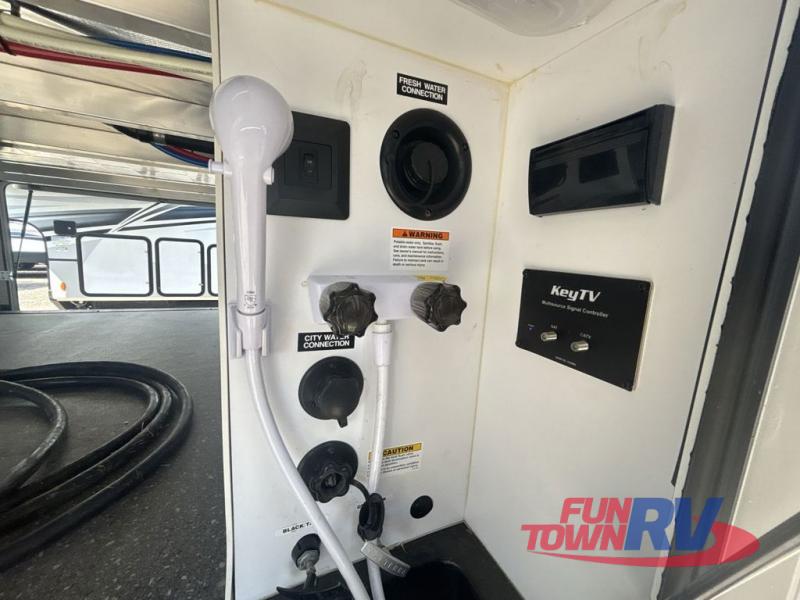 You will be the talk of the campground with this fifth wheel! The personal bar area has a bar top with four bar stools to socialize while the bartender whips up a few drinks with the wet bar and wine cooler. With a kitchen island, you have more space to prepare your best meals and the dinette offers a comfortable place to enjoy them then play a card game or two. The rear living area is the perfect place to wind down your nights by relaxing on either the rear tri-fold sofa or the power theater seating across from the entertainment center with a fireplace and a 50" TV to watch your movies. The 48" shower with a seat in the full bathroom welcomes you to a nice, hot shower. Get ready for bed in the front private bedroom with a dresser base that has a fireplace, a 39" TV, and a bench seat next to it. You can even extend your trip with clean clothes if you add the optional washer and dryer to the prepped area in the front closet!