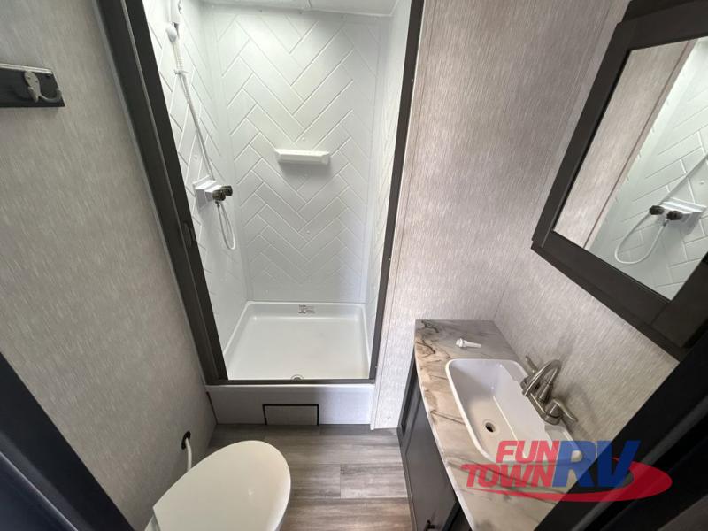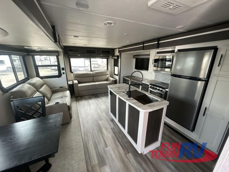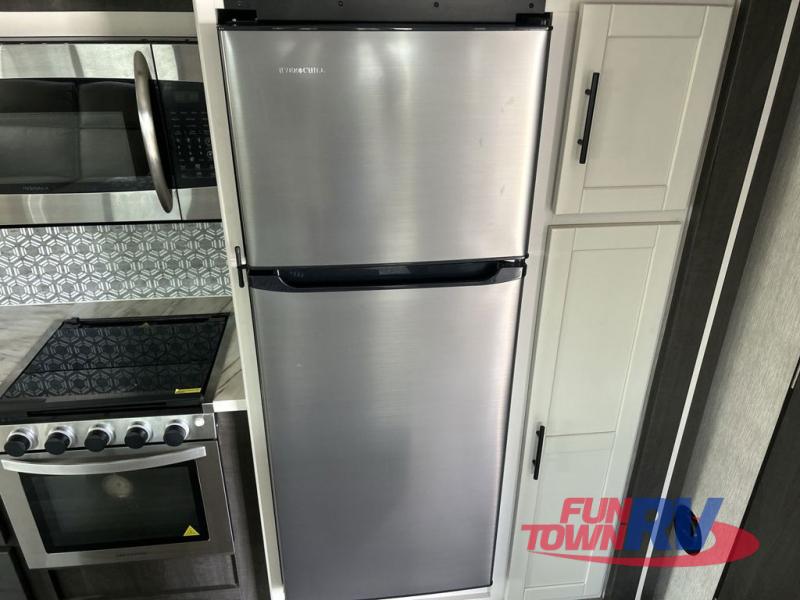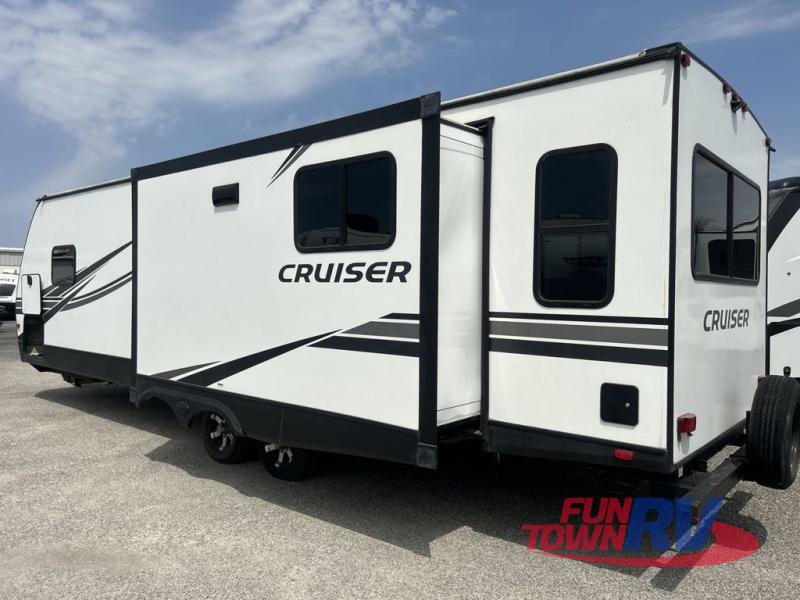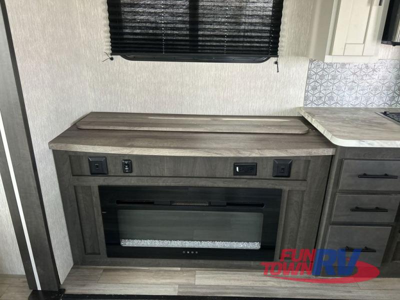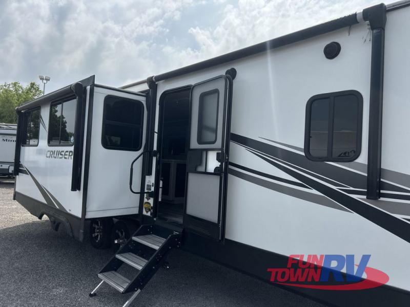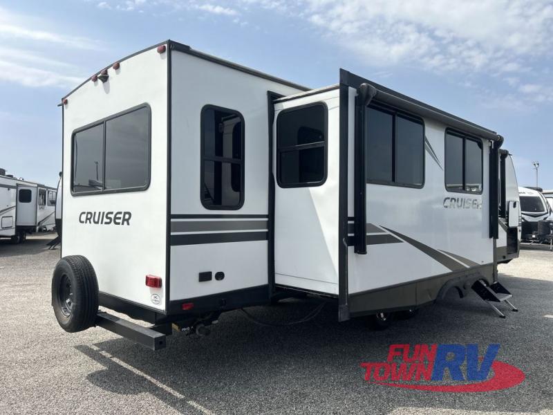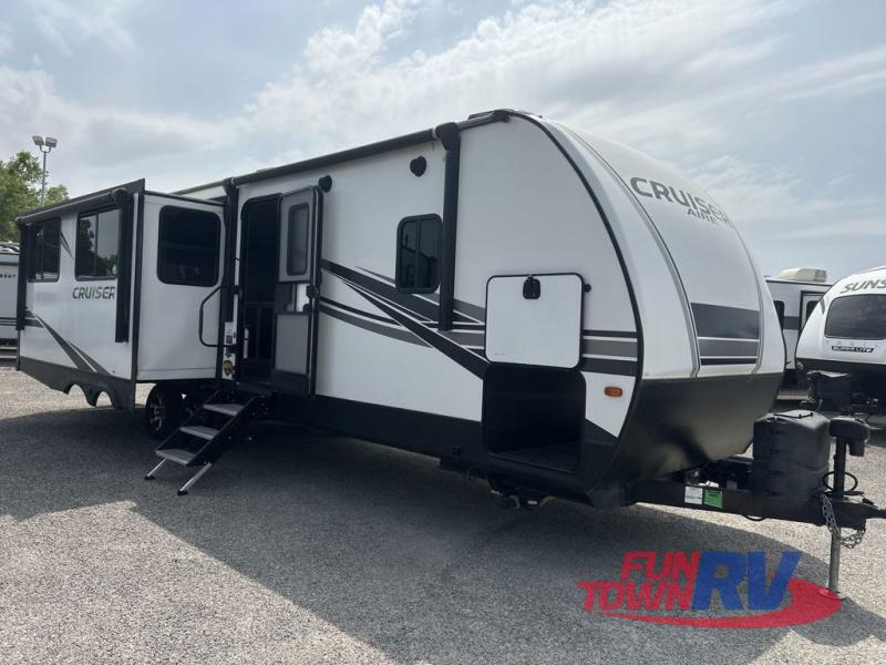 Each one of these CrossRoads RV Cruiser Aire fifth wheels and travel trailers have high end features incorporated into them! Some of these features include a Secure Stance entry step, pass-through storage with magnetic slam latch doors to keep your gear stored safely, and electric awnings with LED lights to highlight the good times at night. Their construction consists of a one piece seamless super flex roof, a five sided aluminum construction, and an aerodynamic painted front cap for an easier tow. Stay connected where ever you go with the HD digital TV antenna with Winegard Wifi prep. The luxurious interiors are filled with at home comforts like Chef Collection appliances, full trunk storage under the king bed, and fireplaces depending on the model. Come find the perfect one for you and your family today!