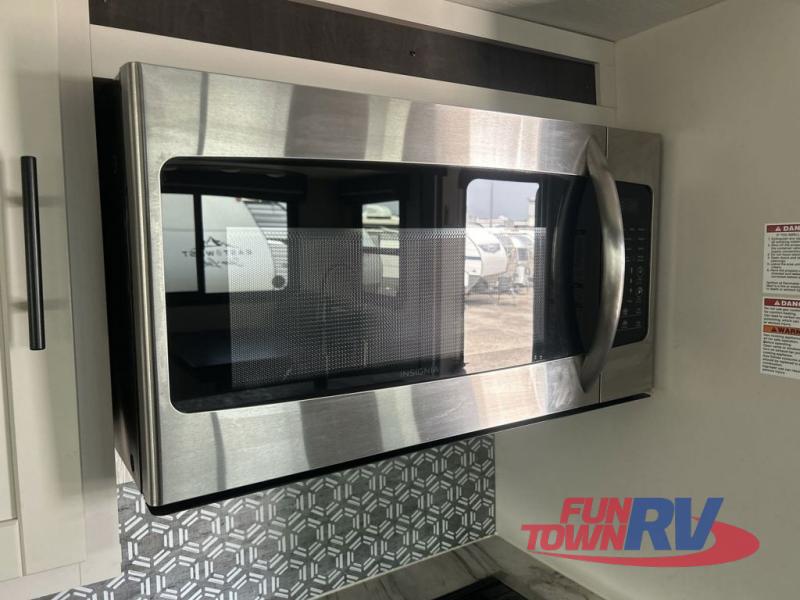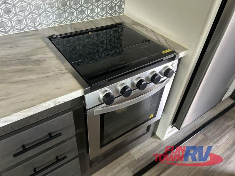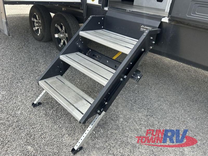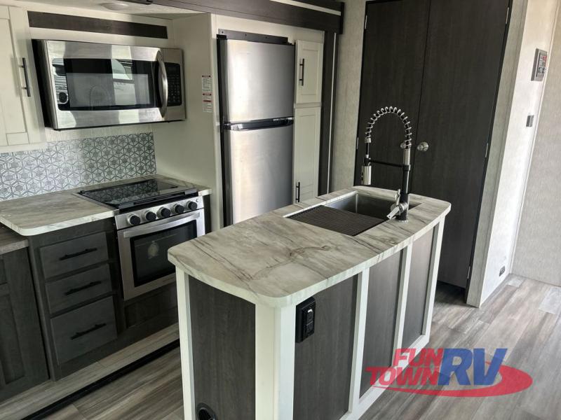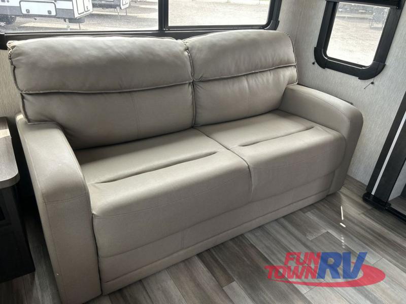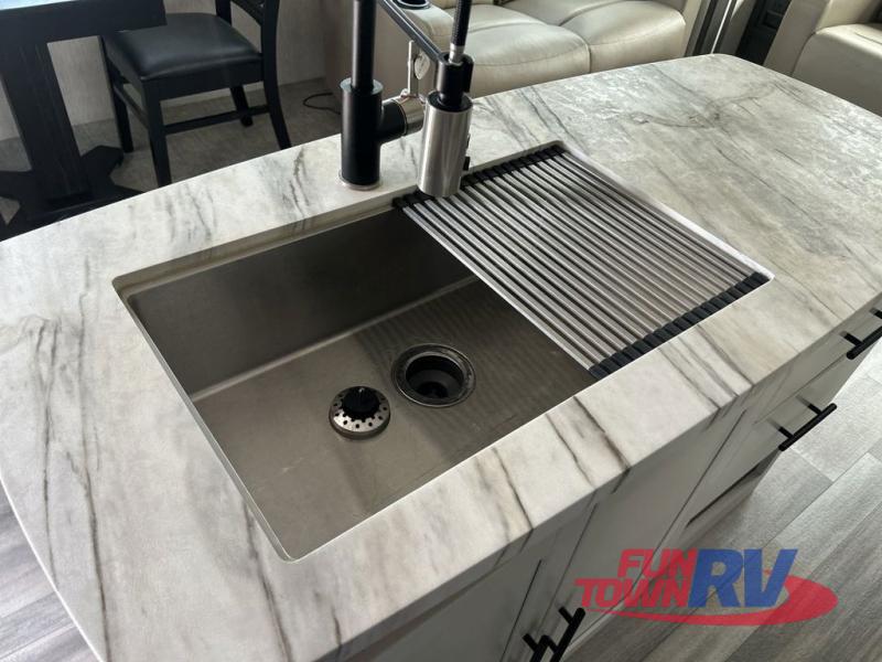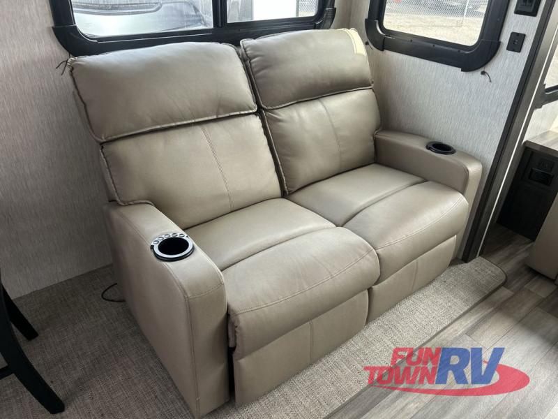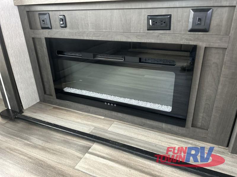 Enjoy the camping lifestyle as it should be; comfortable and convenient, with high-end features as a bonus touch! The dual opposing slides will create an open floorplan, and the kitchen island will bring the whole room together. Your crew will find seating space on the tri-fold sofa, the U-shaped dinette, and the theatre seats that have a great view of the 50" TV TV lift and fireplace. You will appreciate two pantries, with one pantry including space to add an optional washer and dryer to make wash day easier than ever. The full bath includes a 30" x 36" shower with a skylight for more standing space and natural light, and the front private bedroom will provide a great night's rest with its king bed!