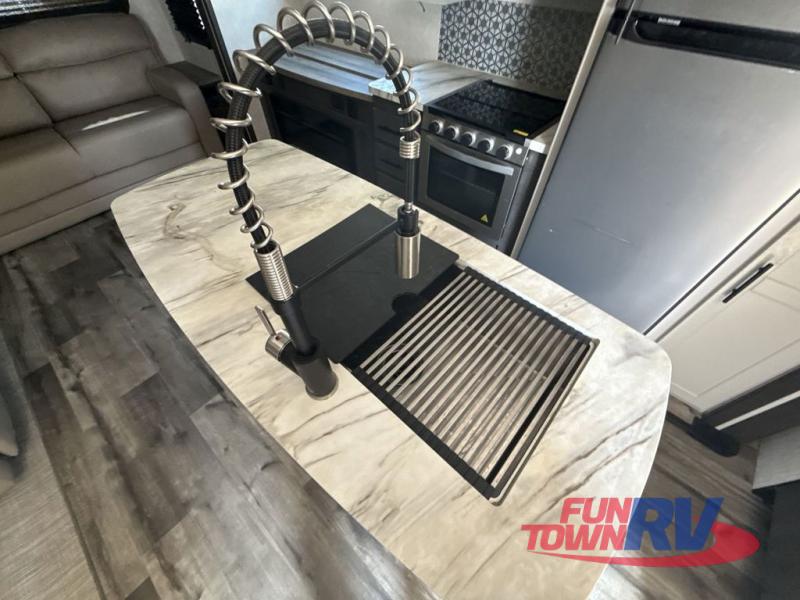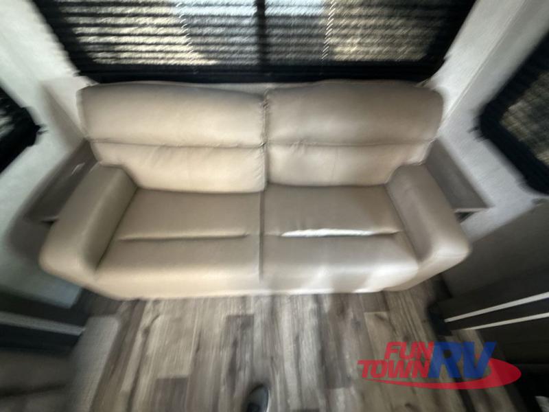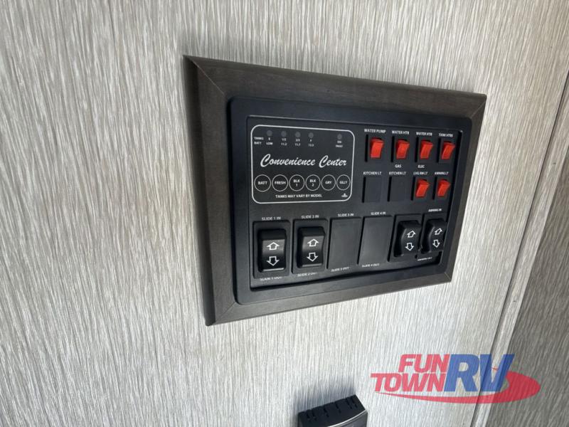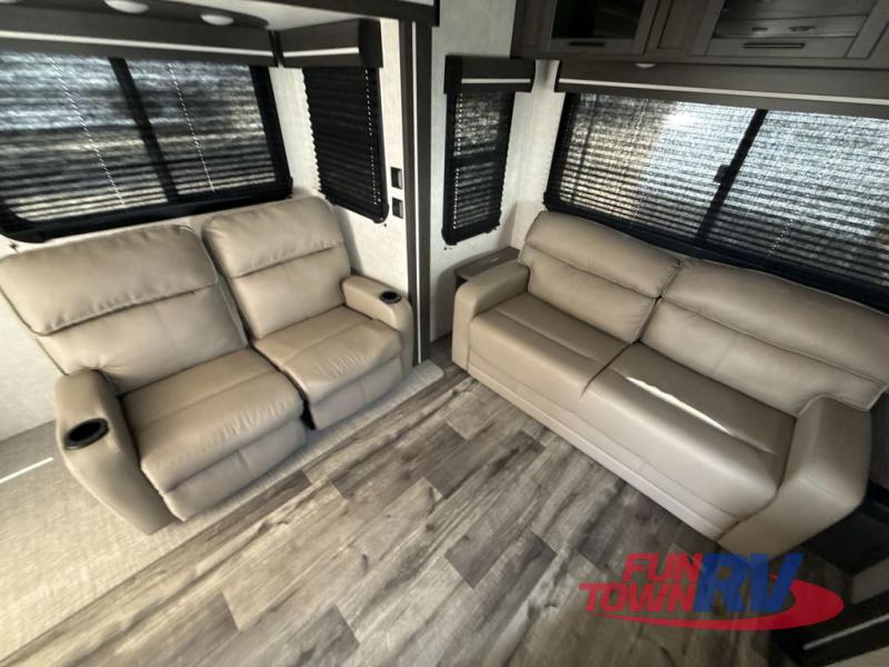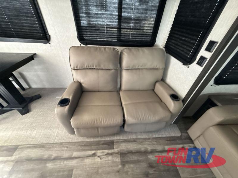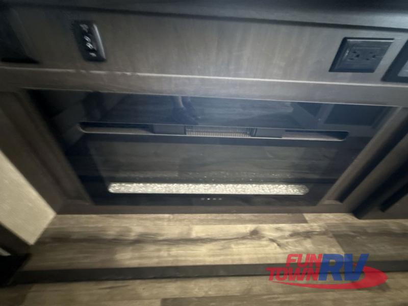 Enjoy the camping lifestyle as it should be; comfortable and convenient, with high-end features as a bonus touch! The dual opposing slides will create an open floorplan, and the kitchen island will bring the whole room together. Your crew will find seating space on the tri-fold sofa, the U-shaped dinette, and the theatre seats that have a great view of the 50" TV TV lift and fireplace. You will appreciate two pantries, with one pantry including space to add an optional washer and dryer to make wash day easier than ever. The full bath includes a 30" x 36" shower with a skylight for more standing space and natural light, and the front private bedroom will provide a great night's rest with its king bed!